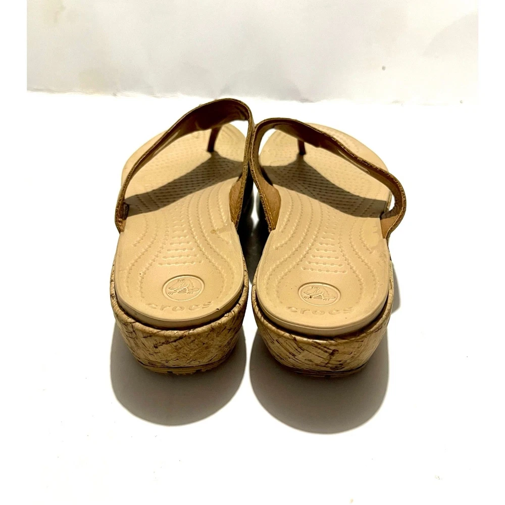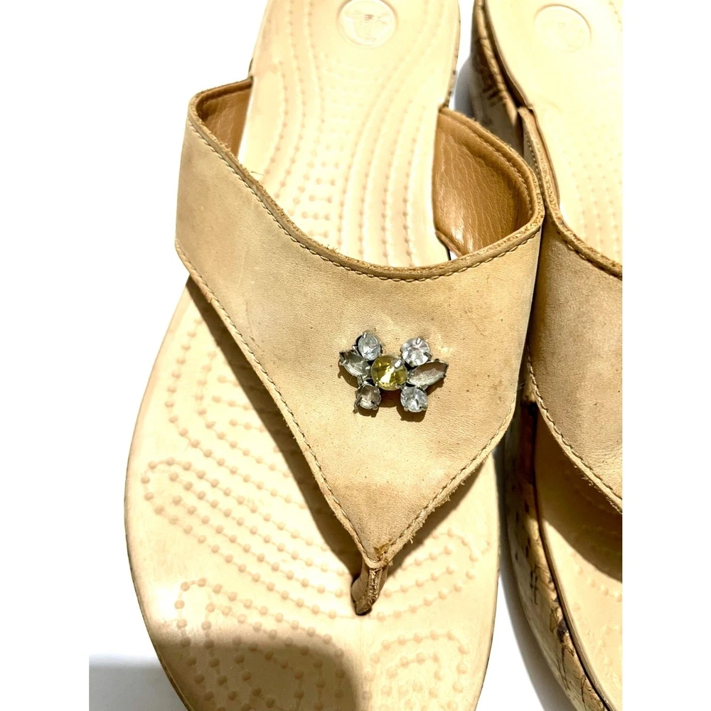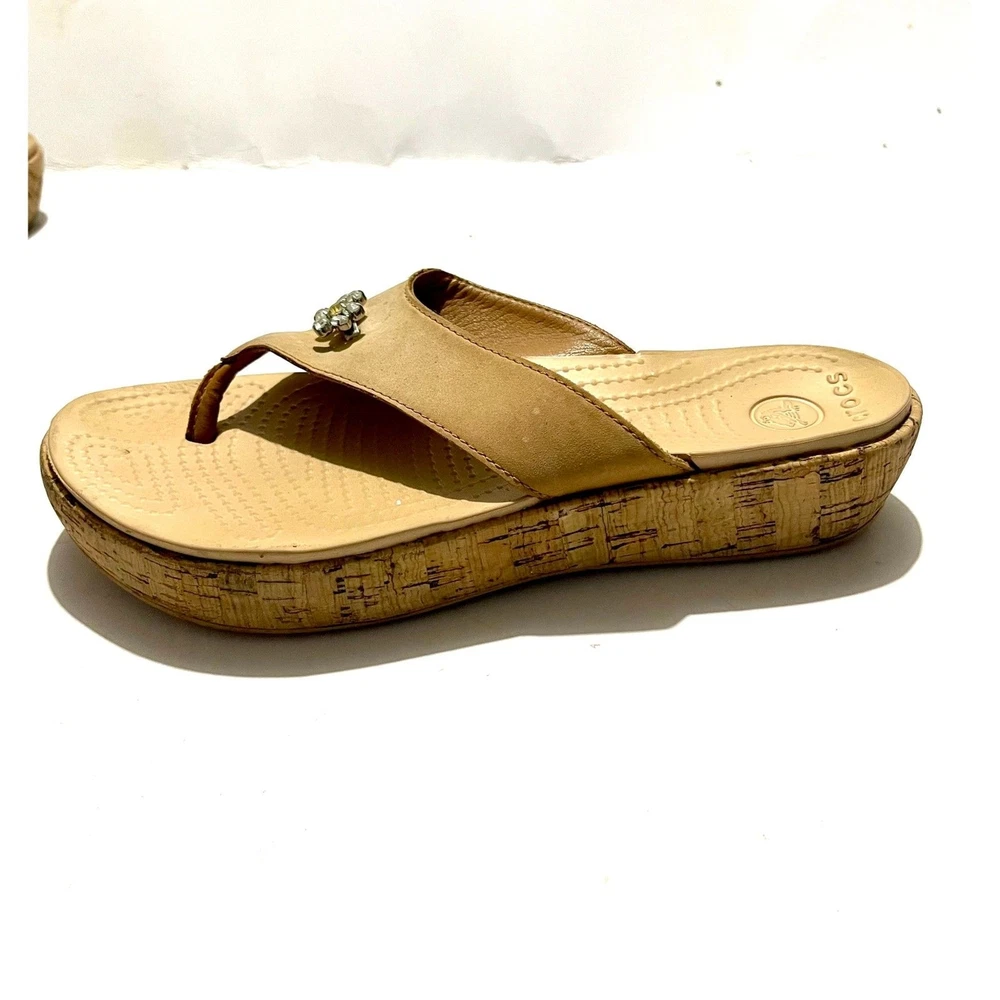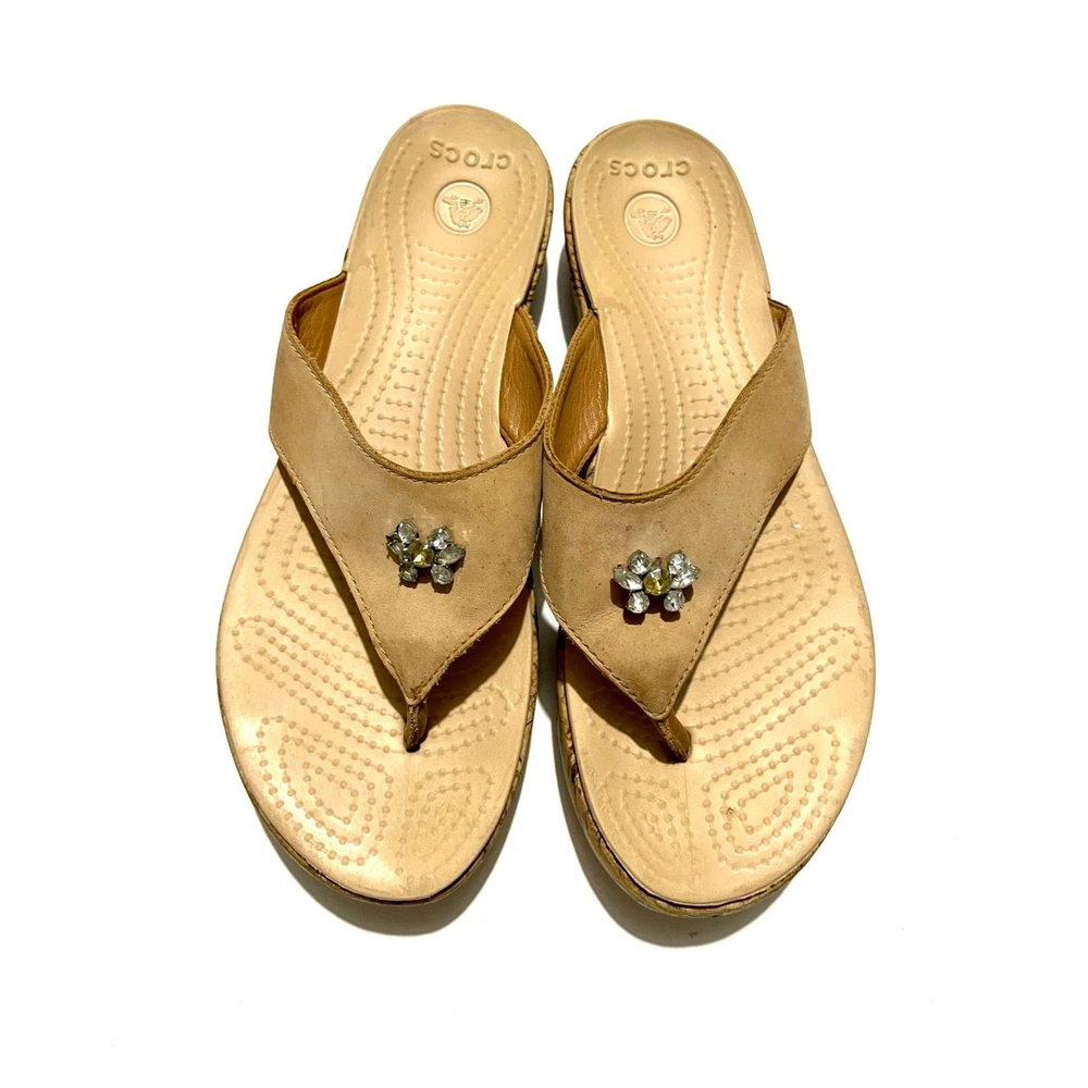 Crocs sandals slide on wedges comfort shoes beige summer women's 9 it has a couple stons missing in the flower. See the last pic