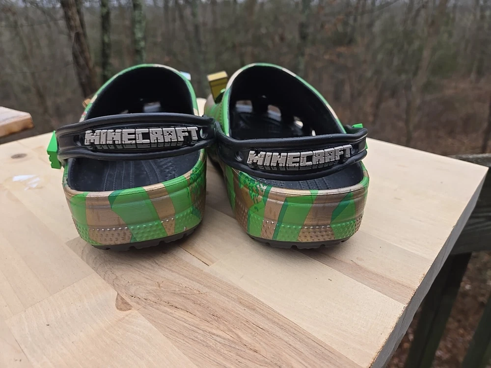 Elevate your casual shoe game with these Crocs x Minecraft Elevated Clogs in green. These limited edition clogs feature a camouflage pattern with Minecraft characters and ankle straps for a comfortable fit. The lightweight design makes them perfect for everyday wear, and the Crocs brand ensures durability. These shoes are customized and come with Jibbitz parts for added fun. They are perfect for casual occasions.