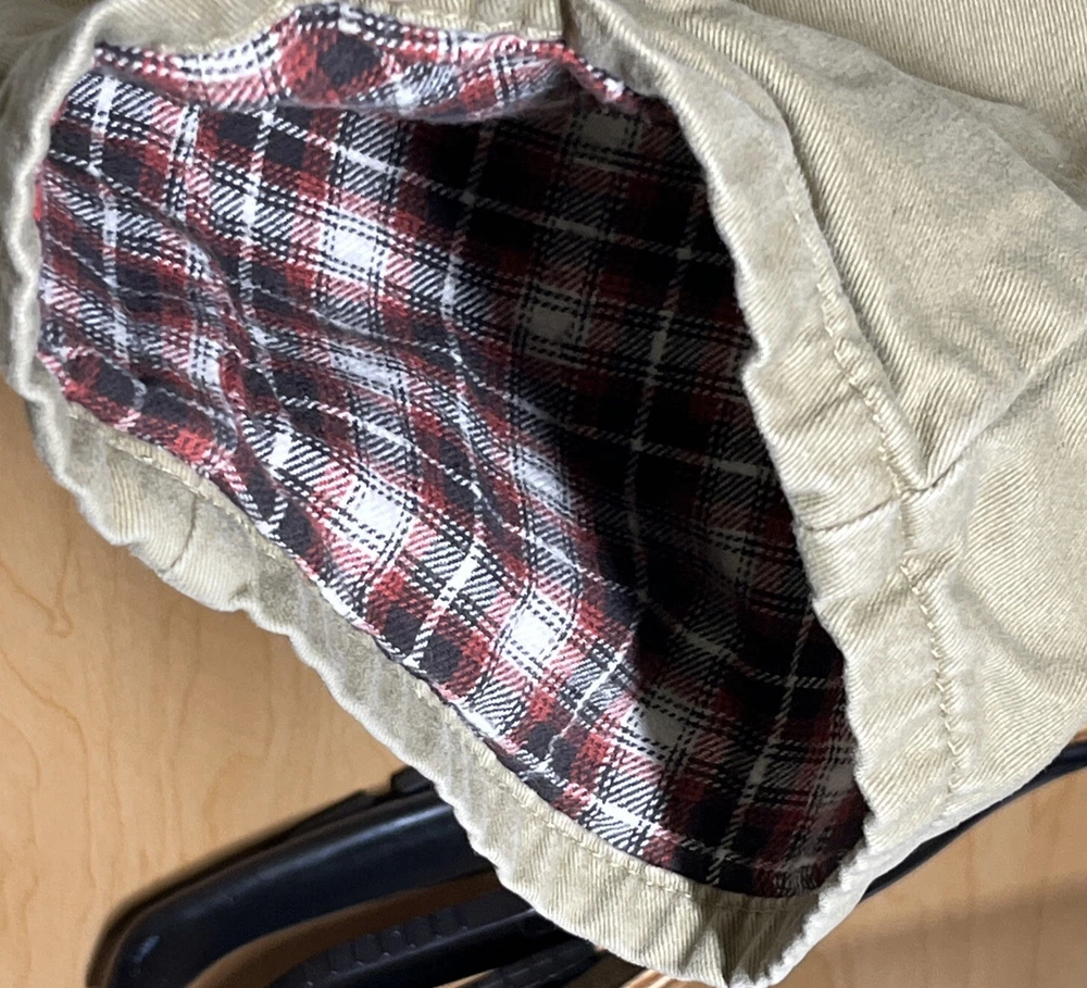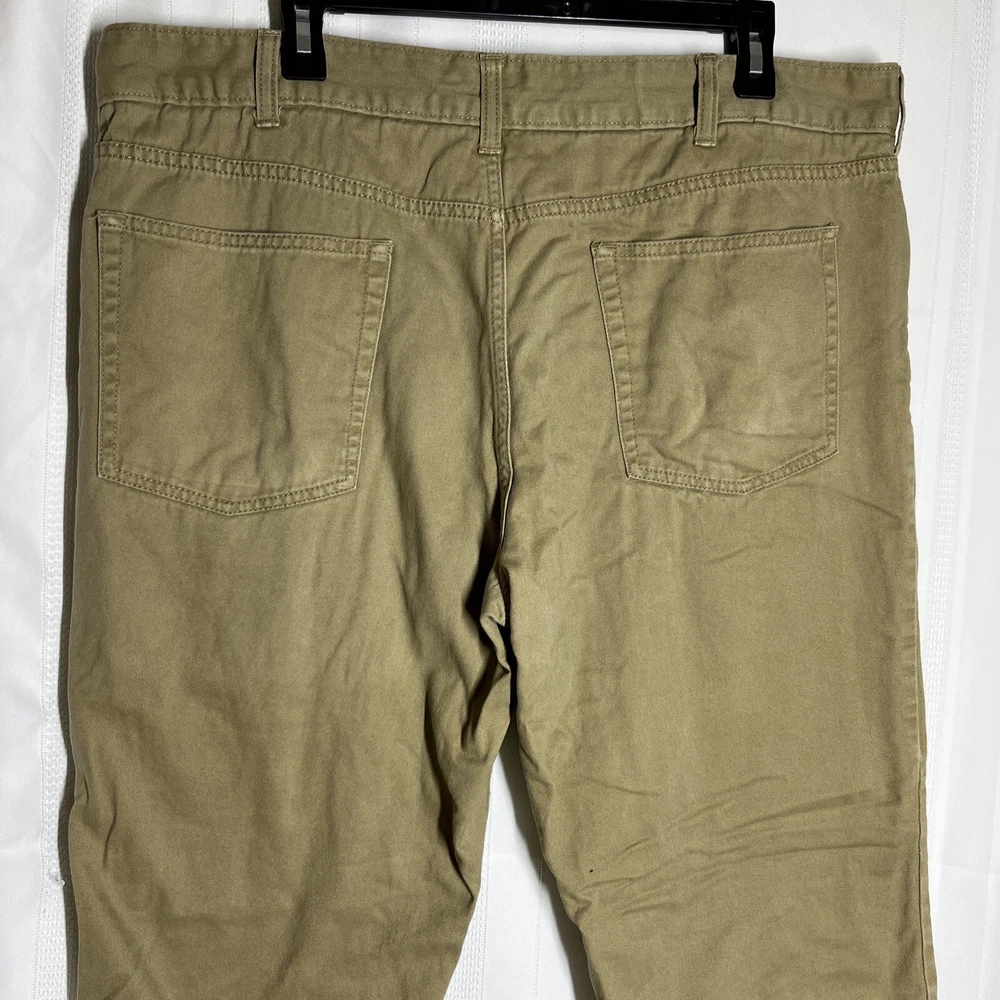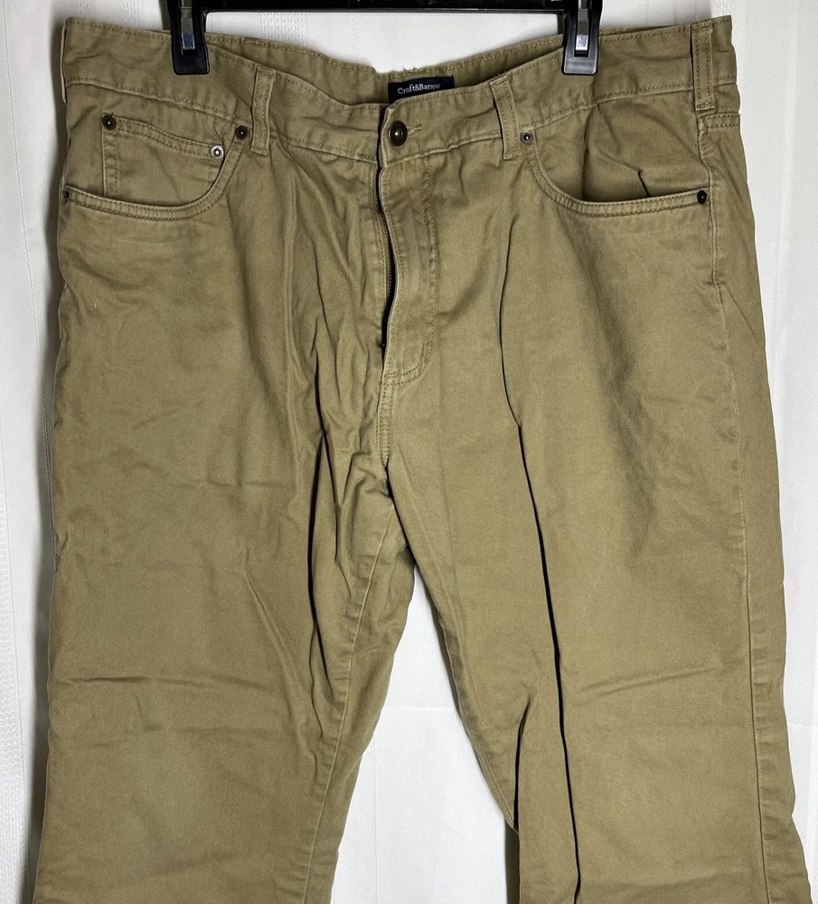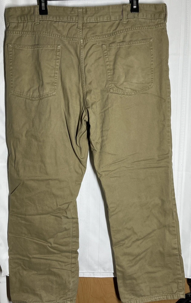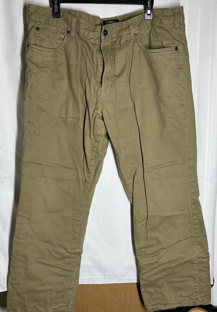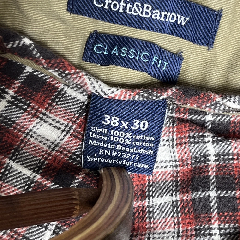 These pants are lined for extra warmth in cold weather. See pics. Elevate your wardrobe with these versatile Croft & Barrow chino pants. Perfect for any occasion, these pants feature a solid khaki color and a classic fit. The pants have a zip and button closure, as well as a 5-pocket design for ample storage space. Constructed from 100% cotton, these pants are machine washable for easy care. The pants also feature a flat front and straight leg style, with a waist size of 38 inches and an inseam of 30 inches. Ideal for winter, summer, fall, and spring, these chino pants are a must-have addition to any man's wardrobe.