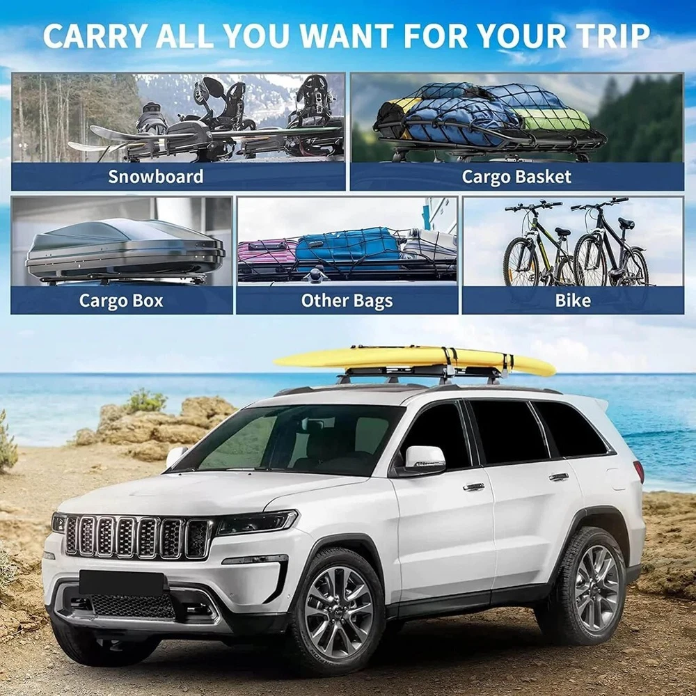 NEW IN (OPEN) BOX ~ YITAMOTOR 2011-2021 JeepGrand Cherokee Cross Bars Roof Racks Aluminum Roof Rail Luggage Carrier Bar Retail Price: $125! SKU: YZ1001W007 DESCRIPTION: YITAMOTOR specializes in the production of automotive partsand has been doing this for many years. We offer a wide range of auto partsproduction lines for your car, SUV, van, or truck. Our goal is to provide ourcustomers with reliable advice and real-world solutions for repairing andreplacing automotive parts. We pride ourselves on providing quality automotiveparts. FITMENT: 2011-2021 Jeep Grand Cherokee, vehicles with CHROME SIDERAILS (GROOVED SIDE RAILS) Professional installation would be highly recommended. FEATURES: The front crossbar is a little longer than the rear one toaccommodate vehicle size. Streamline appearance with anti-theft lock design, mountedon the side rails. The perfect solution to hold luggage, cargo, and snowboardon the roof when going on a trip. The special T-slot design, helps you carry your luggage,boxes, bikes, snowboards, kayaks, and canoes easily. Easy to install & dismantle in minutes with theinstallation guide. No drilling is necessary. INSTALLATION MANUAL: Slightly open the crossbar cover. Remove the pre-assembled screw from the bar. Attach the two crossbars onto the rail. The front crossbaris a little longer than the rear one. Secure the crossbars. Press down on the crossbar cover. NOTE: 1. Please check that this product fits your vehicle beforeinstalling it.NOT Fit Altitude and SRT models 2. The Front crossbar is longer than the Rear one to fitthe vehicle, and there are no labels in it, please check before install. 3. Check the roof rack cross bar mounting bolts frequentlyand re-tighten them if necessary. 4. Distribute the weight of the cargo evenly, and do notexceed the maximum weight capacity of 150 lbs(68kg). Brand: YITAMOTOR Max Load Capacity: 150 LBS (68 KG) Color: Black Front Cross Bar Length: Approx 46.5"/1181MM Rear Cross Bar Length: Approx 46"/1168MM Height: 93MM Special Features: Anti-Theft Lock, Waterproof Material: High-grade Aluminum Package Includes: 2 roof rack cross bars; 1 installationguide; Accessories as the picture shown