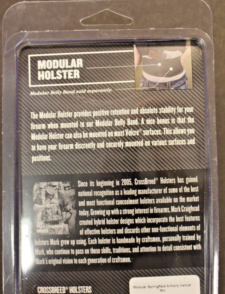This is a holster shell that fits the Springfield Hellcat and is setup for a right handed draw. This is not a belt mounted holster. This holster is designed to be used with other CrossBreed products. I have included the manufacturer description so you can find a compatible product that will suit your needs. The packaging indicates that this holster may be used on most Velcro surfaces. Manufacturer Description: The CrossBreed Modular Holster is a versatile, multi-use holster that can be used alone on anything equipped with Hook fastener or along with one of the CrossBreed Products below: -Purse Defender -Belly Band 2.0 -Pac Mat -Bedside Backup Backed by military-grade hook fastener, this holster attaches to the item of your choice for an incredibly stable hold. The holster can be removed to be repositioned or moved from one item to another depending on your carry needs that day.