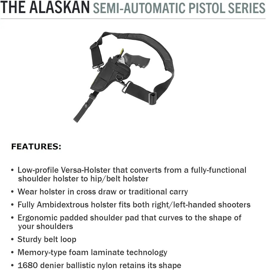 CROSSFIRE THE ALASKAN LOW PROFILE HIP/BELT OR SHOULDER CARRY PISTOL HOLSTER - AMBIDEXTROUS: The Alaskan is a low-profile Versa-Holster that converts from a hip/belt holster system to a fully-functional shoulder holster system. The Alaskan is also a fully ambidextrous holster that can work as a crossdraw or traditional carry configuration. Constructed of 1680 Denier ballistic nylon for enhanced durability, this hip/shoulder carry holster boasts a memory foam laminate technology that molds to the gun making this extremely comfortable to wear. FEATURES: - Low-profile Versa-Holster that converts from a fully functional shoulder holster to a hip/belt holster; - Switch between hip & shoulder carry; - Fully ambidextrous - holster fits left and right-handed shooters; - Wear holster in cross draw or traditional carry; - Ergonomic padded shoulder pad that curves to the shape of your shoulders; - Sturdy belt loop; - "Speed-Retainer" system for extremely fast access to the gun; - Memory-type foam laminate technology molds to the gun providing a custom fit; - Durable 1680 denier Ballistic Nylon retains its shape