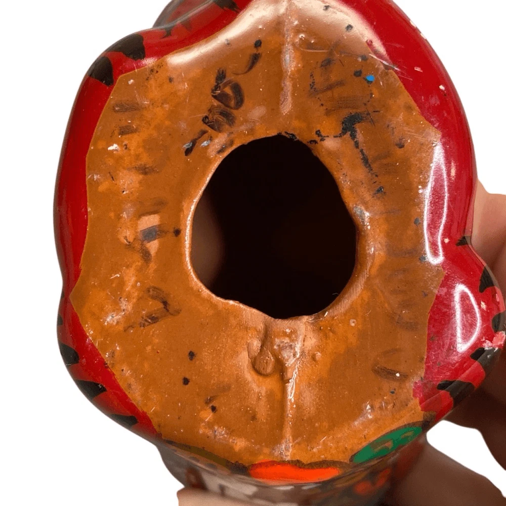 Crouching Mexican Folk Art Red Clay Tonala Cat Whimsical Hand Painted This beautiful handcrafted cat figurine is a stunning example of Mexican folk art. Made from red clay using traditional techniques, it features intricate details that showcase the rich culture of Tonala. No chips or cracks noted. Measures approximately 3.5” tall x 2.25” wide x 4” long.