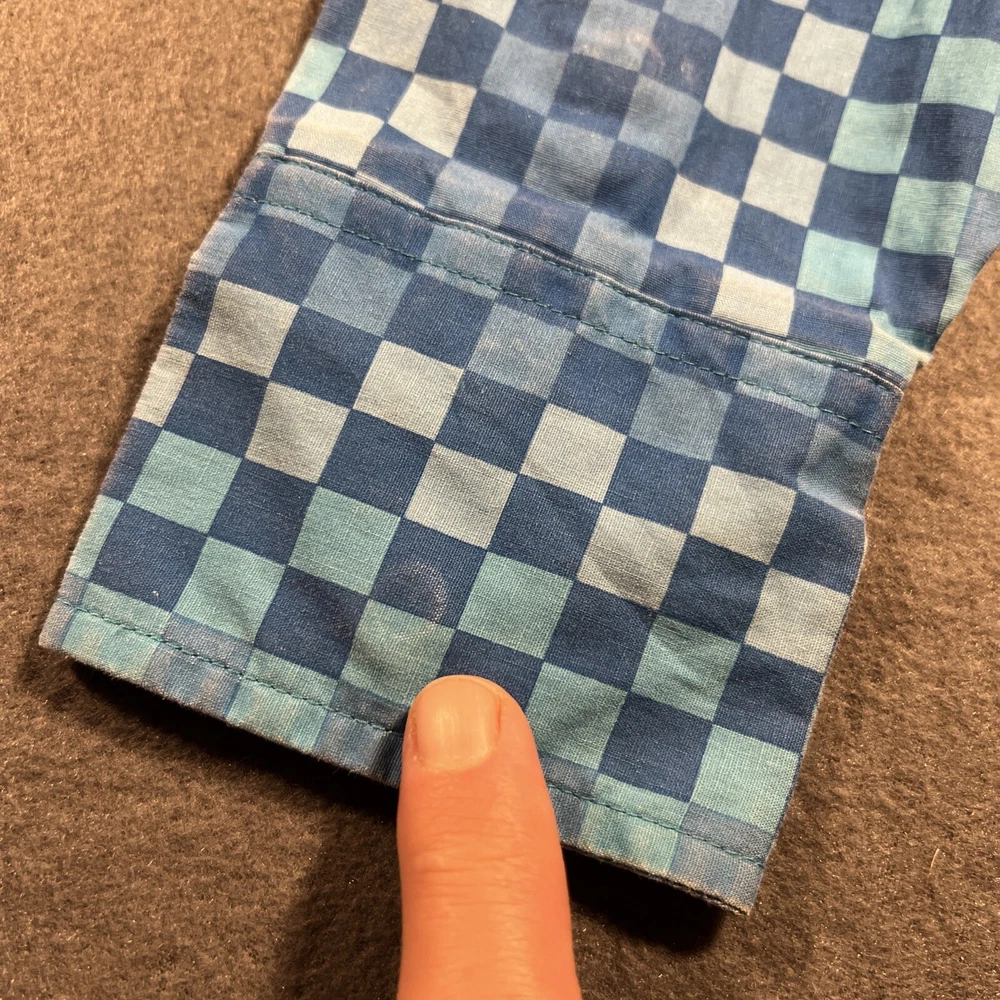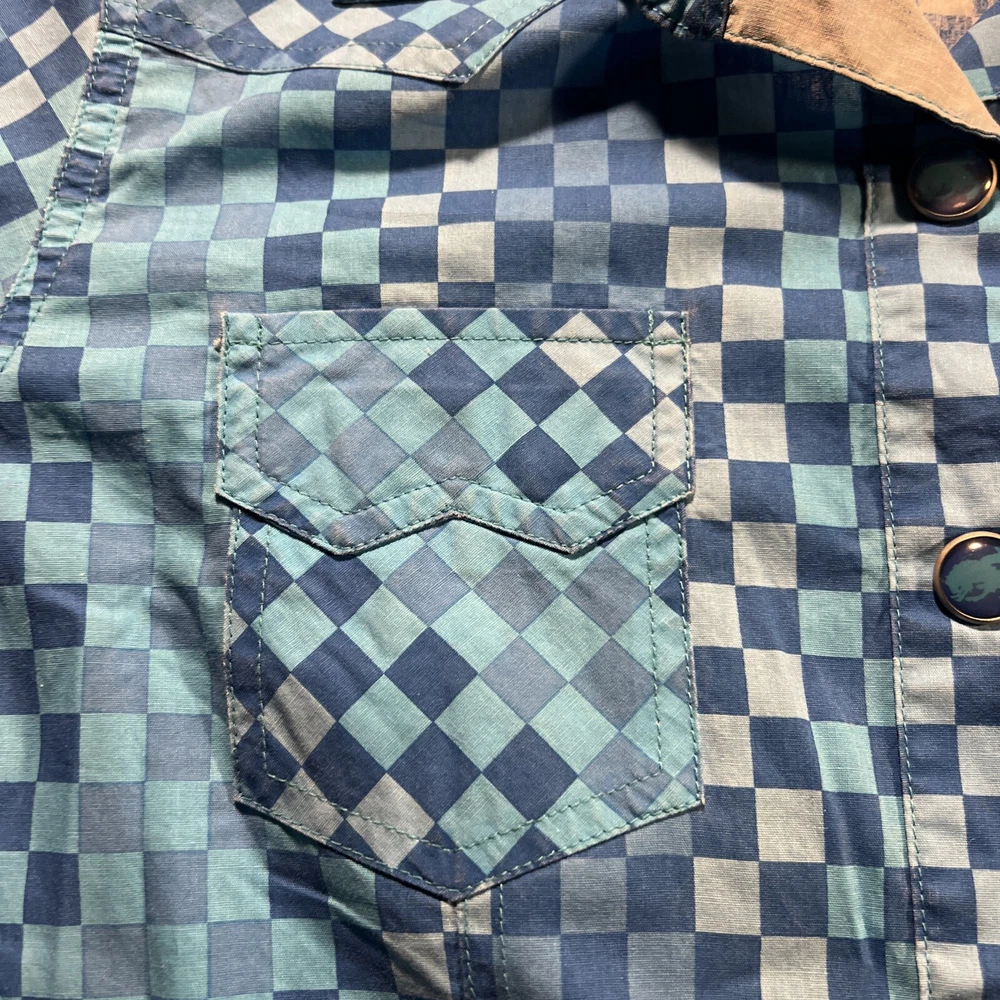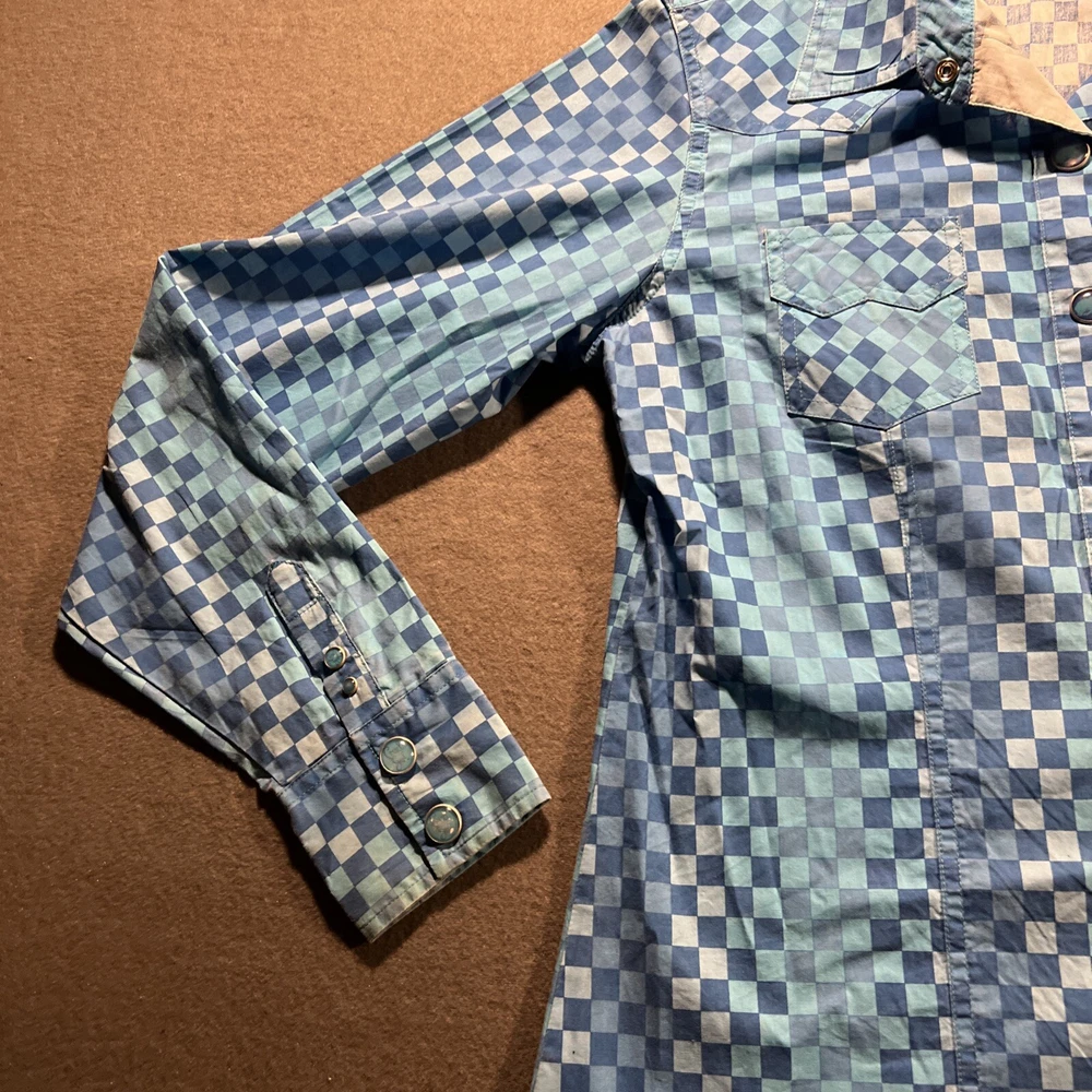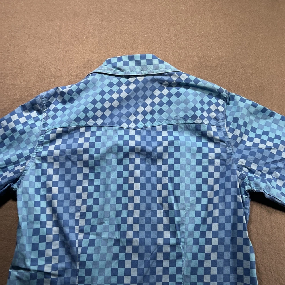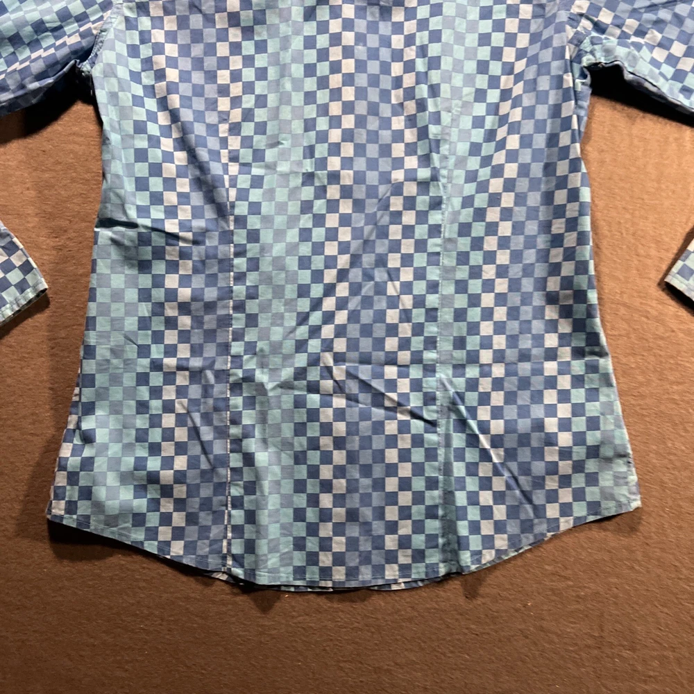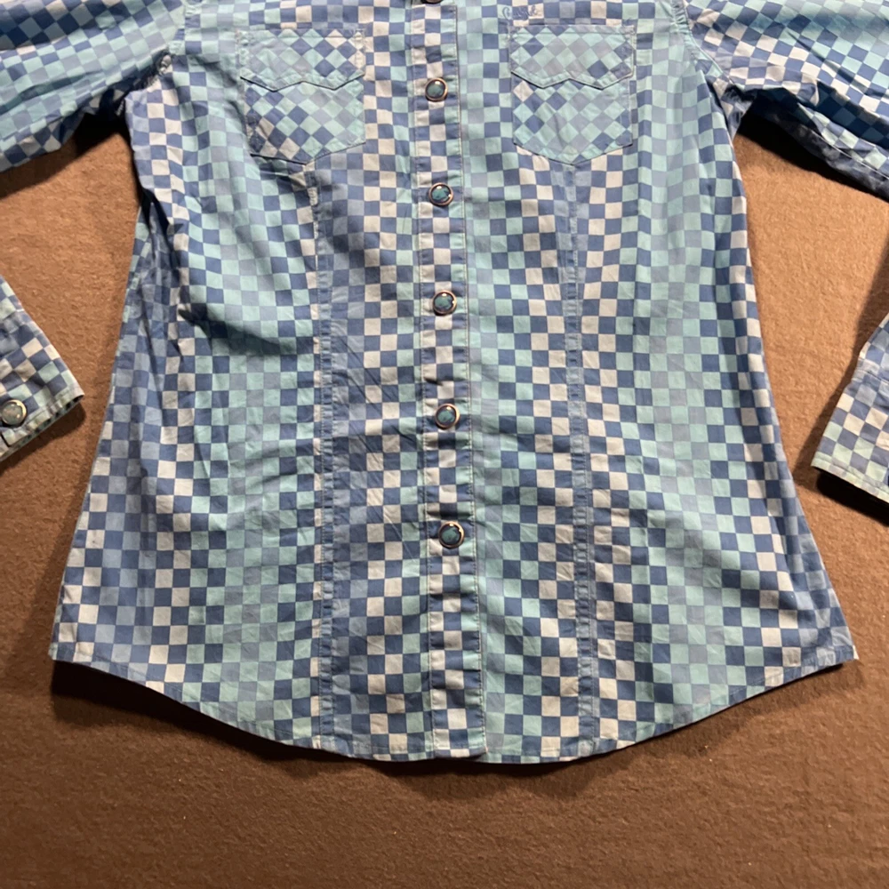 *Please review all photos closely before purchasing due to shirt having mild signs of use and wear and right back sleeve having several faint color fade areas from washing/use to prevent return.* Elevate your wardrobe with this stunning Cruel Girl shirt in a beautiful shade of blue. The shirt features a collared neckline with plaid pattern and pearl snap closure, perfect for any occasion from casual to formal. Made of 100% cotton, this shirt is machine washable and has a regular fit. The long sleeve shirt has a woven fabric type and comes in a women's size medium. It has accents of the brand's logo and features a slimming, easy care, lightweight, stretch, and all-season design. It also has pockets and is wrinkle-resistant, making it the perfect travel companion. This shirt is suitable for any season, whether it's winter, summer, fall, or spring. Add this elegant and bohemian shirt to your collection today! Rodeo Horse Back Riding Cowgirl Ranch Rancher Farm Farmer Barrel Racing Pole Bending Church Wear Dress Up Pearl Snap Shirt Collection Country Western Wear Checkered Plaid