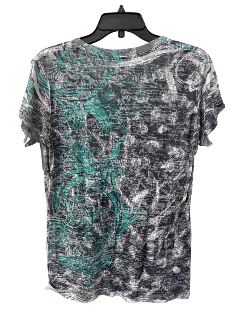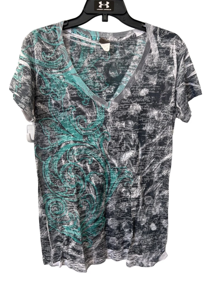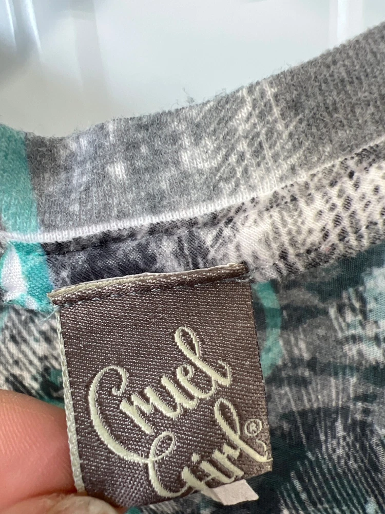 Cruel Girl V Neck Graphic Tee Size 2XL Gray Teal Abstract Grunge Goth Streetwear This Cruel Girl T-shirt features an abstract design in gray and teal. The V-neck and short sleeves offer a relaxed fit, while the cotton blend ensures comfort throughout wear. • V-neck style • Short sleeves • Abstract design • Comfortable cotton blend • Relaxed fit • Cotton Tag partially worn, illegible in parts. No visible condition flaws on the fabric. Chest = 21 inches, Length = 28 inches. grunge goth gothic emo punk modern basic tee t-shirt trendy essentials retro classic contemporary fashion stylish daily errands everyday outfit fashionista Saturday Sunday travel vacation summer spring everyday comfortable relaxed weekend outfit work errands lounge comfy streetwear