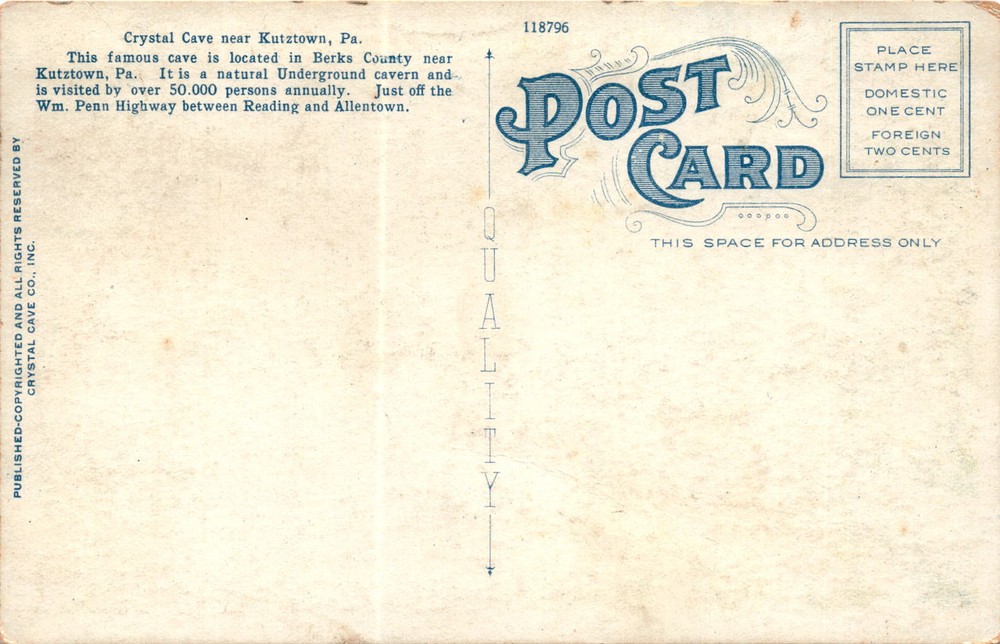 MAKE AN OFFER. THE MORE YOU BUY THE BETTER DEAL I WILL ACCEPT Crystal Cave is a famous underground cavern located near Kutztown, Pennsylvania in Berks County. It is a natural wonder that attracts over 50,000 visitors annually. The cave features stunning crystal formations and a walk leading through its chambers. Crystal Cave is situated just off the William Penn Highway between Reading and Allentown.