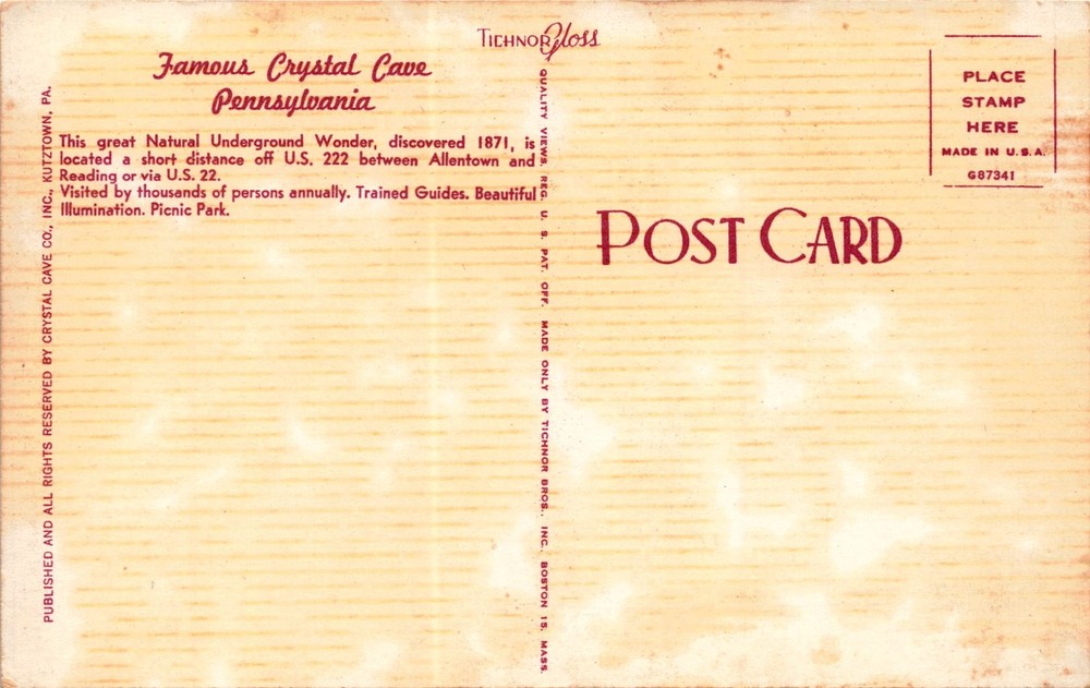 The postcard is promoting the famous Crystal Cave in Pennsylvania, discovered in 1871. The cave is located near U.S. 222 between Allentown and Reading, or via U.S. 22. It is a natural underground wonder that attracts thousands of visitors annually. The cave offers trained guides, beautiful illumination, and a picnic park for visitors to enjoy.