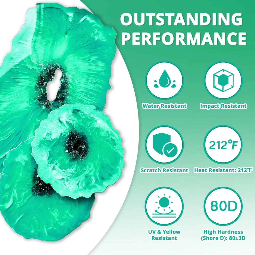 ใ๐๐ฎ๐๐๐ฅ๐-๐ ๐ซ๐๐ & ๐๐๐ฅ๐-๐๐๐ฏ๐๐ฅ๐ข๐ง๐ ๐๐ซ๐ข๐ฅ๐ฅ๐ข๐๐ง๐๐ใ: With our own R&D and manufacturing team - the innovative self-leveling technology automatically releases residual air bubbles and unevenness to ensure a perfectly smooth surface, and you will have a crystal clear, glassy smooth, bubble-free surface. Widely used in DIY crafts, jewelry, candlesticks, lamps, table tops, coatings, trays, bar tops, castings, woodwork, ornaments, coasters, and other resin artworks ใ๐๐ซ๐ฒ๐ฌ๐ญ๐๐ฅ ๐๐ฅ๐๐๐ซ ๐๐ข๐ ๐ก ๐๐ฅ๐จ๐ฌ๐ฌ ๐ ๐ข๐ง๐ข๐ฌ๐กใ: We have added UV stabilizers + HALS (Hindered Amine Light Stabilizers), which can effectively resist UV and yellowing to ensure that the artwork has an ultra-clear, beautiful, high gloss appearance, while it is scratch and impact resistant, water and moisture resistant, and easy to clean, so that your artwork will be color stable and vibrant for a long period, and will shine like never before ใ๐๐๐ฌ๐ฒ ๐๐จ ๐๐ฉ๐๐ซ๐๐ญ๐ใ: Ensure the resin and hardener are mixed thoroughly at a 1:1 volume ratio. Work at room temperature 75-85ยฐF for up to 30-40 minutes with a 24-hour cure time to create your best artwork!!! ๐๐๐๐ ๐๐๐๐๐ resin epoxy with a heat resistance of up to 212ยฐF and a hardness of up to 83D prevents scratches and protects your artwork, making it as hard as diamond ใ๐๐๐๐ ๐๐จ ๐๐ฌ๐ใ: FOOD SAFE Epoxy Resin - Made from premium raw materials and a safe, non-toxic formula that is No VOCs, solvent-free, BPA-free, non-flammable, non-irritating, and odorless, ensuring that the resin crafts meet the highest safety and performance standards, are safe for food contact and safe for indoor and outdoor use. Beginners can conduct a small amount of testing before work๏ผ which is very user-friendly for both beginners and professionals ใ๐๐ฎ๐ฉ๐๐ซ ๐๐๐ฅ๐ฎ๐ ๐๐ฉ๐จ๐ฑ๐ฒ ๐๐๐ฌ๐ข๐ง ๐๐ข๐ญใ: Our ๐๐๐๐ ๐๐๐๐๐ Epoxy Resin Kits Included: 1x 16 oz crystal clear epoxy resin, 1x 16 oz crystal clear hardener, 2x disposable gloves, 2x 30 ml measuring cups, 4x stirring sticks, 2x beak covers, 1x user guide. The perfect mix of everything needed to help you easily make epoxy resin Artcraft, experience the fun of resin handmade DIY making, and hurry up to create your unique artwork ใ๐๐ข๐ฉ ๐ ๐จ๐ซ ๐๐ฅ๐๐๐ง๐ข๐ง๐ ๐๐๐๐ฌ๐ฎ๐ซ๐ข๐ง๐ ๐๐ฎ๐ฉใ: The cup must be cleaned immediately after use, otherwise the cup will not be cleaned thoroughly. Use a solvent like isopropyl alcohol (rubbing alcohol) or acetone to clean it, for stubborn spots, pour a small amount of alcohol into the cup and let it sit for a few minutes before scrubbing, use a stiff-bristled brush / sponge / cloth to wash the inside of the cup. After scrubbing, rinse the cup thoroughly with warm water / warm soapy water to remove any remaining solvent and resin residues