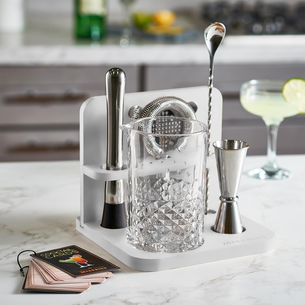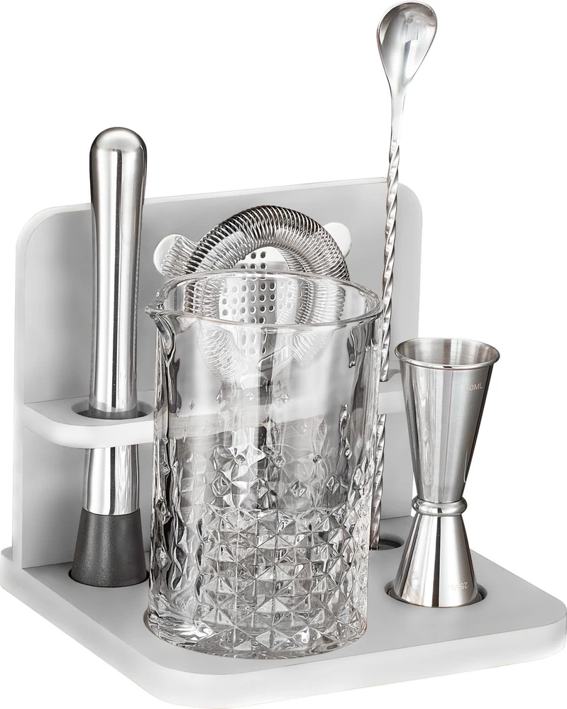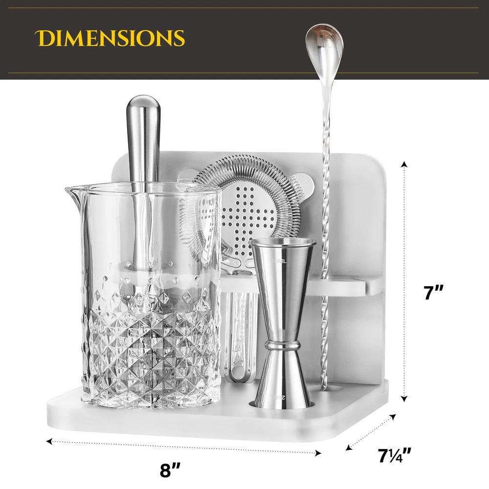 Crystal Cocktail Mixing Glass Set with Bamboo Stand - 22 Oz 650ml - Thick and Sturdy Bottom, Durable and Seamless Design with Bar Accessories IMPRESS YOUR GUESTS WITH STYLE: Mixing Glass features an etched diamond pattern and looks stunning in any bar. This classic ultra-clear mixing glass is an elegant and practical solution when you need to stir your cocktail instead of shaking it. SUPERIOR SEAMLESS DESIGN - The lead-free glass is handcrafted to avoid cracking like cheap machine-made mixing glasses. Its thick walls provide better insulation, and its capacity (22 Oz) makes it perfect for home bartenders to serve drinks to friends and family. DIAMOND PATTERN : The beautifully etched diamond pattern makes mixing easier, while the weighted base gives the glass more stability and balance. With both of these features combined, you can mix and pour cocktails with greater ease. STAND FOR BAR TOOLS: This unique bar tool holder features design dents and wood partitions, making it thick, stable, and solid PREMIUM STAINLESS STEEL BARWARE: A bar muddler, mixing spoon, double jigger, strainer and recipe card set complete the mixing process. Our bar essentials are practical, elegant, and durable. All are made of heavy gauge stainless steel with high end finishes. Home bartenders will love this cocktail kit!