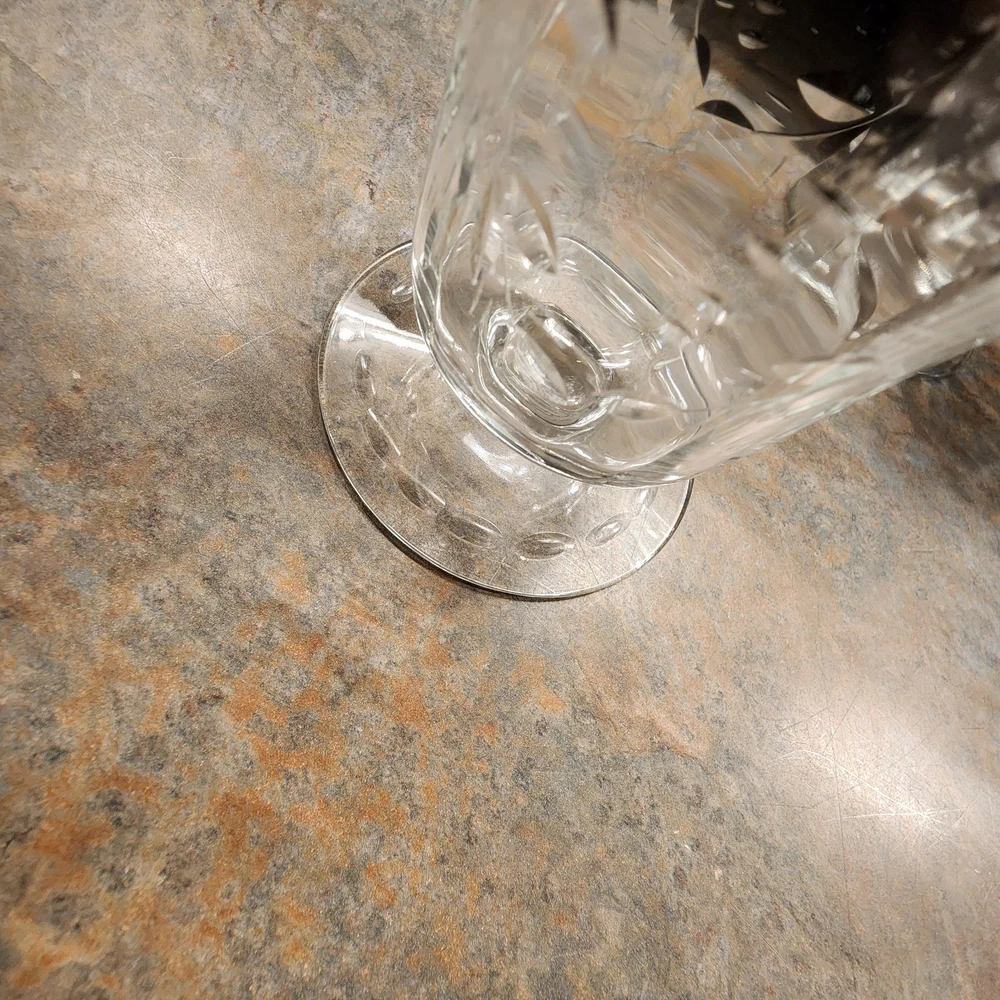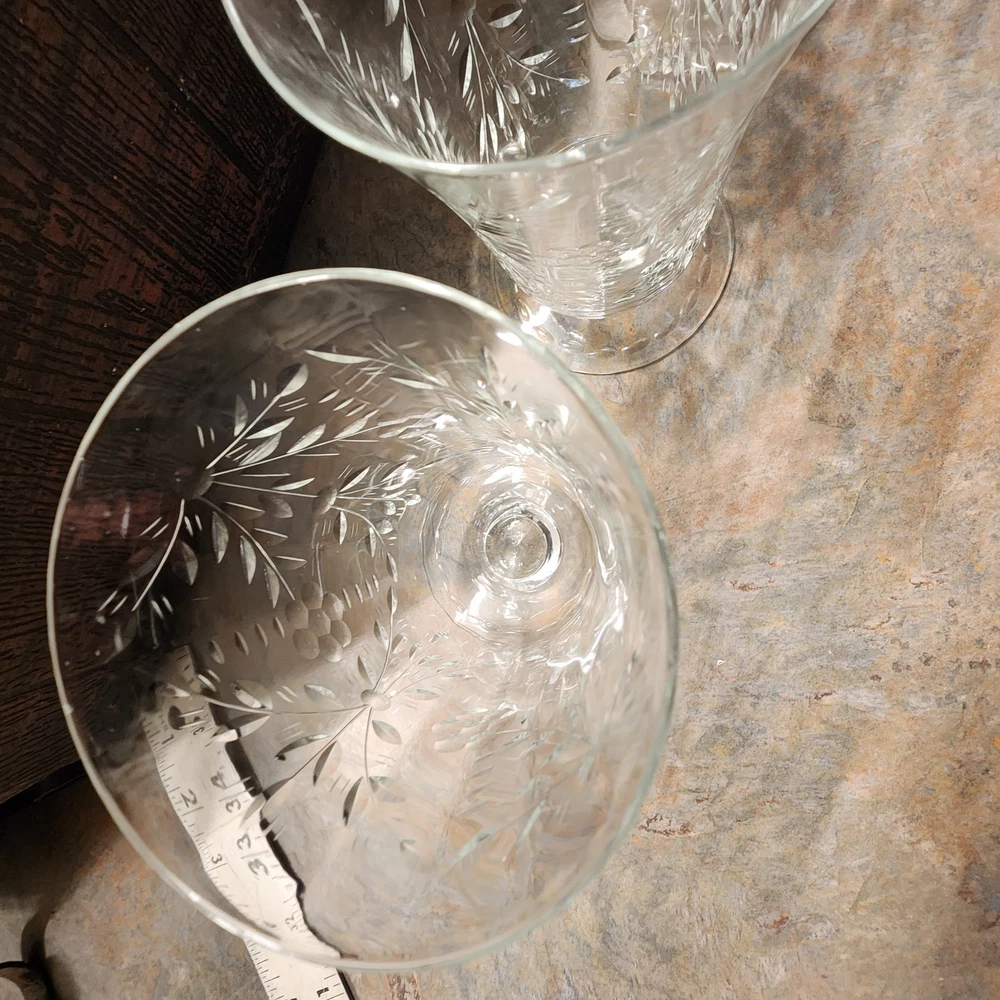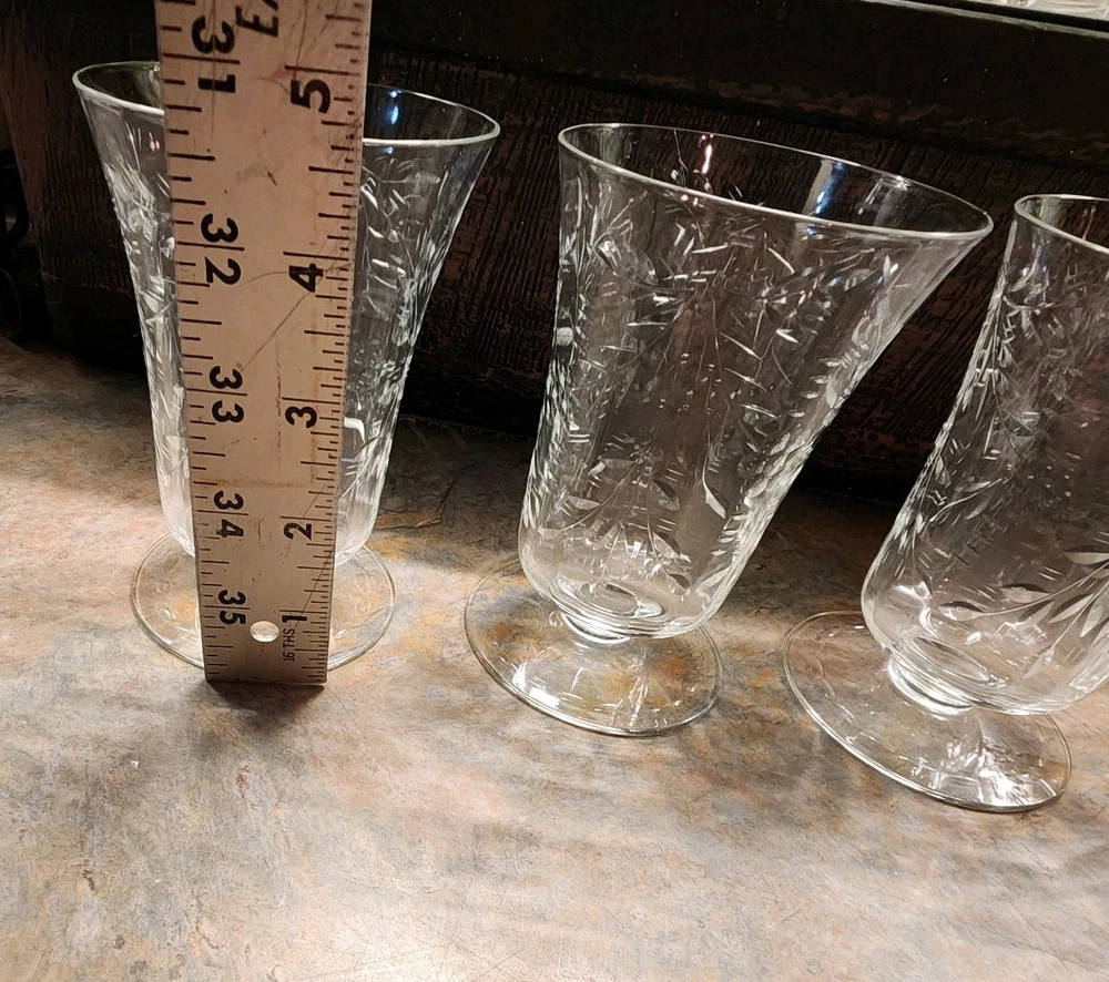 Elevate your table setting with this set of four vintage cordial glasses. Made of crystal, these glasses feature exquisite etched patterns with a floral theme. The glasses stand at 4 3/4 inches tall and are perfect for all occasions. The clear color of the crystal allows the intricate designs to shine through, making them a great addition to any drinkware collection. These glasses are a perfect representation of cut glass production style. They are a great addition to any vintage collection. Use them to serve juice or any other drink that you think will complement their beauty.