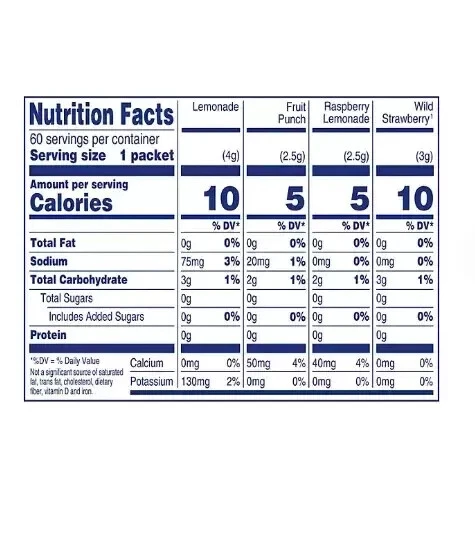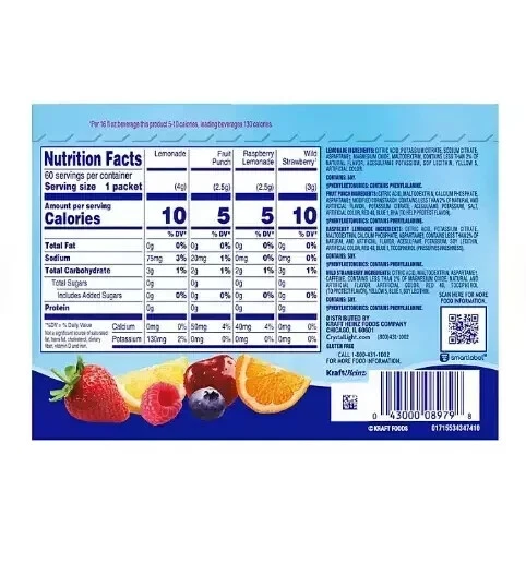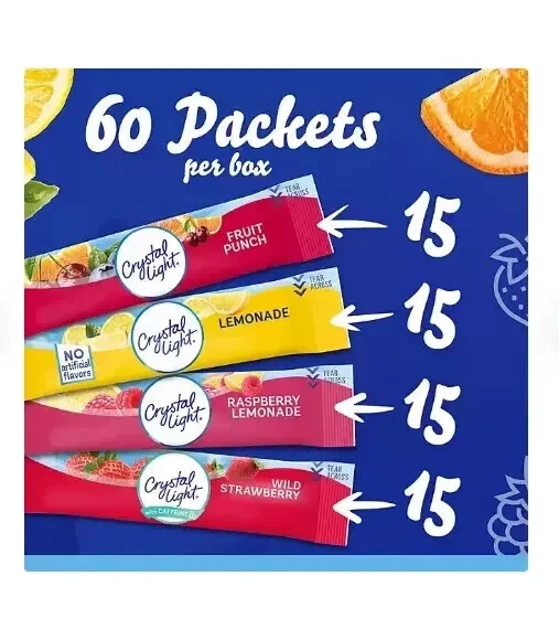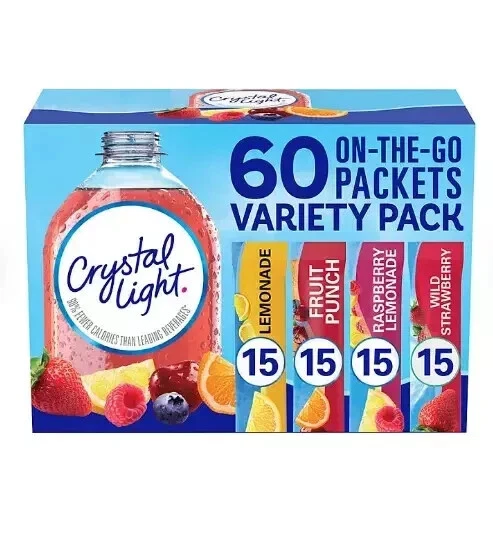 About this item Brand Toozoon Item Form Tablet Package Information Box Special Ingredients sugar flavors Package Weight 0.24 Kilograms A variety pack of 60 Crystal Light Powdered Drink Mix Singles Variety Pack includes 15 packets of each fruity flavor lemonade, fruit punch, raspberry lemonade, wild strawberry To prepare, simply empty one packet into a 16.9 oz. bottle or empty one packet into tall glass and add 2 cups of water and shake or stir to combine ZERO-SUGAR & LOW CALORIE – With each packet of lemonade drink mix containing absolutely zero grams of sugar and only 5 or 10 calories per serving Surprise your loved ones with a gift or just perfect for you Rank (BSR): #