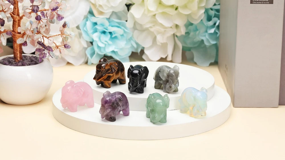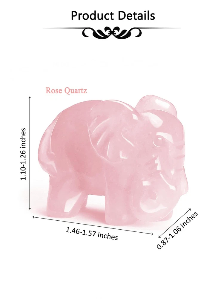 CrystalTears Rose Quartz Healing Crystal Elephant Figurine Carved Crystals Gemstone Elephant Statue Ornament for Home Desk Decor Good Luck Elephant Gifts for Women Men Christmas 1.6” Product Details Color: Rose Quartz Brand: CrystalTears MPN: FPUS0004691 UPC: Does not apply EAN: Does not apply Package Dimensions: 2.95 x 2.95 x 1.38 inches Item Weight: 1.23 ounces Manufacturer: CrystalTears Country of Origin: China Date First Available: September 23, 2024 Healing Crystal Elephant Figurine: hand carved crystal gemstone elephant figurine is made of natural healing crystal stone, perfect for placing in home, office, desk, bedroom, living room, meditation space and shelves decor, help to enhance the flow of positive energy, create a harmonious atmosphere, helps to relief anxiety, stress, bring inner peace fortune,and endless positive energy Crystal Elephant Gifts: elephant is a symbol of wisdom, luck, loyalty, prosperity and long life, The elephant is considered as good luck amulet, keep a lucky elephant with you to protect from bad luck and to stimulate good luck for all times. Perfect gifts for women, men, cat lover, cat mum/dad gifts, friends, families on birthday, Christmas, Valentines day, Mothers day, brings protection, happiness and good luck to your loved Rose Quartz Crystal: rose quartz elephant statue is made of natural rose quartz crystal, rose quartz is the stone of universal love. It restores trust and harmony in relationships, encouraging unconditional love. Rose Quartz purifies and opens the heart at all levels to promote love, self-love, friendship, deep inner healing and feelings of peace Specifications: crystal elephant figurine size: 3.8x2.3x3cm/1.57x0.87x1.26 inches; Material: rose quartz crystal stone; Weight: 35g; Package: 1x gemstone elephant statue, 1x gift box Please Note: due to healing stone elephant figurine is made of natural gemstones, carving may slightly vary in size, color and shape, if you have any question or problem about elephant statue purchased, please feel free to contact with us. CrystalTears Rose Quartz Healing Crystal Elephant Figurine Carved Crystals Gemstone Elephant Statue Ornament for Home Desk Decor Good Luck Elephant Gifts for Women Men Christmas 1.6” Healing Crystal Elephant Figurine Specifications: Size: 1.57x1.3x0.87 inches/3.8x3x2.3cm Material: rose quartz crystal stone Weight: 30g Package: 1x gemstone elephant statue, 1x gift box Healing Crystal Elephant Gift: elephant symbol of wisdom, luck, loyalty, prosperity and long life. The elephant considered a strong symbol of luck- keep a lucky elephant with you to protect from bad luck and to stimulate good luck for all times. The elephant is probably the most positive animal symbol known. The elephant attains old age and with it, They are highly revered for their strength and power. Crystal Gemstone Elephant Gift: hand-carved little crystal elephants ornament are great for office, home, desk ,room decoration, perfect for crystal gemstone collection, crystal gift for Christmas, birthday, Valentines Day, Mothers Day, brings protection, happiness and good luck to yourself, families, best friends Kindly Note: Due to the nature of gemstone, carving may slightly vary in size, color and shape If you have any question about crystal gemstone elephant purchased, welcome to contact with us, we will try our best to serve for you
