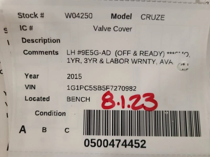Welcome to our eBay Store! CRUZE 2015 Valve Cover 1751505 Description Donor Vehicle VIN: 1G1PC5SB5F7270982 Model: CRUZE Year: 2015 Mileage: 98000 (0 = not available or unknown) Stock Number: W04250 Store Number: 4 Part Detail Part Grade: A Part Category: U Part Placement: Notes: LH 9E5G-AD OFF READY 6MO, 1 This part will fit these makes and models with these options WARRANTY / GUARANTEE Return Policy All parts we sell come with a 60 Day Money Back Guarantee unless otherwise stated. The 60 day period starts when you take possession of the part. Please contact us through eBay messaging for a Return Merchandise Authorization Number (RMA) before returning any part. We do not cover the cost of labor charges during the installation of your parts. All original shipping costs are non-refundable. Standard Warranty We offer a standard warranty on all mechanical parts. This covers the part only, no labor charges to install the part. We are not responsible for any improper installation or misdiagnosis. SHIPPING NOTES ABOUT US HELP Cooks Auto Parts Inc ships to US addresses within the continental 48 states. Shipping to Alaska, Hawaii, Puerto Rico, APO, FPO or PO Box addresses is available for select parts only. Please contact us through eBay messaging for details and shipping rates. Local Pick-up at our facilities is available. Please contact us prior to your purchase to arrange local pick-up. Buyer must select 'Buy It Now' prior to local pick-up. Please allow up to 10 days for delivery unless your part is included in eBay's Guaranteed Delivery Program. Most areas in the US are within 5 days. If an item arrives damaged, please contact us via eBay messaging within 24 hours for assistance. Please contact us prior to purchasing this part if you have any questions regarding our business policies, the warranties or guaranties we offer or the fitment of this part with your vehicle. We strive to make sure your vehicles repair needs are met the first time you order a part through our store on eBay. To do so, we are happy to verify your vehicles VIN number prior to your purchase, please use the Contact Seller feature within the eBay listing. Parts Grading. A standard code system is used to communicate the condition and quality of a part between automotive recyclers, automotive repair shops, and insurers. Knowing how these codes are used will help you understand whether the part meets your expectations before you buy it and what you can expect from the part when you receive it. A Grade - The highest quality part. It is of low miles and/or exceptional condition for its age. B Grade - The second level quality part. It is of average miles and normal condition for its age. C Grade - The third level quality part. It has high miles and/or light damage. No Grade - A part that has not yet been graded.