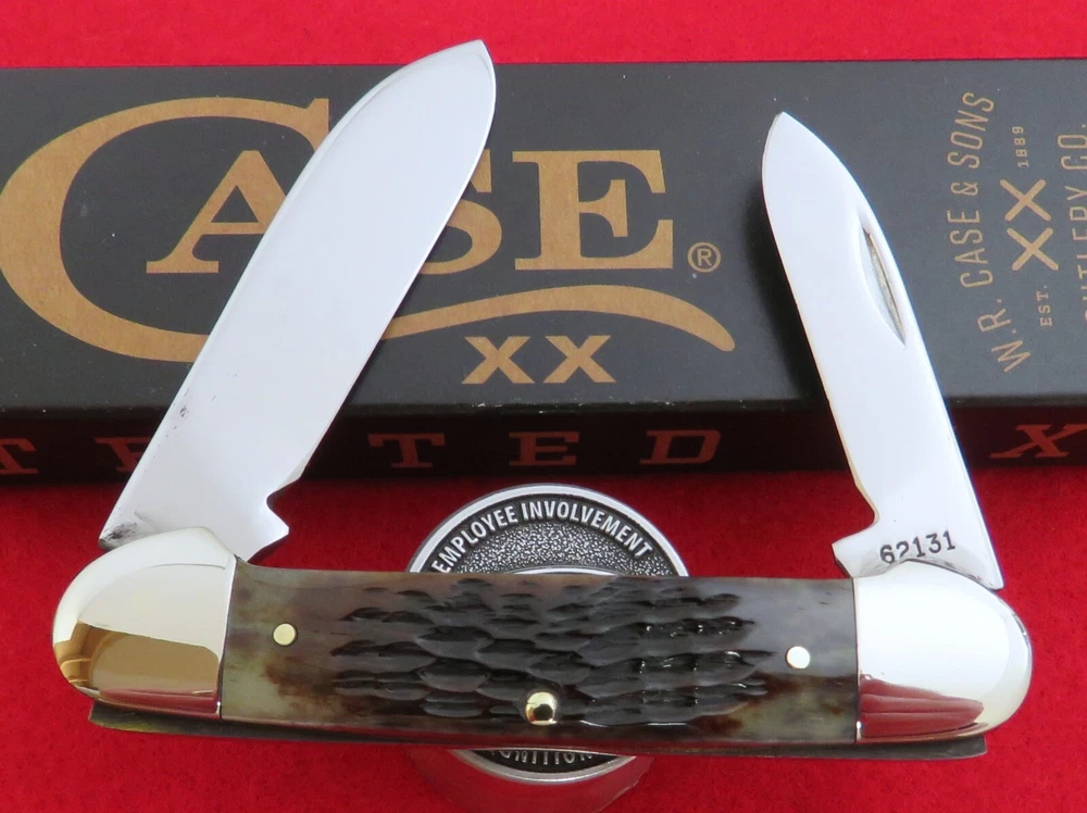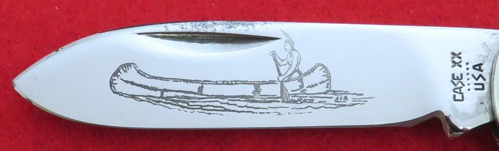 Hi I'm James Parker and I am offering some fine knives for auction from a recent Case Canoe Collection acquisition. The winning bidder pays $5.95 for USPS Ground Advantage Shipping with Delivery Confirmation included in the Shipping price. We recently acquired a great collection of W.R. Case & Sons Canoe patterns. As you have seen, we started listing these a month ago and this one for auction is one right out of this fine Case Canoe Collection. This knife for auction is a 1984 issue Case 5 Dot 62131 New Grind Canoe , 3 5/8" closed, with very nice Genuine Bone (cattle bone) handles and the pinned enclosed Case oval shield. The master Spear blade has the popular Canoe etching and is tang stamped reading Case XX U.S.A. with 6 Dots, dating this a 1984 issue Case knife, while the rear tang of this blade is pattern stamped with 62131. The knife has the very seldom used High Shoulder "New Grind" blades adding a nice custom look and finish as well as equal if not stronger blade strength. This knife has never been used or carried with just some minor spotting on the blades from age. Both blades are tight with great "walk and talk" snap. Please be sure to see the Supersize Photos for the EXACT item you will receive. We will include a brand new unlabeled Case factory box as knives of this period did not come with boxes many times. This fine 1984 issue Case 6 Dot 62131 New Grind Canoe is being offered at No Reserve. Yes, A True No Reserve Auction Where The Bidding Starts At .99 Cents. Thanks for your bids, we appreciate it.