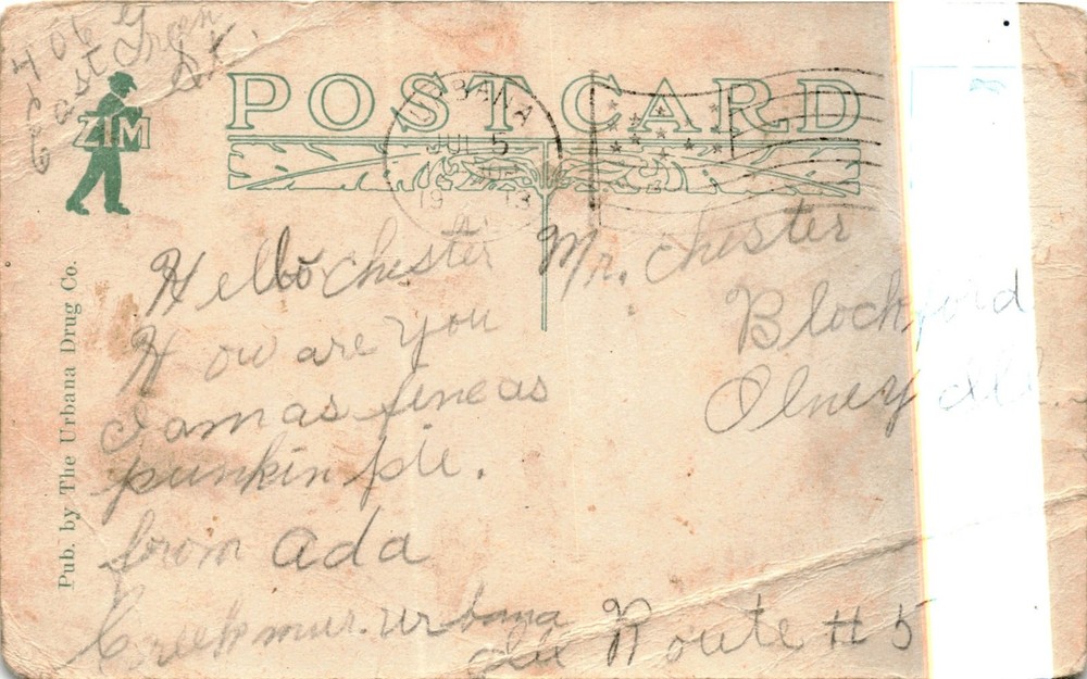 MAKE AN OFFER. THE MORE YOU BUY THE BETTER DEAL I WILL ACCEPT The postcard features a picture of the Cunningham Orphanage in Urbana, Illinois, published by The Urbana Drug Co. The message on the postcard is a brief note from Ada to someone named Helbochester Mr. Hister, expressing that she is doing fine.