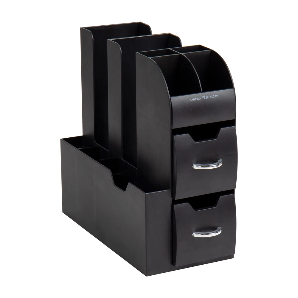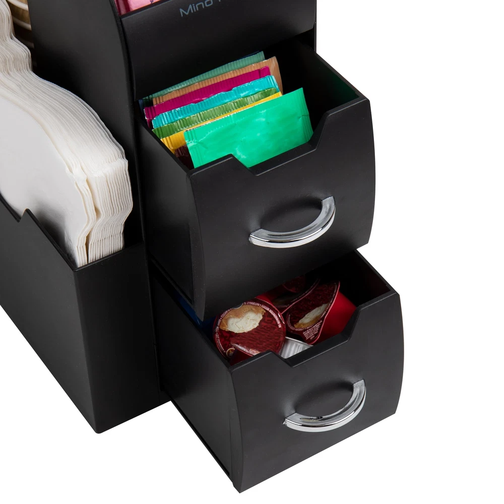 Streamline Your Breakroom with an All-in-One Organizer Efficiently organize your breakroom essentials with this versatile all-in-one organizer. With eleven compartments, this organizer provides ample storage space for coffee, tea, condiments, and more. Whether it's for college dorms, breakrooms, offices, hotels, or other spaces, this durable organizer is designed to withstand high traffic areas such as hotel lobbies or office breakrooms. No assembly is required, making it convenient to use right out of the box. Simply place this organizer in your kitchen, office, or cabinets to keep small kitchen or bathroom items neatly stored and easily accessible. The 11-compartment organizer features three tiers and two drawers, offering efficient storage for all your condiments. It's not limited to coffee and tea supplies, as it can also be used to organize makeup and toiletries in the bathroom. To clean the organizer, simply wipe it with a cleaner or dish soap and water. The spacious 3.75-inch (9.5 cm) opening accommodates 12-, 16-, and 20-ounce cups and lids, allowing for convenient stacking. The compartments are designed to hold utensils, napkins, single-serve coffee pods, creamers, tea bags, salt and pepper packets, as well as snack bars and chocolates. The organizer features a sleek black color that blends well with any decor, and its chrome-look handles add a touch of modernity to your home, office, or hospitality setting. Cleaning the organizer is a breeze thanks to its durable and food-safe plastic construction, ensuring it remains hygienic between uses. Streamline your breakroom and create a tidy and organized space with this practical and versatile all-in-one organizer. Efficient organization for coffee and tea enthusiasts: This compact coffee and tea organizer, measuring 5.35 inches wide, maximizes space while providing a convenient storage solution for your coffee, tea, and related condiments. Whether it's on a hotel buffet or your kitchen counter, you can keep everything neatly organized without sacrificing valuable space Built to last: Crafted from durable, food-safe plastic, this organizer is designed for everyday use in hotels, cafes, offices, or your own kitchen. Its sturdy construction ensures long-lasting durability, even with frequent handling and use Secure and stable: With bottom rubber grippers, this organizer stays securely in place on your countertop or table, preventing any unwanted sliding or slipping. You can rely on it to stay put and keep your items organized and easily accessible Versatile functionality: While ideal for coffee and tea essentials, this caddy's multiple compartments and drawers offer flexibility for organizing other items as well. Use it to store office and school supplies, makeup, or any small accessories that need a designated spot Optimal size for small spaces: Measuring 11.25 inches long x 5.35 inches wide x 11.15 inches tall (28.58 x 13.6 x 28.3 centimeters), this space-saving caddy fits perfectly in compact areas, freeing up valuable counter space for other purposes. Enjoy a clutter-free and organized environment without compromising functionality