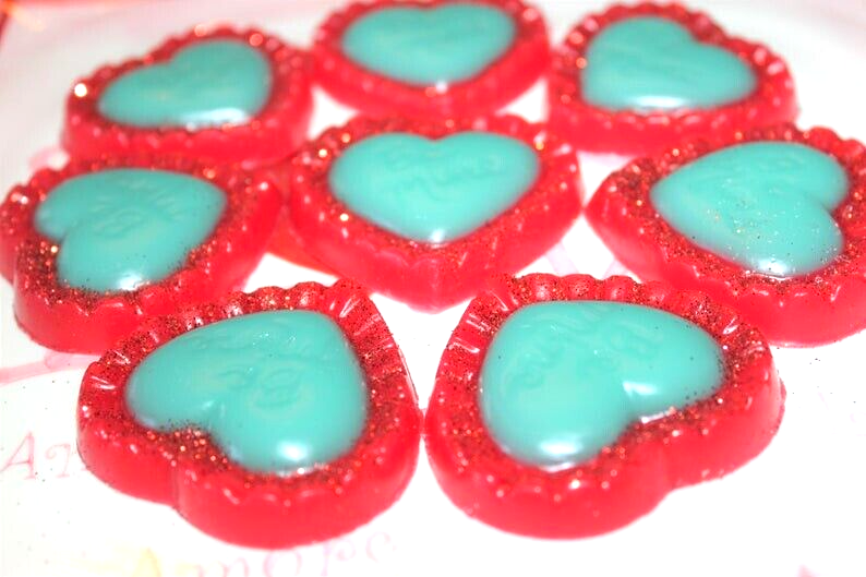 **** SHIPPING IS OFTEN CALCULATED HIGH WHEN PURCHASING MORE THAN 1 ITEM SO FEEL FREE TO MESSAGE ME FOR A SHIPPING QUOTE **** When combining purchases please click on "request total from seller" at checkout and wait for me to send you a invoice with combined shipping. If you are using your phone this option may not be available and if so just message me and I can make you a listing with everything combined and the correct amount on shipping. Thank You ;) Due to the high cost of this fragrance oil these are a little bit more expensive but well worth it! These are my handmade highly scented large Valentine's Be Mine heart wax warmer tarts or melts that are made with a special blend of paraffin wax that allows me to add up to 10% more fragrance than most waxes. They are scented to the max with CUPCAKES AT TIFFANY'S. Totally scrumptious! Sweet, buttery notes with hints of toffee, tiny hints of chocolate with loads of sweet and slightly fruity buttercream notes with creamy, fluffy vanilla cake bottom notes. YUM! BEST SELLER You will receive 8 large heart wax melts in a cello bag with a fabric tie and labeled. They measure approx. 2" x 2 1/2" and I added glitter to the edges and they have "Be Mine" printed in the center. They also make great gifts so please be sure to check my other listings for terrific smelling candles and tarts to go with your order. International Buyers : Please contact me for shipping quote. Shipping I strive to ship within 48 hours of payment received not including weekends and holidays. I ship USPS Priority or Parcel Post and for the heavier orders I can ship Fed-Ex. I do offer USPS Flat Rate shipping as well. Insurance is the buyers responsibility. I am always happy to combine auctions to save you money on shipping fees and I only change actual shipping costs. Please email with any shipping questions or quotes if needed. Thanks for stopping by! Please do come back again soon~*** Please note I do not accept returns for used merchandise. Must be returned in same condition as received. *** RETURNS ARE ONLY ACCEPTED IF ITEM HAS BEEN MISREPRESENTED