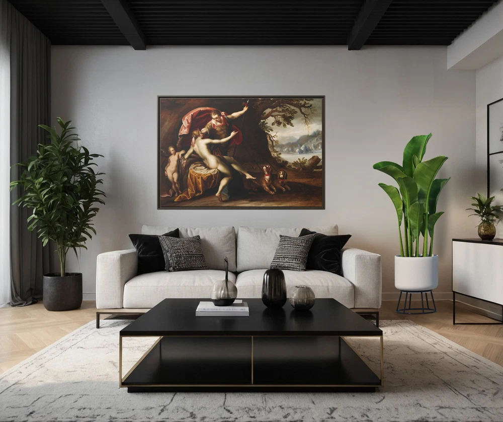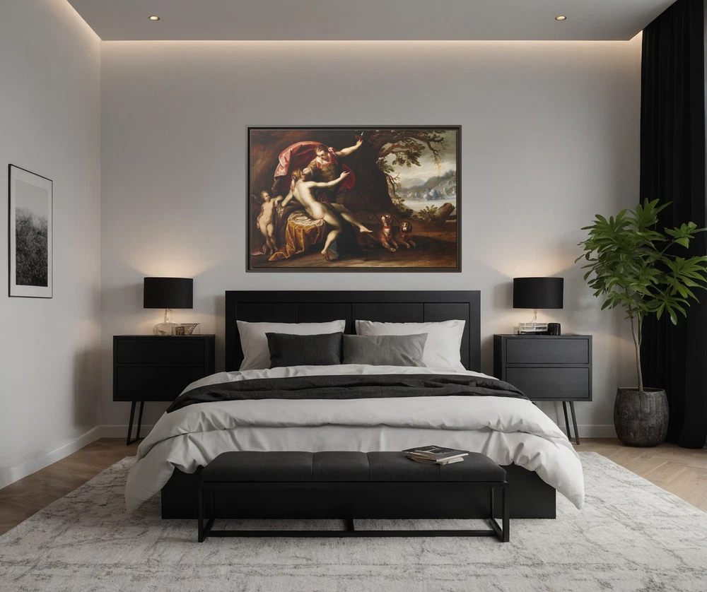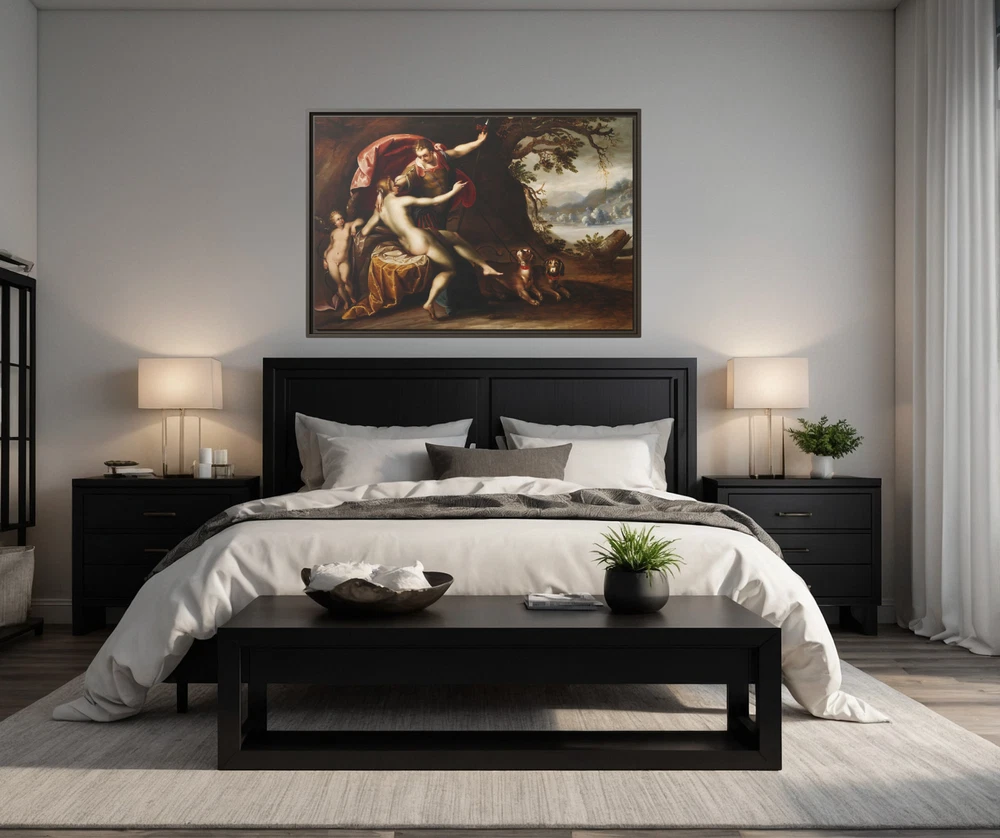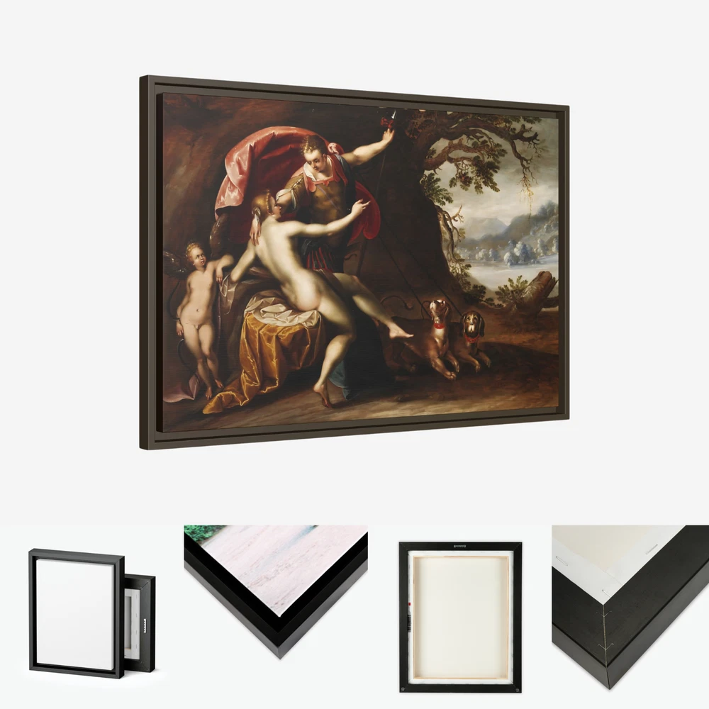 "Venus and Cupid with Hermes" – Renaissance Painting Reproduction Product Description: Celebrate the timeless allure of Greek mythology with this exquisite Renaissance reproduction featuring Venus (Goddess of Love) and her son Cupid (God of Desire) . This captivating scene showcases Venus in serene repose on her bed, with the enigmatic Hermes (God of Speed & Travel) hovering above her, symbolizing swiftness and communication. At the head of the bed, Cupid stands ready, embodying desire and affection, while Hermes' loyal dog companions ground the divine moment in companionship and loyalty. This museum-quality reproduction captures the intricate details and rich colors of the original masterpiece, printed in HDR on a premium cotton-polyester composite gallery-wrapped canvas . The proprietary matte finish coating ensures vivid, long-lasting colors and enhances the artwork's depth and texture, allowing every brushstroke to shine. Framed with a 1.25" espresso solid pine wood frame , the design provides a striking floating effect that elevates the artwork's presence in any space. The frames are made with sustainably sourced materials (Forest Stewardship Council certified) , offering a perfect balance of sophistication and eco-consciousness. This masterpiece is printed using UL-certified Greenguard Gold latex inks , which are non-hazardous, non-toxic, and non-flammable, ensuring a safe and environmentally friendly display. Arriving ready to hang , the canvas includes pre-installed sawtooth hardware for effortless setup. Whether you're an art enthusiast, mythology lover, or admirer of the Renaissance, this reproduction brings elegance, mythology, and timeless beauty to your home. Key Features: Greek Mythology-Inspired Artwork: Features Venus (Goddess of Love) and her child Cupid alongside Hermes (God of Speed & Travel) in an intricate Renaissance masterpiece. Premium HDR Printing: Museum-quality reproduction printed on a cotton-polyester composite canvas with a proprietary matte finish for vivid, long-lasting colors and exquisite detail. Elegant Espresso Frame: 1.25" solid pine wood frame with a warm espresso finish provides a stylish floating effect for enhanced visual impact. Eco-Friendly Materials: Crafted with sustainably sourced, FSC-certified pine wood and printed with UL-certified Greenguard Gold non-toxic inks for an environmentally conscious product. Ready to Hang: Comes with sawtooth hanging hardware pre-installed, making it easy to display right out of the box. Low Maintenance: Dust off gently with a clean, damp cloth to maintain its pristine condition. Custom-Made for Freshness: Each canvas is printed and framed after purchase, guaranteeing a new, untouched product. Perfect For: Adding a touch of Renaissance elegance and mythology to your home or office décor. Art collectors and mythology enthusiasts seeking timeless storytelling through art. Gifting to lovers of classic art or Greek mythology for special occasions. Transform your space with the elegance of "Venus and Cupid with Hermes" – a Renaissance masterpiece reimagined for modern interiors. Order now to own a timeless celebration of love, desire, and divine beauty! 4o