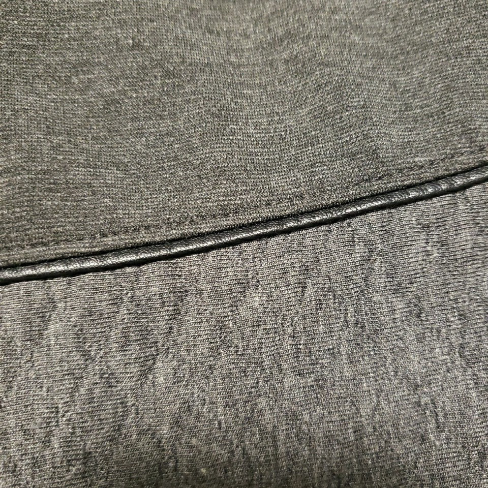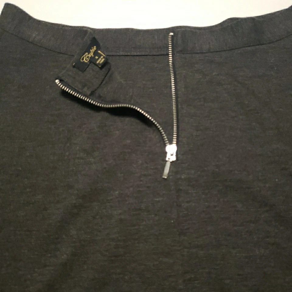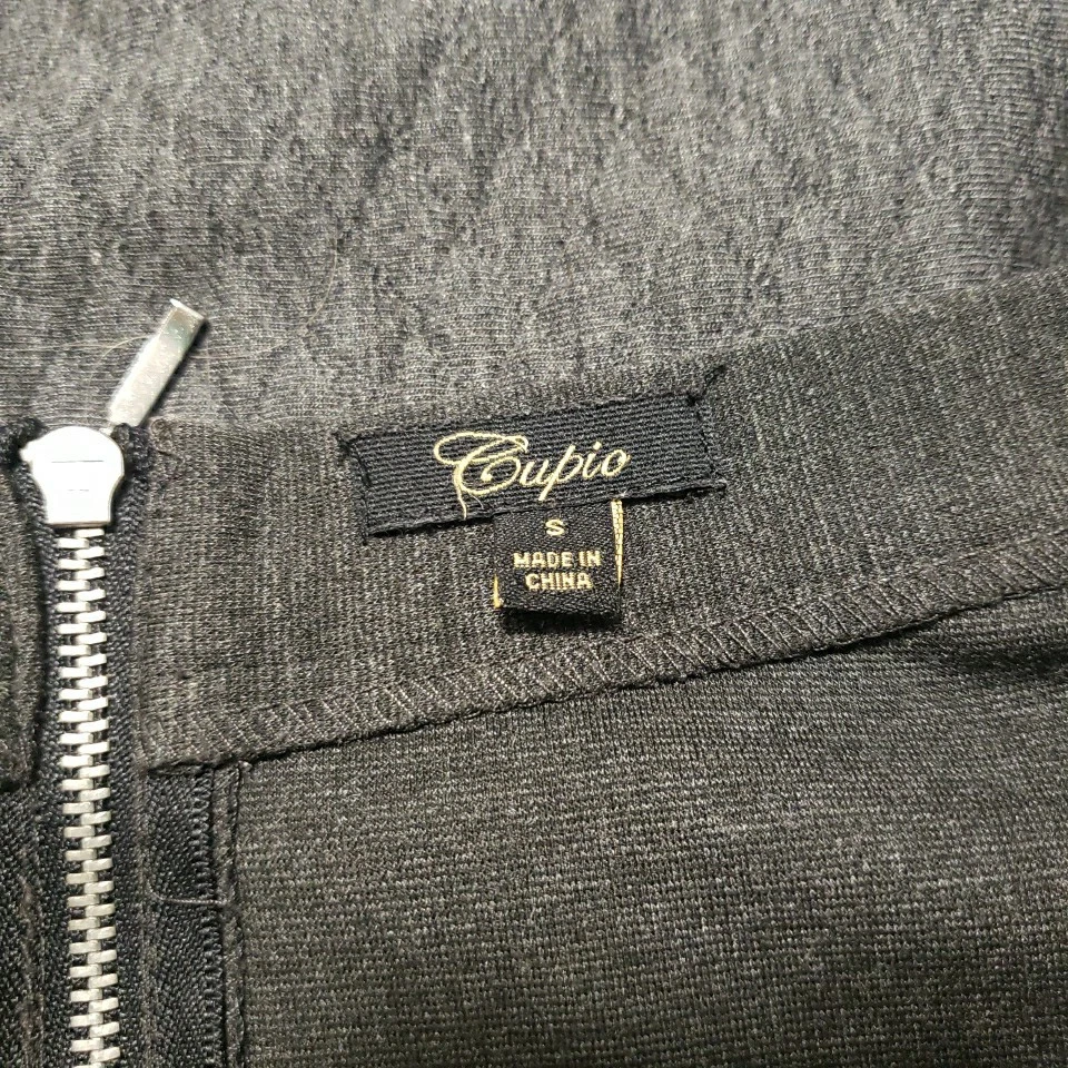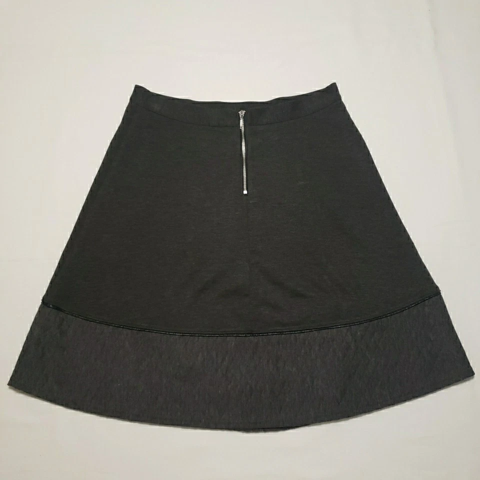 This is a Cupio women's gray skirt in size S, featuring a faux leather strip pattern on a quilted knit fabric in an A-line style. It has a zip closure and is machine washable. The skirt is knee-length, has a high rise, and is lightweight, making it suitable for various occasions like travel, weddings, parties, or casual wear. Perfect for all seasons, this skirt offers a stylish and versatile addition to any wardrobe.