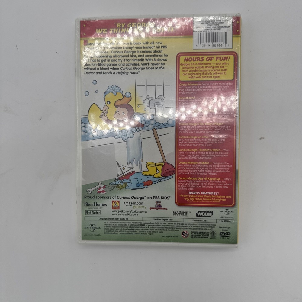 Run Time:108 min.Movie/TV Title:Curious George: Goes to the Doctor and Lends a Helping Hand!Genre:Animation-Children's & FamilyRating:NRgtin13:0025195016681Type:Movie TV Series Christmas Gift BirthdayStudio:Universal StudiosLanguage:EnglishFormat:DVDRelease Year:2007UPC:0025195016681