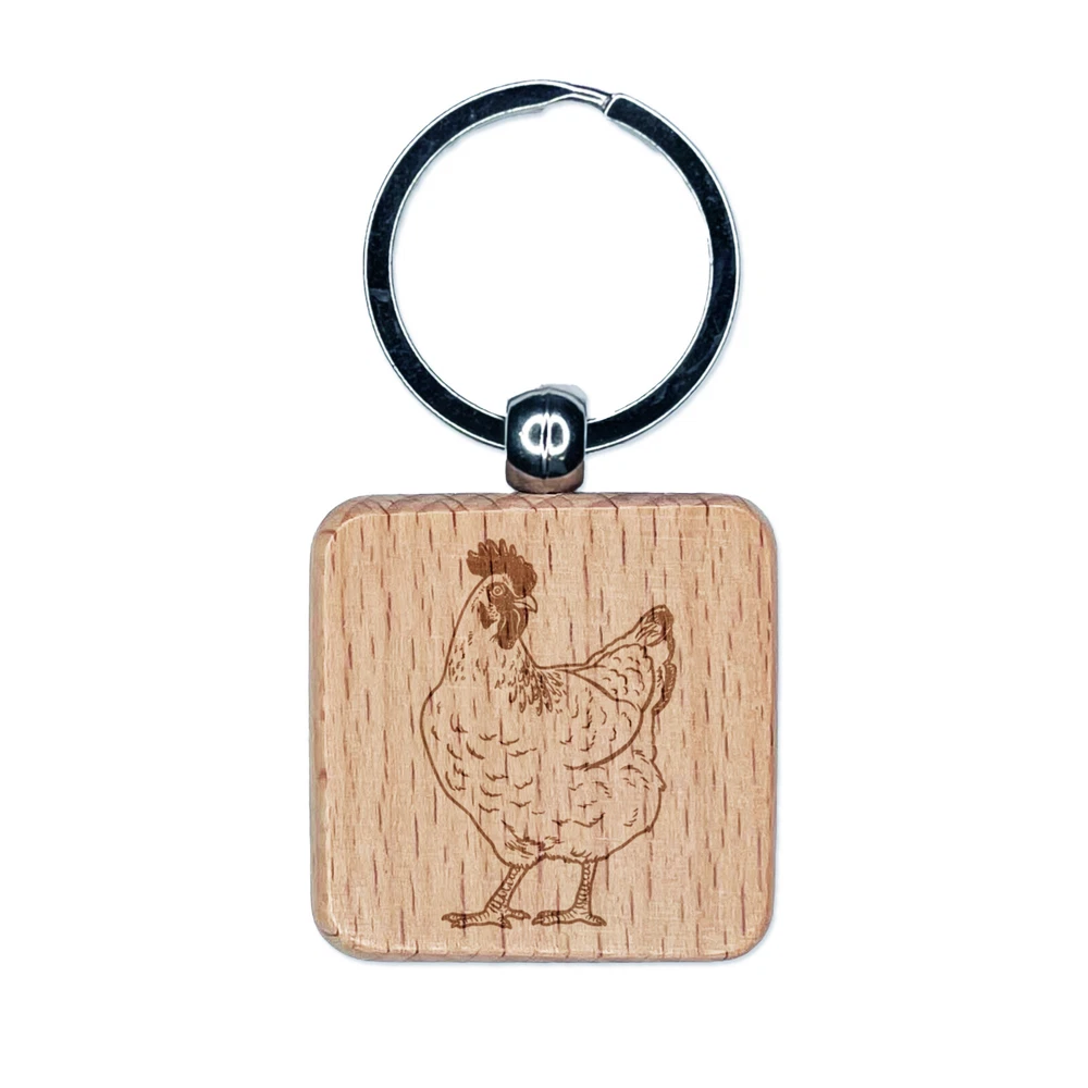 Curious Hen Chicken Engraved Wood Square Keychain Tag Charm
