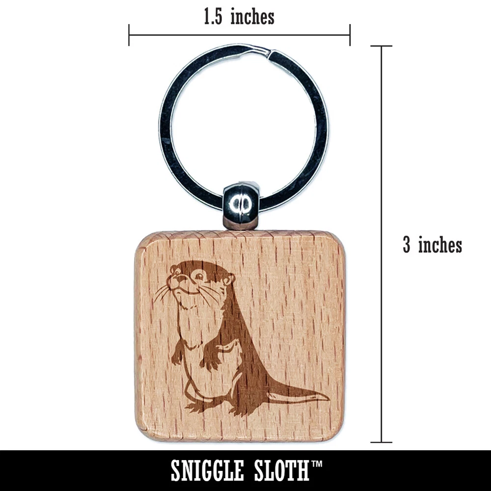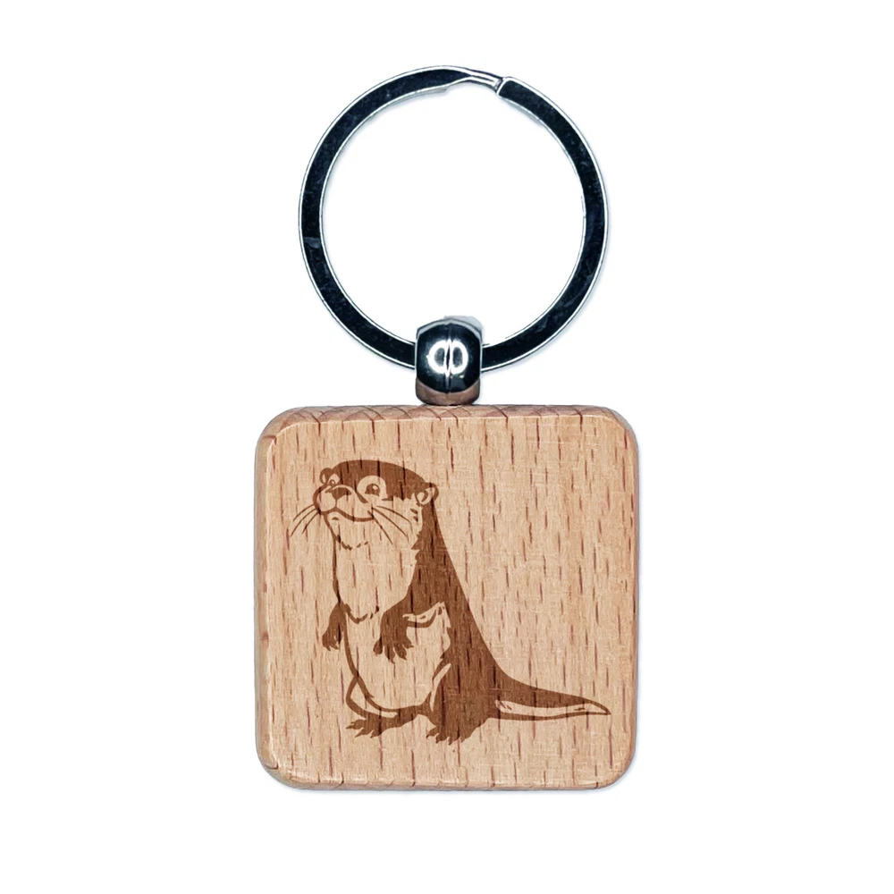 Curious and Cute River Otter Standing Engraved Wood Square Keychain Tag Charm