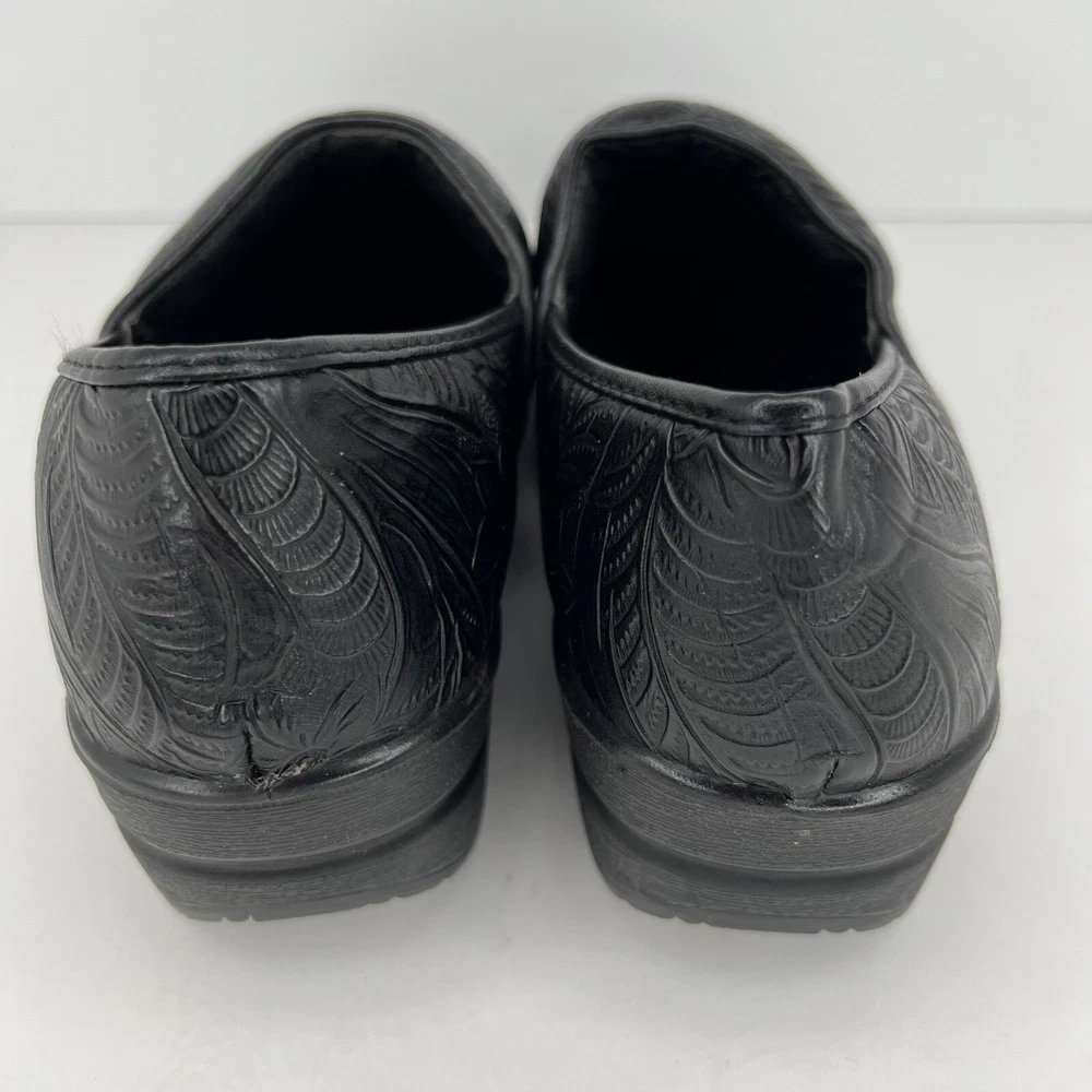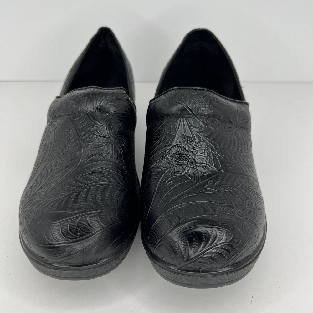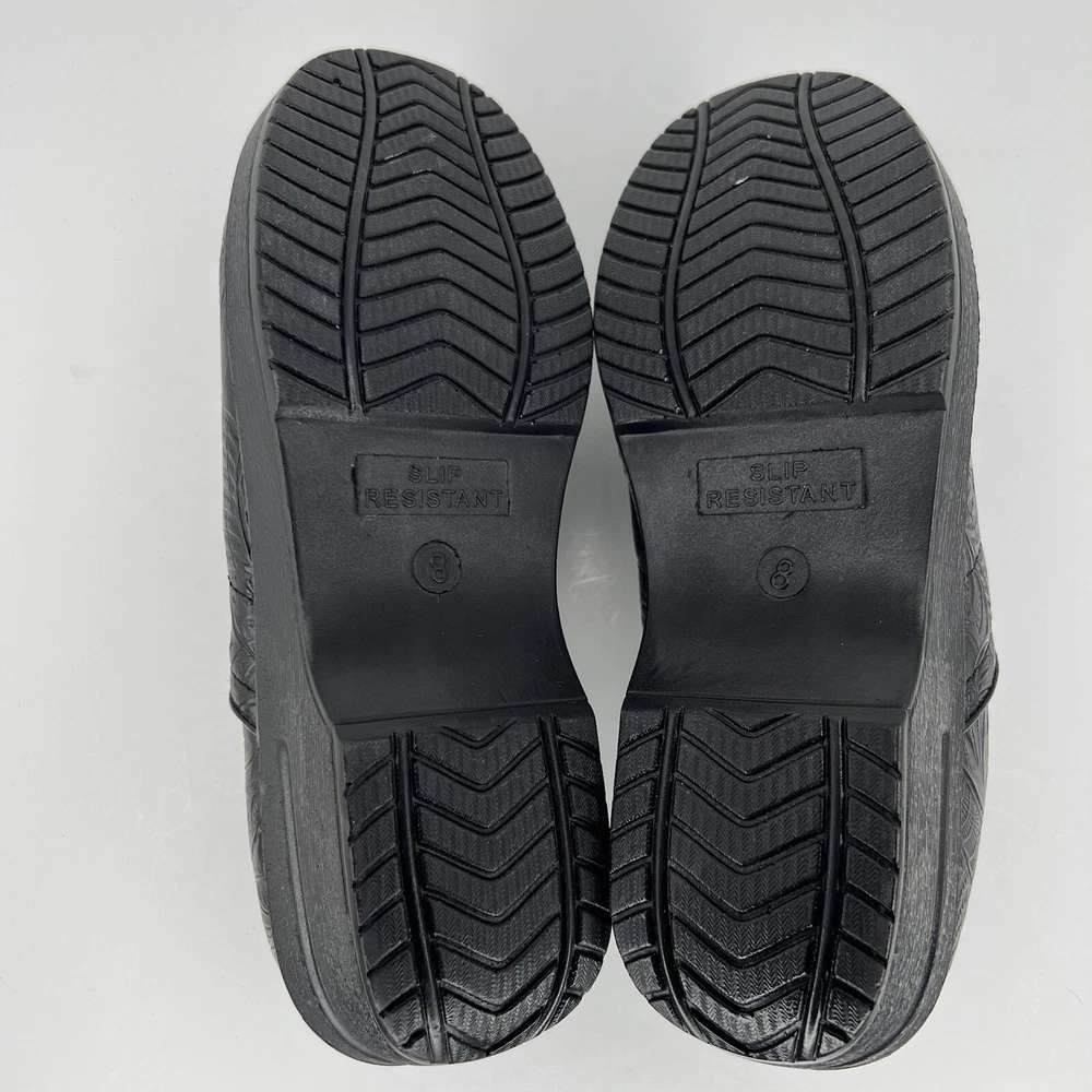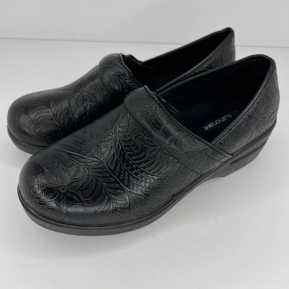 Elevate your casual wardrobe with these chic black leather clogs by CUSHIONAIRE. Designed for comfort and style, these slip-on shoes feature an embossed pattern and slip-resistant rubber soles. The Claire character adds an extra touch of charm to your outfit. Perfect for any occasion, these clogs are a must-have for any fashion-forward woman. The fabric insole ensures maximum comfort, while the standard shoe width provides a perfect fit. These CUSHIONAIRE Claire clogs are sure to become your go-to shoes for everyday wear. 100% CUSTOMER SATISFACTION IS OUR GOAL! Our items are always carefully examined for condition, measured if necessary, and photographed in a climate controlled and smoke-free environment. We make every attempt to accurately describe and clearly picture the items we have for sale. Please, ALWAYS view all of the photos. We value your business and our goal is your complete satisfaction. FAST SHIPPING All items are packaged with care and shipped out the same or next business day via USPS, FEDEX, or UPS with tracking numbers so you are always informed. RETURNS We offer a 30-day return policy. All items must be unused and unopened in the condition in which they were received, with original packaging, and all accessories included for return. REVIEWS - CUSTOMER SATISFACTION - COMMUNICATION We aim to make you happy. After you receive your shipment, please leave a positive review . If you have concerns or questions about your order, please contact us so we can resolve the issue. We will do our best to make you satisfied. THANK YOU FOR YOUR BUSINESS!
