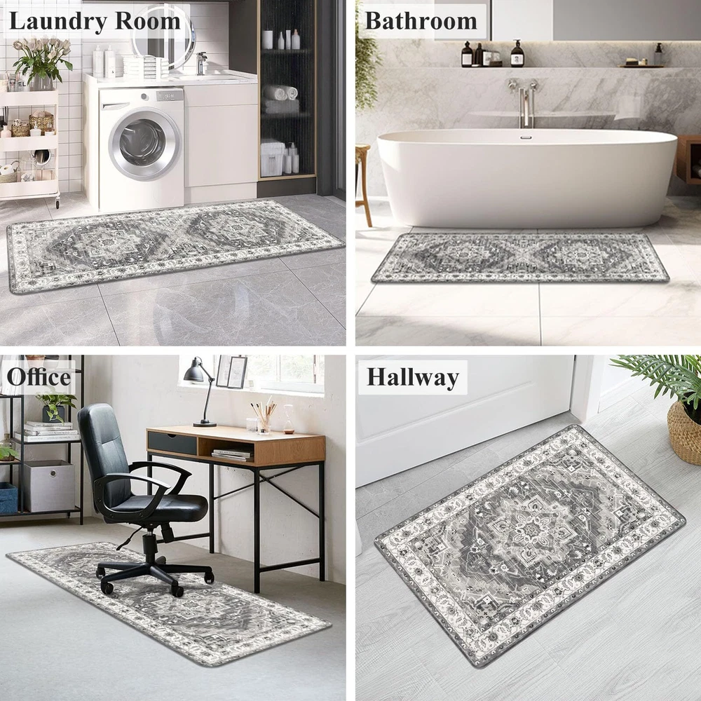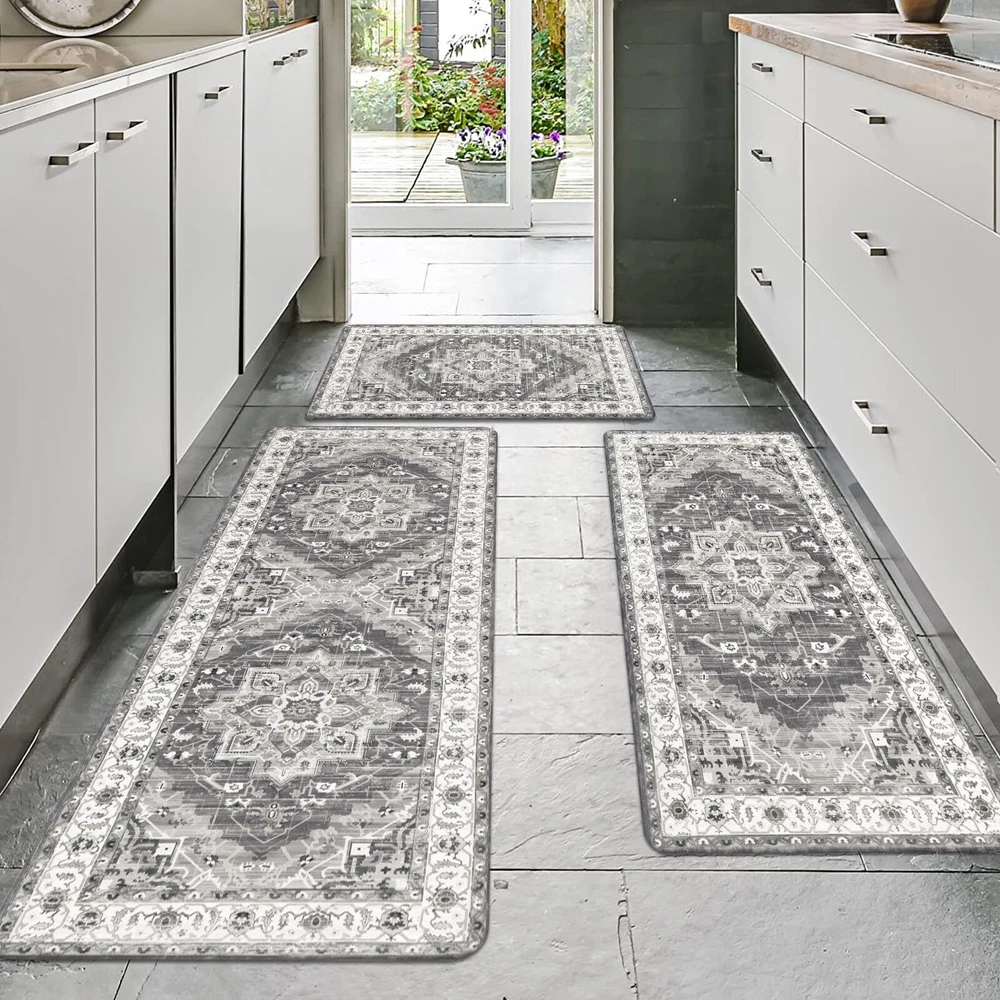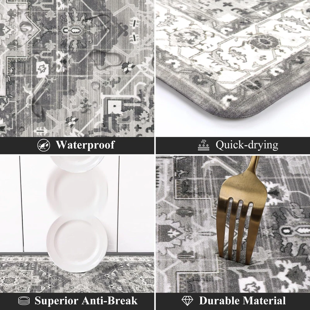 Anti Fatigue Kitchen Mats for Floor 3 Piece Set: Our farmhouse antifatigue kitchen mat and runner set measures 17.3''x28''+17.3''x 36''+17.3''x 48''.The comfort standing mat with runner are made of premium PVC materials,which is not easily deformed Comfort Anti-fatigue Mats for Kitchen Floor: 0.4'' thick cushioned anti fatigue kitchen floor mats are ergonomically engineered,so thick and cushioned that you are able to stand comfortably while working in the kitchen or at any work station Non Slip Kitchen Rug Set: Backing of the anti fatigue kitchen mat set is made of non-slip material;also beveled edges help prevent tripping.Please clean the floor before use.Clean and dry surface will be conducive to the kitchen mats slip resistant Waterproof Kitchen Rugs Set of 3: If the kitchen rug runner set gets dirty,just simply wipe clean with a damp cloth or sponge in a timely manner,or use any common household cleaner to clean.Please do not put it in the washing machine Versatile Cushioned Kitchen Rugs and Mats Set: Washable kitchen floor carpet set provides ample support for standing in kitchen, kitchen sink, stove, laundry room, office, farmhouse or any other high-traffic indoor or outdoor space