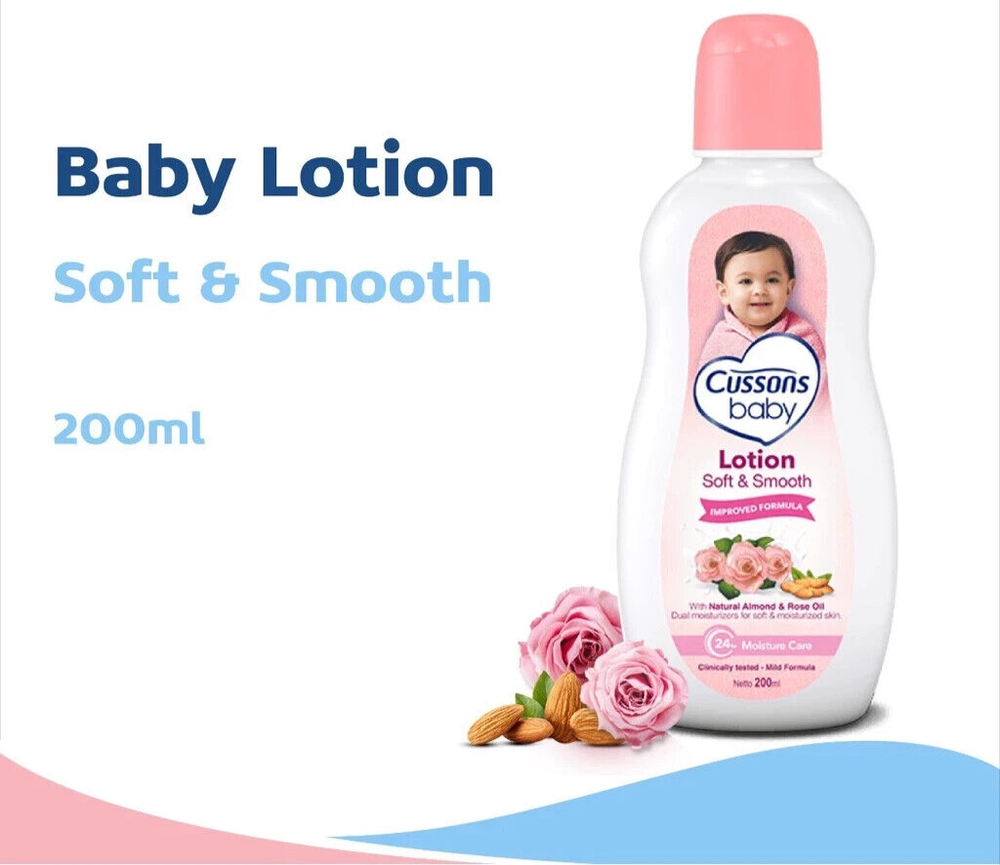 Cussons Baby Lotion Soft & Smooth - Baby Lotion 200ml -Cussons Baby baby lotion has been tested by dermatologists so it is safe for baby's skin -Contains a combination of Almond Oil and Rose Oil that nourishes baby's skin and provides a comfortable fragrance -Cussons Baby baby lotion is easily absorbed and does not cause a sticky feeling -Has a distinctive and soft baby scent that makes babies more adorable -Use Cussons Baby baby lotion after bathing to keep skin healthy and well-maintained