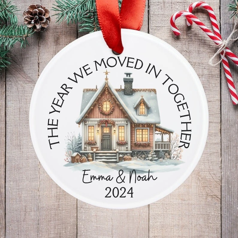 Custom Couples Ornament, First Place Together, First Christmas Living Together, Move in Together Christmas If you need to buy more, please inbox us We have two material options (Ceramic & MDF), please read the product description as below to choose your favorite options. MDF Ornaments 1-sided design. Print type: Sublimation printing. Crafted from durable MDF with a high-gloss plastic finish so your designs last a lifetime. Shapes: Round, star, heart and oval . Product Dimensions: Circle & Heart, 2.75” tall; Oval & Star, 3.25” tall. Ships with a festive gold cord for easy hanging. CERAMIC Ornaments 125" (3mm), 2.75" height (circle), thick high-quality porcelain One-sided print Hole for the hanging string Gold-toned string included Available in 4 shapes - Snowflake, Star, Heart and Circle The height of the hole can slightly deviate Shipping, Return and Refund Policy On average, merchandise is produced and shipped from our facility 2-4 business days after purchase. Standard Shipping: 5-7 working days for USA. Please contact us if you have any dissatisfaction with the item you buy so that we give you the solution. It is easier for us to handle your issue if you send us the proof like an image. We can replace another within 30 days without fee if the item is defective, damaged, or an error is made on our end.