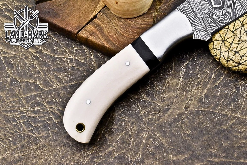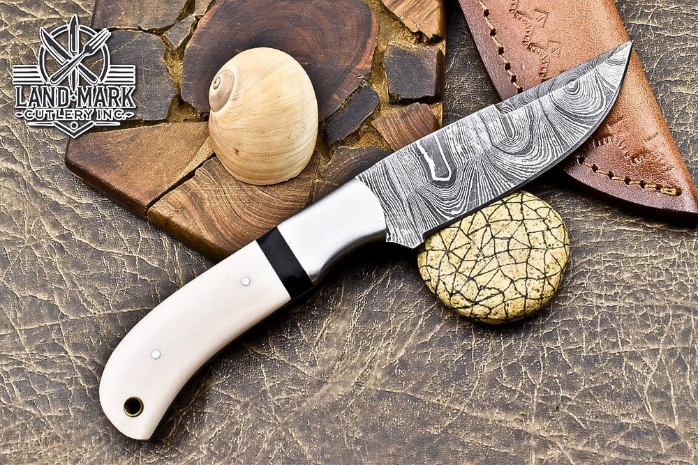 Custom Hand Made DAMASCUS STEEL HUNTING KNIFE WITH WHITE HANDLE We offer a shipping discount for More then one purchased . And discount will be apply on combine invoice, Discount will not apply on separate payment. ITEM DETAILS OVER ALL LENGTH 8.0 inches long (Approx) HANDLE LENGTH 4.0 inches long (Approx) BLADE LENGTH 4.0 inches long (Approx) BLADE HARDNESS 58-60 HRC Which Holds The Sharp Edge For Long Time. HANDLE RESIN COVER LEATHER SHEATH This Awesome custom made KNIFE has a nice hand forged with the combination of 4340 & 1080 steel. HOW OUR DAMASCUS IS MADE: All our Damascus is real and not just an acid etch. Damascus is a mixture of 1080HC and 4340 nickel carbon. You heat them up together and then fold the bar over and over to get the desired layers, ours are 396 layers. Then you burn the blade in acid, and it turns the nickel satin color and the high carbon turns blackish gray. This is how the layers are exposed to show the layers of the new steel created coined "Damascus". All Damascus is acid etched to show the layers. If you high polish the metal it will be shinny satin like all steels. Only after you burn the sides of the blade with acid do you see the layers of the two steels. Makes sense? After we make our knives we high polish the handles and put an edge on the blade. The high polishing buffs off the acid burned layer of the handle, and the blade edge is sharpened and the acid burned edge becomes satin. You can re-burn the tang of the blade near the handles and the edge of the blade and it will show the layers once more. All our knives are hand made, durable and unique ***** YOU WILL RECEIVED THE SAME KNIFE Qality Standards Our Damascus blades are made from high quality non-stainless steels which rival or exceed any Damascus blade made from the 10 series with 4340. Our Damascus combination has taken years to perfect and has been tested under a variety of application which will offer professional performance in categories of toughness, strength (lateral stress) and edge honing and holding ability. In a 5 spot Rockwell test our blades will average near or close to 58 which offers a perfect balances between its toughness and strength.Our blades due to carbon content need to be regularly treated with wax and/or 3 in 1 oil to maintain its superior quality. Questions if you have any question feel free to send us message we aim to answer all questions within 24 hours Feedback If you are not satisfied with our service please contact us before leaving any negative or natural feedback. We will resolve all issues as quickly as possible. Disclaimer We are not responsible for any injuries associated with the use of our tools. Our products are intended for legal use only by responsible buyers. Therefore, we will not sell our products to anyone under the age of 18. Before bidding please check your country laws as some countries Custom don't allow this. If your purchase is held by Custom Authorities in your country/State we will not be responsible for that and no refund will be issued Shipping We offer a 20% shipping discount for More then one purchased . And discount will be apply on combine invoice, Discount will not apply on separate payment We ship within 24 hours after receiving complete payment but this can be delayed due to week ends or Governments and Religious Festivals . . This is beyond our control and we apologize for this inconvenience. Precautions Our Tools are very sharp so open and use them very carefully We are not responsible for any injuries associated with the use of our tools Tips to Care knife 1. NEVER STORE YOUR KNIFE FOR LONG TIME IN LEATHER SHEATH. 2. LEATHER CAN ABSORB WATER, WHICH WILL RUST THE KNIFE. 3. ALWAYS CLEAN THE BLADE AFTER USING WITH OIL OR WAX