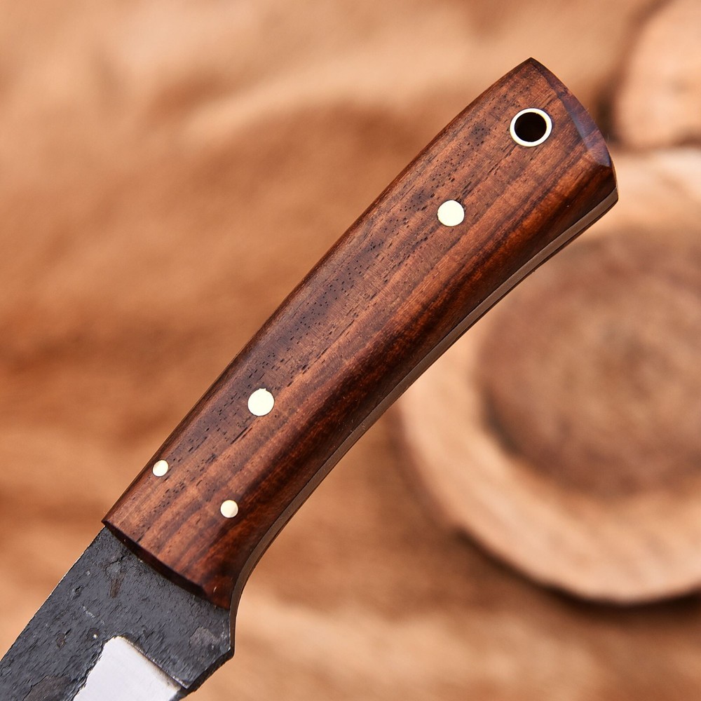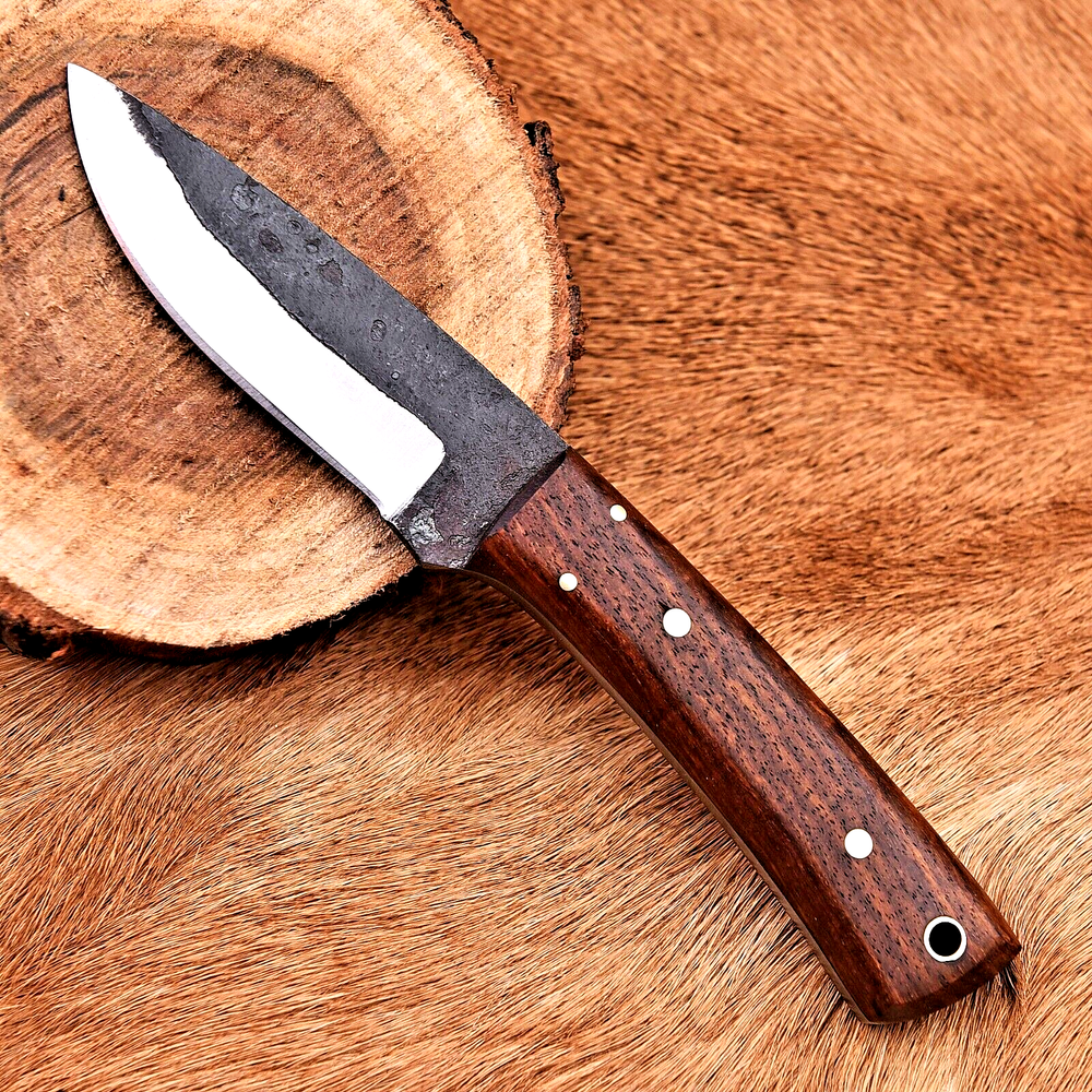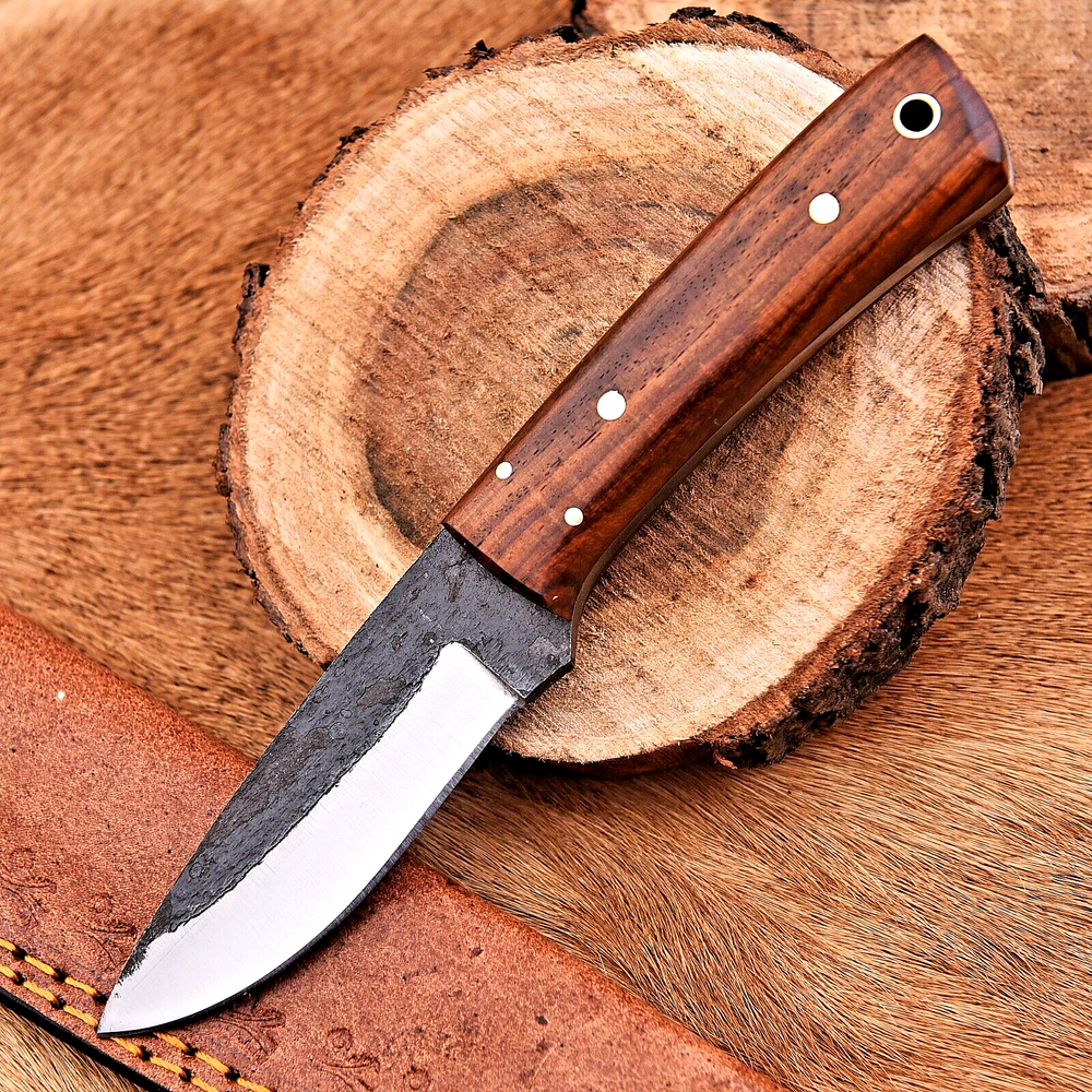 CUSTOM HAND MADE HIGH CARBON STEEL EVERY DAY CARRY SKINNER HUNTING KNIFE Wood Handle This superb design knife is hand forged. Blade of this knife has a nice file work. The balance and shape of this knife ensures perfect grip. Overall Length: 7.2” Inches Blade Length: 3.6 ”Inches Handle Length: 3.6 ”Inches Package Includes: with Leather Sheath Warning: Keep fingers clear of blades. Store away from children.