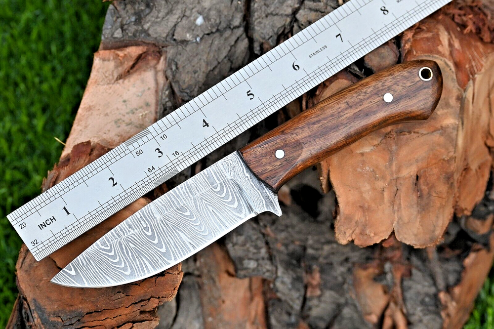 FORGED DAMASCUS STEEL SKINNER KNIFE CUSTOM MADE HAND HUNTING CAMPING SURVIVAL HIKING KNIFE Wood Handle This superb design knife is hand forged. Blade of this knife has a nice file work and is made of 512 layers of 4340 stainless steel and 1075 high carbon steel and hardness 55-58 HRC . This robust knife is lab tested under intense conditions, the balance and shape of this knife ensures perfect grip. Overall Length: 8" Inches Blade Length: 4" Inches Handle Length: 4" Inches Damascus Design: Rain Drop Pattern Layers: 512 Hardness: 55-58 HRC Package Includes: with Leather Sheath Warning: Keep fingers clear of blades. Store away from children.