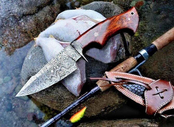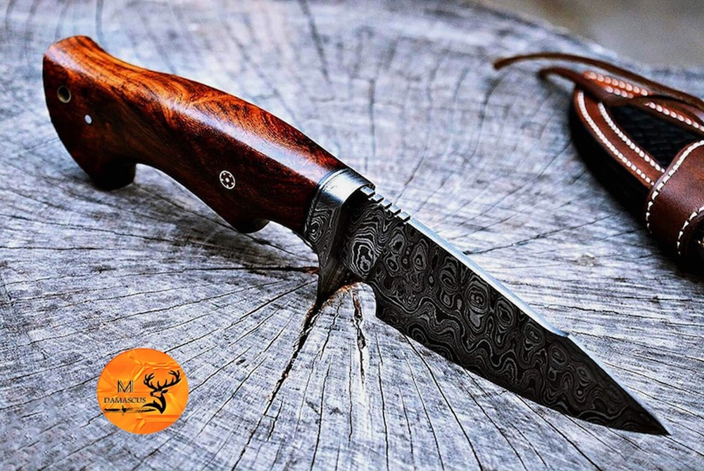 CUSTOM HAND MADE HAND FORGED DAMASCUS STEEL ENGRAVED BLADE HUNTING CAPMING TRACKER KNIFE Wood & Damascus Steel Guard Handle This superb design knife is hand forged. Blade of this knife has a nice file work and is made of 512 layers of 4340 stainless steel and 1075 high carbon steel and hardness 55-58 HRC . This robust knife is lab tested under intense conditions, the balance and shape of this knife ensures perfect grip. Overall Length: 10.5" Inches Blade Length: 5" Inches Handle Length: 5.5" Inches Damascus Design: Ladder Pattern Layers: 512 Package Includes: with Leather Sheath Warning: Keep fingers clear of blades. Store away from children.