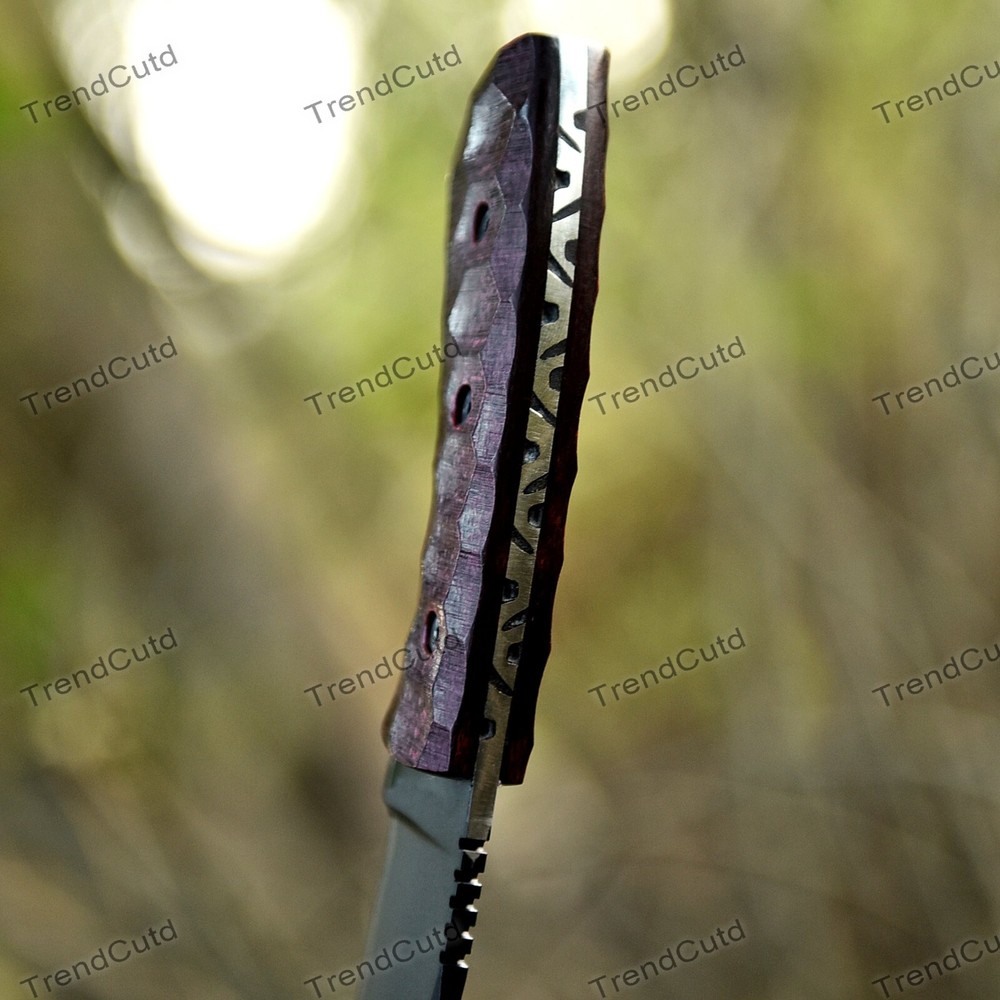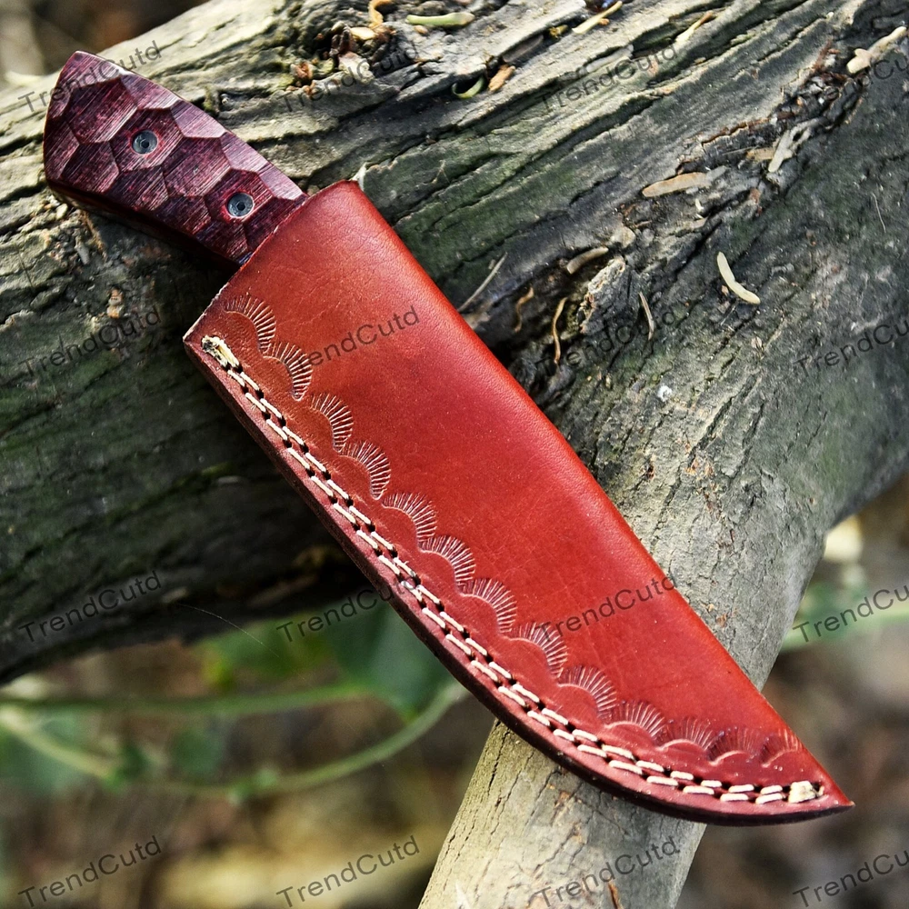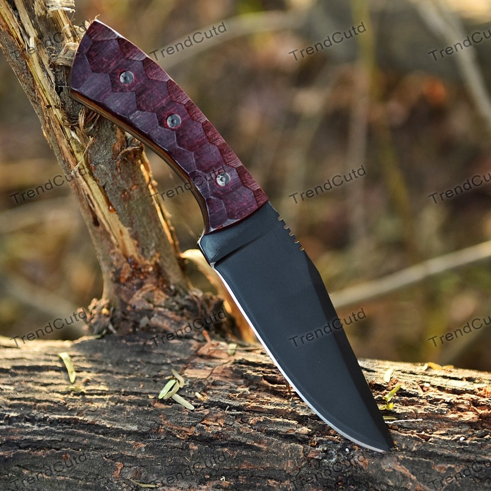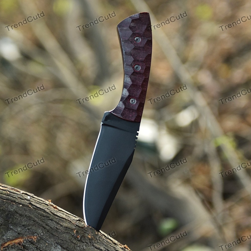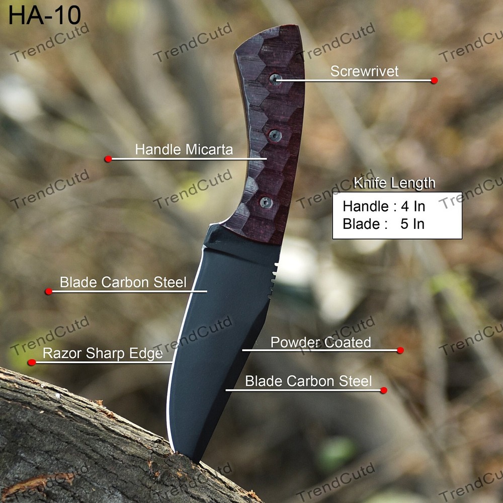 Custom Handmade Full Tang Black Powder Coated Carbon Steel Skinner Hunting Knife KNIFE MATERIAL: Blade: Carbon Steel Black Powder Coated Handle: Micarta KNIFE MEASUREMENT: Overall Length= 9" Blade Length= 5" Handle Length=4" Trendcutd knives are handmade you will get the same knife as in the photo. A slight difference can be there in color and patterns because these are handmade items and we use natural material. These knife have perfect grip sharp cutting edge which makes our knives more durable. Tips To Care For Knife: 1. Clean your knife with gasoline or Ethanol after use. 2. Apply oil on the blade after cleaning & using the knife. 3. Never store the knife in sheath for long time as it may dull the sharpness of knife over time. DISCLAIMER: If you have any issue regarding our products and services you can always contact us any time we will try to resolve your issue as quickly as possible. Best Regards, Trendcutd