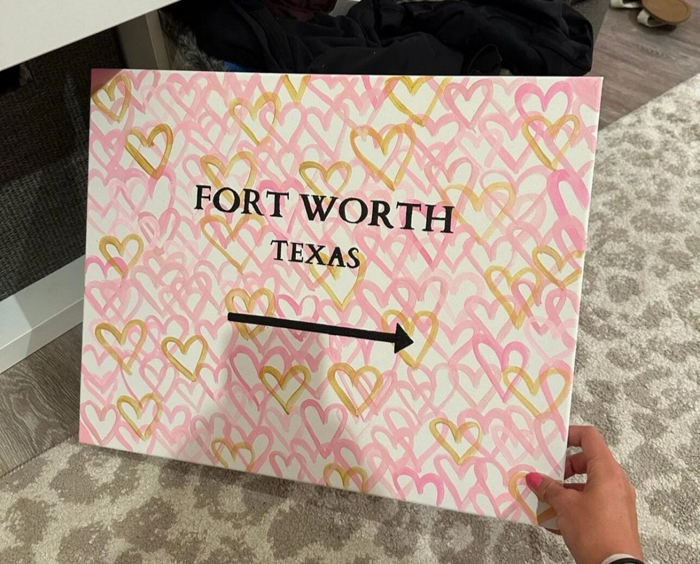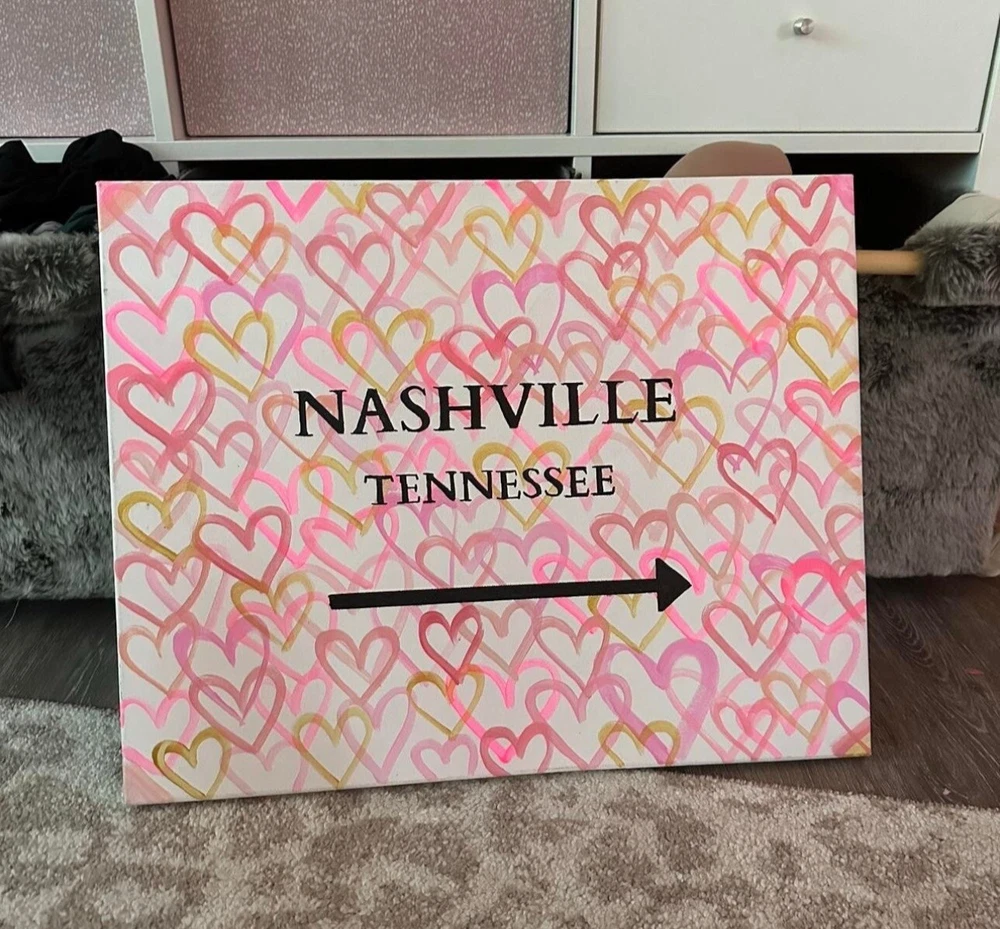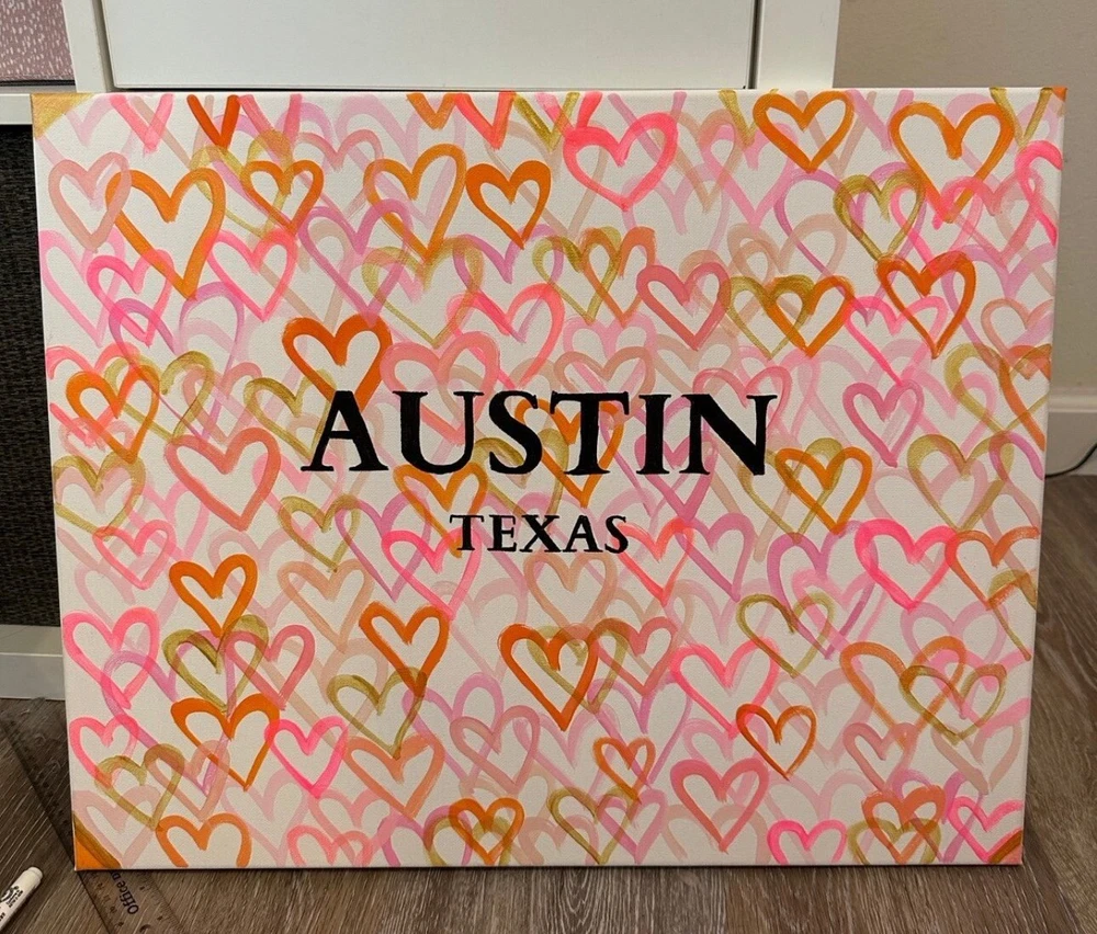 16x20 Custom Heart Canvas painting Made to Order Destination of choice - Preppy Custom Graffiti Hearts - Modern Abstract Canvas Painting Handmade by me 16x20 canvas Easy to hang with push pins I can do any color of abstract hearts can be made custom for any school/college/university, town/city/state, etc!! Please message me the City / State / School you would like and colors for hearts Super fun, happy art to hang anywhere for a pop of color and happy ! Perfect for dorm room and more Pretty Hot Pink And Gold Pop Art. Preppy Teen Girl Heart Graffiti Painting. College Dorm Room Decor. Trendy And Fun Nursery Wall Art Rich pinks, florescence metallic pink, white and gold on a light pink background. Painted on a thick sided canvas - so no need for a frame unless you prefer! It comes ready to hang. Original art