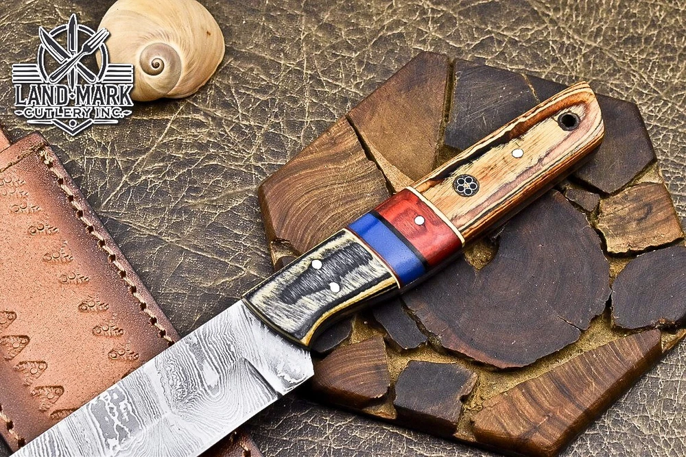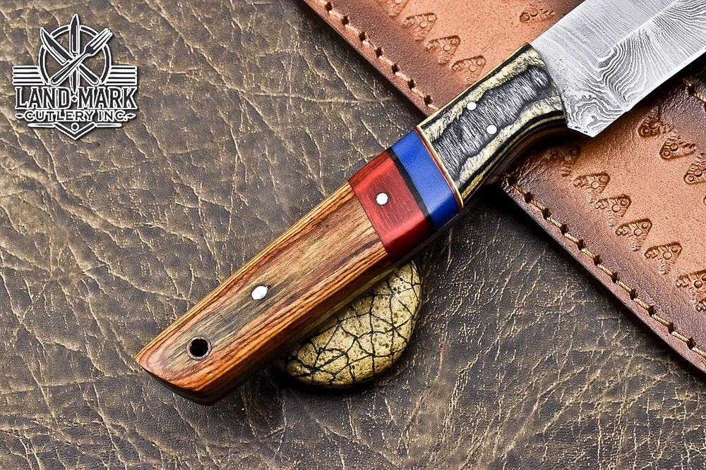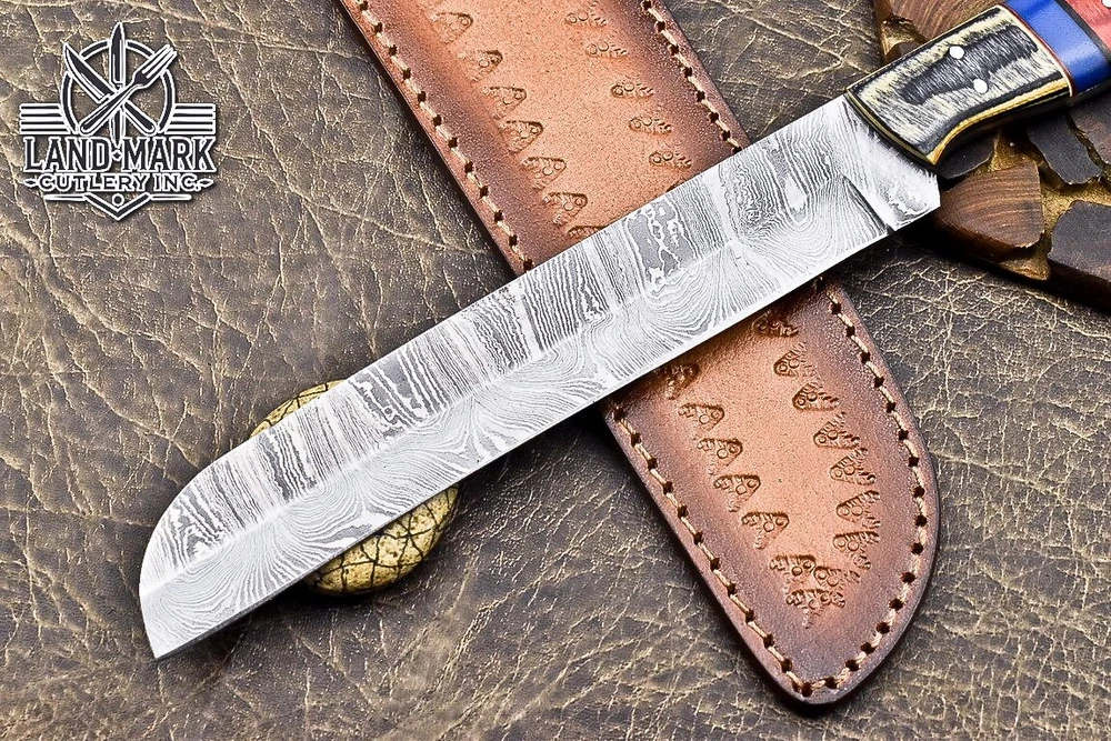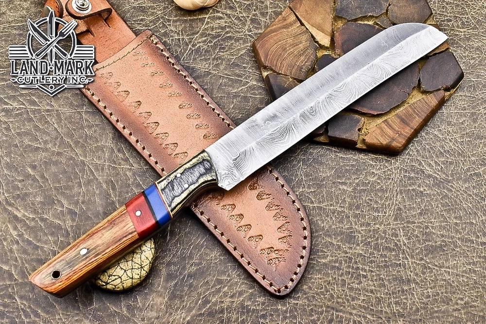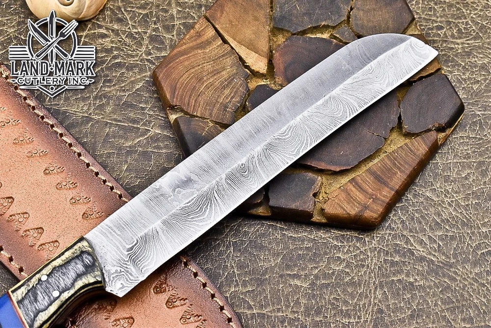 Custom Hand Made DAMASCUS STEEL KITCHEN CHEF KNIFE WITH PAKKA WOOD HANDLE We offer a shipping discount for More then one purchased . And discount will be apply on combine invoice, Discount will not apply on separate payment. ITEM DETAILS OVER ALL LENGTH 14.0 inches long (Approx) HANDLE LENGTH 5.0 inches long (Approx) BLADE LENGTH 9.0 inches long (Approx) BLADE HARDNESS 58-60 HRC Which Holds The Sharp Edge For Long Time. HANDLE PAKKA WOOD COVER LEATHER SHEATH This Awesome custom made KNIFE has a nice hand forged with the combination of 4340 & 1080 steel. HOW OUR DAMASCUS IS MADE: All our Damascus is real and not just an acid etch. Damascus is a mixture of 1080HC and 4340 nickel carbon. You heat them up together and then fold the bar over and over to get the desired layers, ours are 396 layers. Then you burn the blade in acid, and it turns the nickel satin color and the high carbon turns blackish gray. This is how the layers are exposed to show the layers of the new steel created coined "Damascus". All Damascus is acid etched to show the layers. If you high polish the metal it will be shinny satin like all steels. Only after you burn the sides of the blade with acid do you see the layers of the two steels. Makes sense? After we make our knives we high polish the handles and put an edge on the blade. The high polishing buffs off the acid burned layer of the handle, and the blade edge is sharpened and the acid burned edge becomes satin. You can re-burn the tang of the blade near the handles and the edge of the blade and it will show the layers once more. All our knives are hand made, durable and unique ***** YOU WILL RECEIVED THE SAME KNIFE Qality Standards Our Damascus blades are made from high quality non-stainless steels which rival or exceed any Damascus blade made from the 10 series with 4340. Our Damascus combination has taken years to perfect and has been tested under a variety of application which will offer professional performance in categories of toughness, strength (lateral stress) and edge honing and holding ability. In a 5 spot Rockwell test our blades will average near or close to 58 which offers a perfect balances between its toughness and strength.Our blades due to carbon content need to be regularly treated with wax and/or 3 in 1 oil to maintain its superior quality. Questions if you have any question feel free to send us message we aim to answer all questions within 24 hours Feedback If you are not satisfied with our service please contact us before leaving any negative or natural feedback. We will resolve all issues as quickly as possible. Disclaimer We are not responsible for any injuries associated with the use of our tools. Our products are intended for legal use only by responsible buyers. Therefore, we will not sell our products to anyone under the age of 18. Before bidding please check your country laws as some countries Custom don't allow this. If your purchase is held by Custom Authorities in your country/State we will not be responsible for that and no refund will be issued Shipping We offer a 20% shipping discount for More then one purchased . And discount will be apply on combine invoice, Discount will not apply on separate payment We ship within 24 hours after receiving complete payment but this can be delayed due to week ends or Governments and Religious Festivals . . This is beyond our control and we apologize for this inconvenience. Precautions Our Tools are very sharp so open and use them very carefully We are not responsible for any injuries associated with the use of our tools Tips to Care knife 1. NEVER STORE YOUR KNIFE FOR LONG TIME IN LEATHER SHEATH. 2. LEATHER CAN ABSORB WATER, WHICH WILL RUST THE KNIFE. 3. ALWAYS CLEAN THE BLADE AFTER USING WITH OIL OR WAX