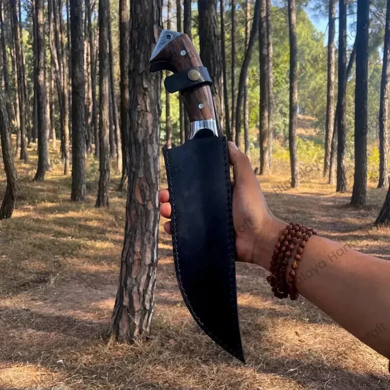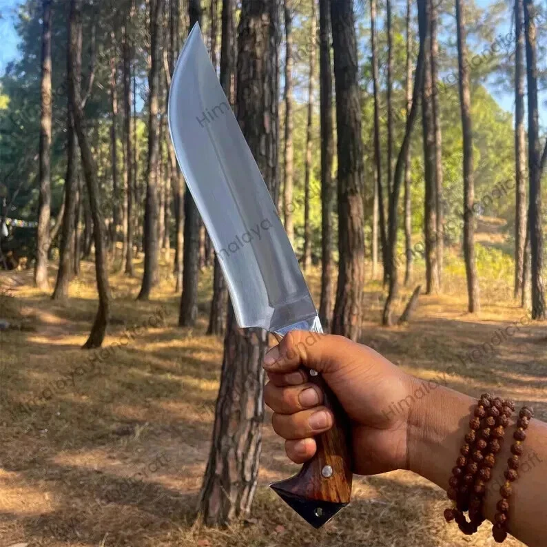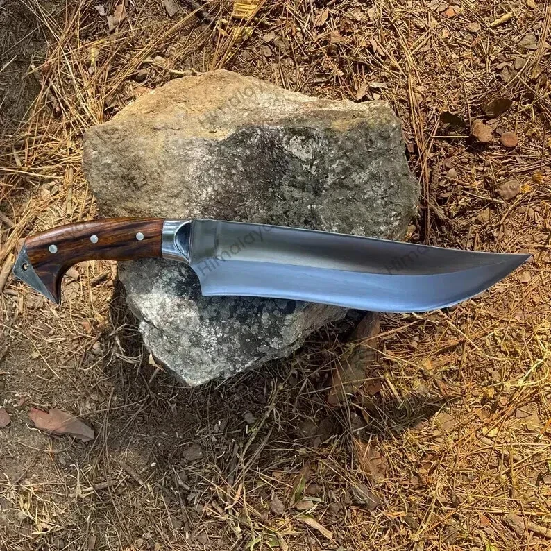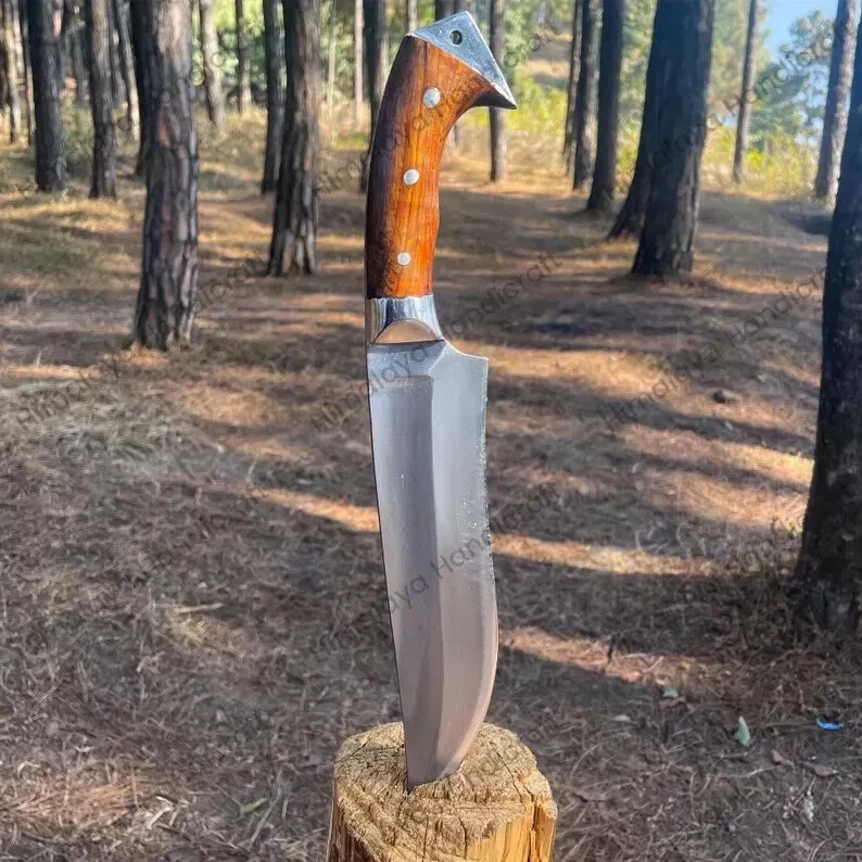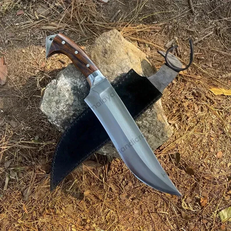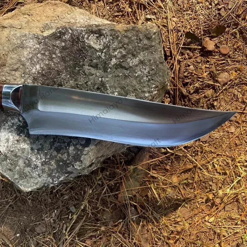 Item details Highlights Designed by Hafiz Crafts Supplies for making crafts Materials: Blade material: Carbon steel; Handle material: Wood ****Specifications: Blade Length: 10 inches Handle Length: 6 inches Whole Blade Length: 16 inches Blade Weight: 616 grams Whole Blade: 766 grams Belly Length: 2 inches This custom handmade Bowie knife is crafted by Hafiz Crafts in Pakistan, featuring a 10-inch carbon steel blade with a drop point design and a plain edge. The full tang construction ensures durability and strength for outdoor activities such as hunting, camping, and survival situations. The handle is made of wood and the knife includes a lanyard hole and sheath for convenient carrying. Ambidextrous in design, this silver-bladed Bowie knife is a high-quality and practical tool for collectors and outdoor enthusiasts alike.