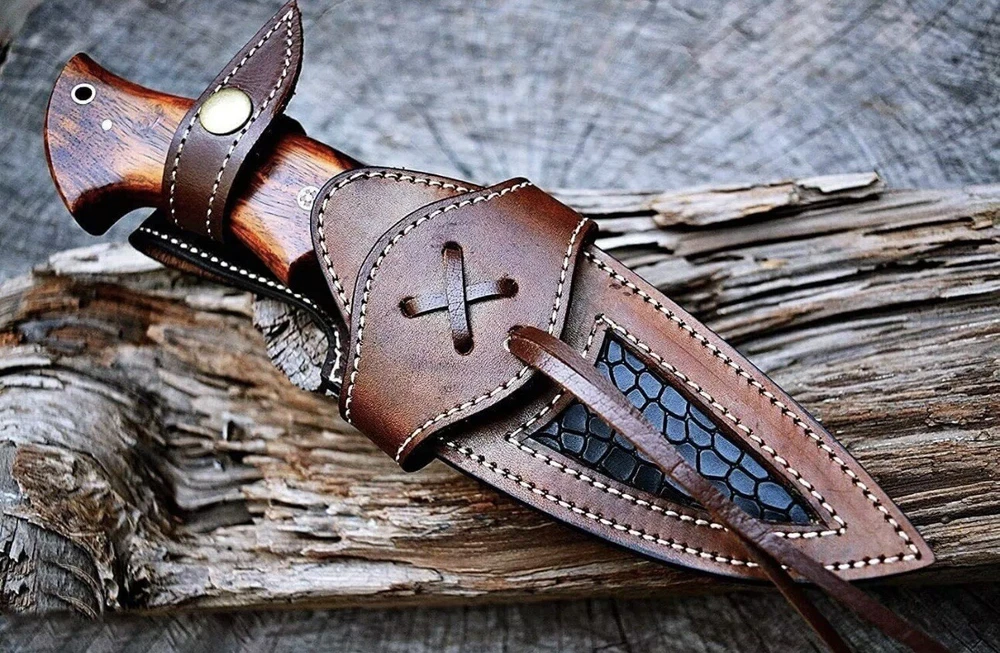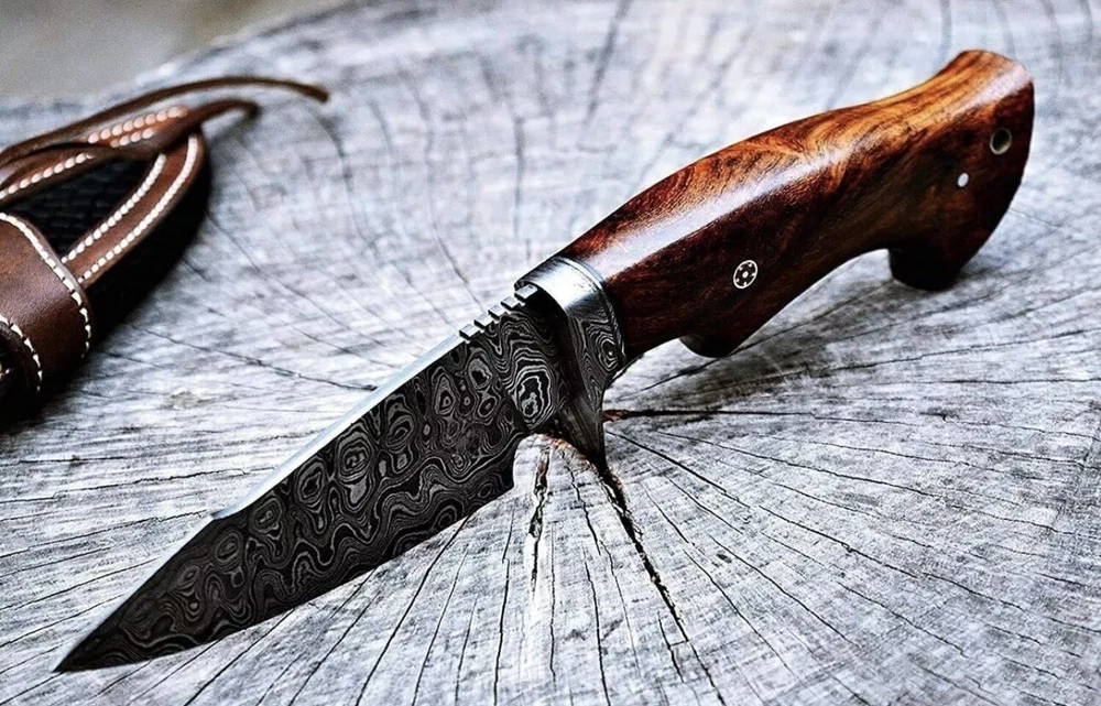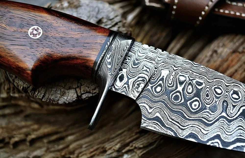 This custom handmade Damascus Steel Bowie Hunting Knife features a beautiful rose wood handle and a clip point blade made of high-quality Damascus Steel. The knife is over 5 inches in length and has a plain edge blade color. It is an original piece and was made in the United States. The knife comes with a sheath and features a hollow handle for added comfort and ease of use. This modern fixed blade knife is perfect for hunting and everyday use. The handle is made of wood and the knife is handmade, making it a unique and special addition to any collection.