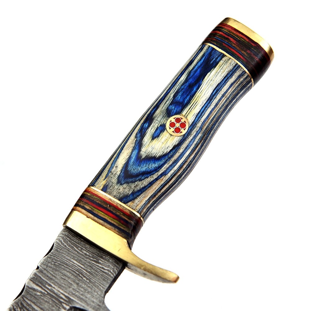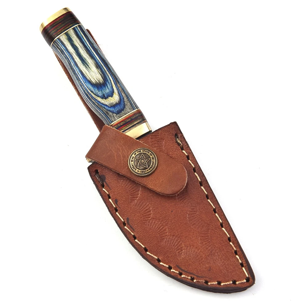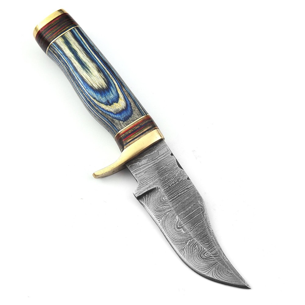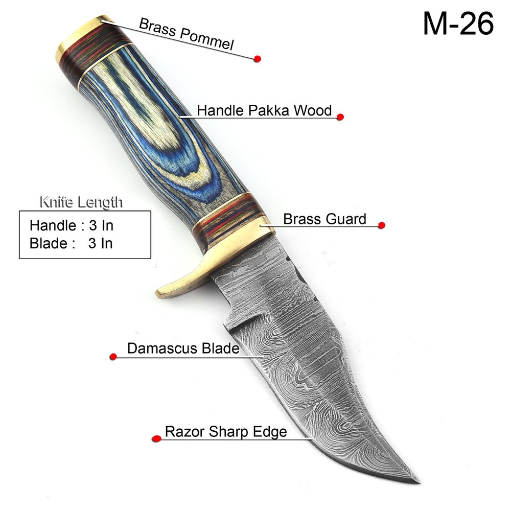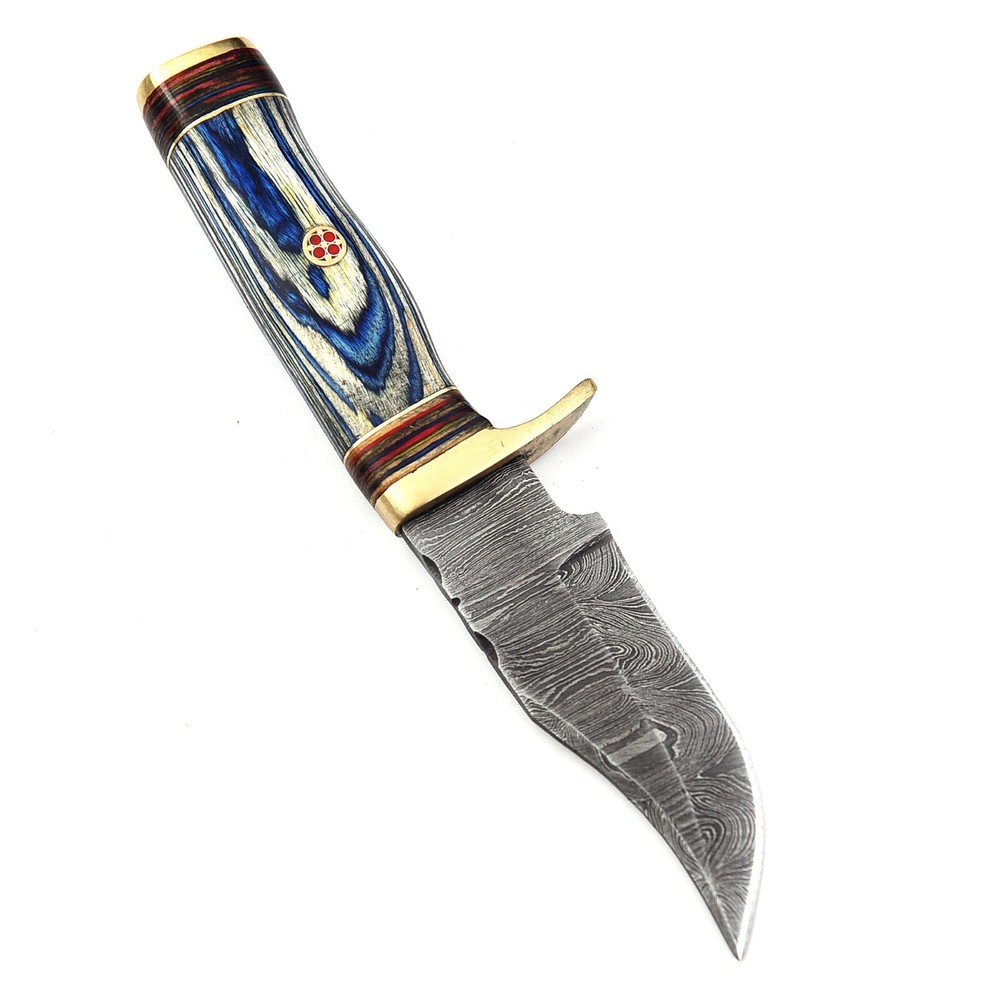 Custom Handmade Damascus Steel Skinner Hunting Knife KNIFE MATERIAL: Blade: Damascus Handle: Pakka Wood & Brass Pommal & Brass Guard KNIFE MEASUREMENT: Overall Length= 6" Blade Length= 3" Handle Length=3" Trendcutd knives are handmade you will get the same knife as in the photo. A slight difference can be there in color and patterns because these are handmade items and we use natural material. These knife have perfect grip sharp cutting edge which makes our knives more durable. Tips To Care For Knife: 1. Clean your knife with gasoline or Ethanol after use. 2. Apply oil on the blade after cleaning & using the knife. 3. Never store the knife in sheath for long time as it may dull the sharpness of knife over time. DISCLAIMER: If you have any issue regarding our products and services you can always contact us any time we will try to resolve your issue as quickly as possible. Best Regards, Trendcutd