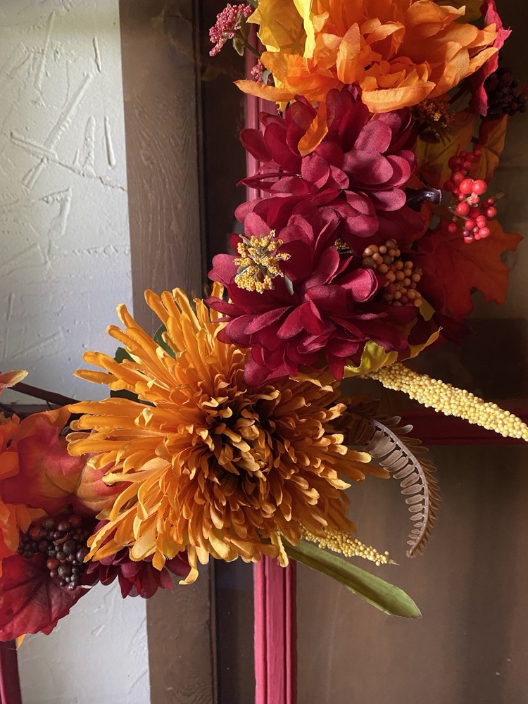 Beautiful fall wreath just made today. Bright fall colors with a couple of little pumpkins attached. Can be shipped out tomorrow.