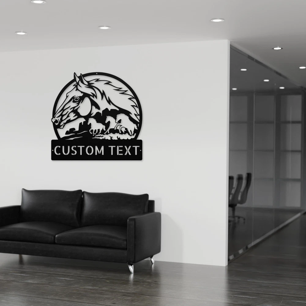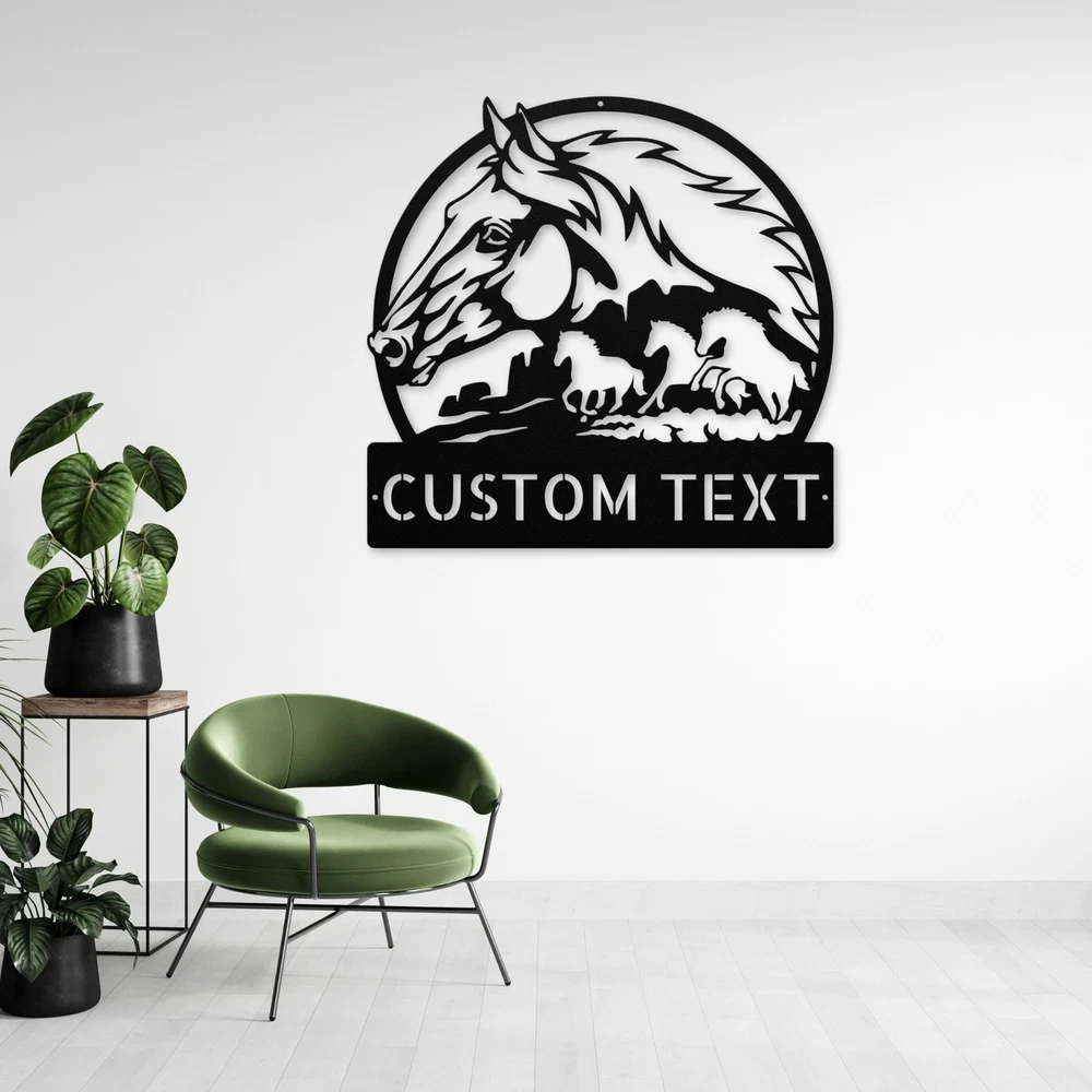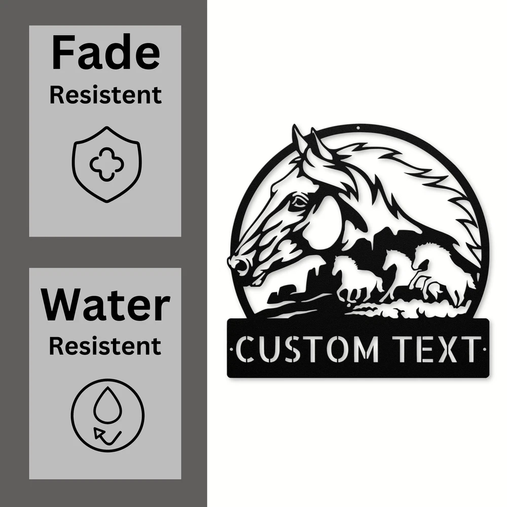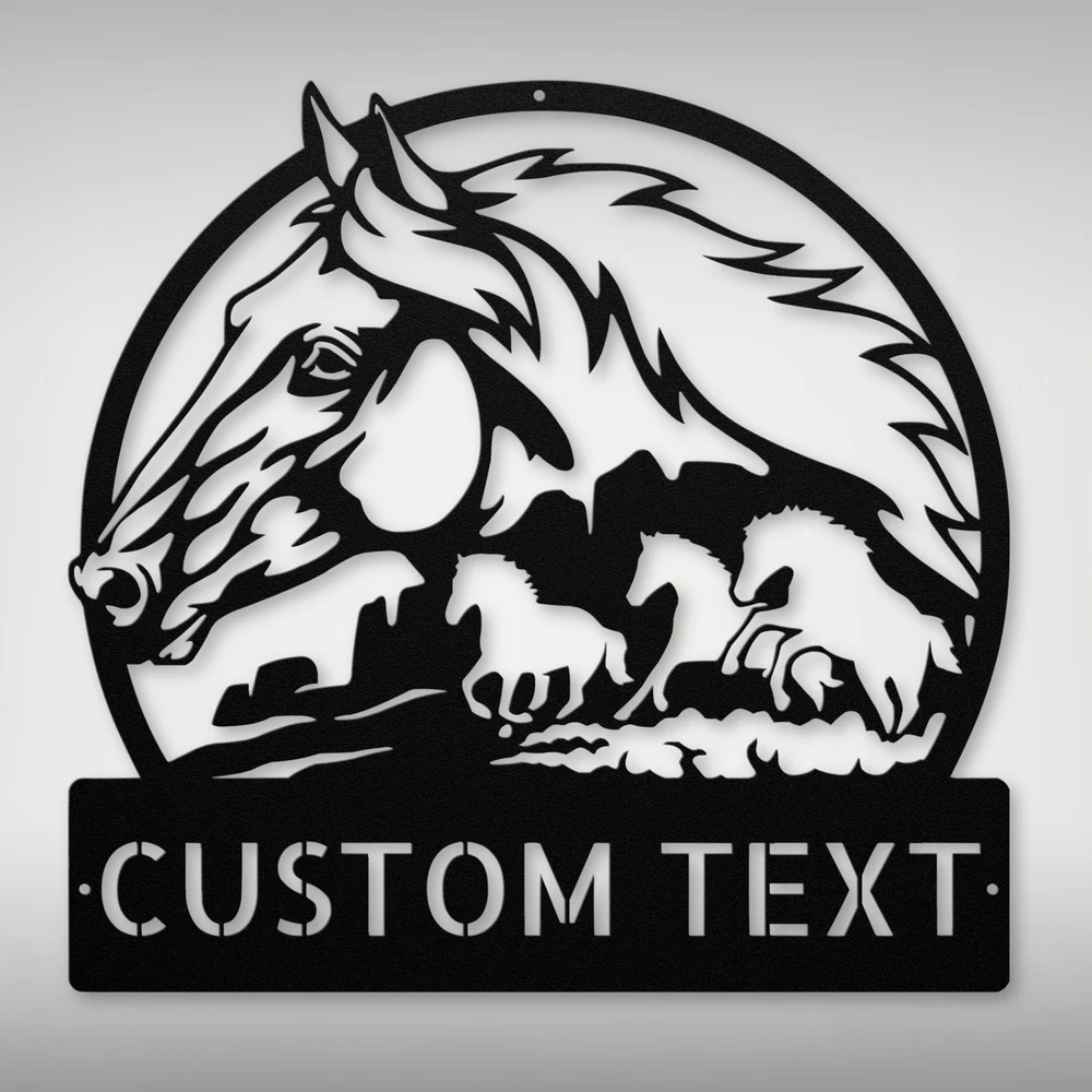 Product Description Custom Horses Metal Sign Perfect Wall Decor for Horse Lovers & Ranchers Celebrate your love for horses with our Custom Horses Metal Sign . This beautiful sign is designed for equestrian enthusiasts and adds a special touch to any home or office. Made from 16 gauge high-quality metal, it is built to last and withstand the test of time. The powder-coated finish ensures that this sign is not only stunning but also resistant to dust, weather, and moisture. Whether you hang it in your stable, living room, or garden, it’s the perfect way to showcase your passion for these majestic animals. You can customize the sign with your name or a special message, making it a unique piece of art that reflects your personality. This sign is an excellent gift idea for Christmas, birthdays, or any special occasion for horse lovers. It brings a warm and inviting atmosphere to any space, making it a thoughtful present for friends and family. Key Features: Customizable: Personalize with your name or a special message for a unique touch. Durable Construction: Crafted from high-quality 16 gauge metal for long-lasting use. Weather Resistant: The powder coating protects against dust, moisture, and fading. Versatile Decor: Ideal for homes, stables, offices, or as a gift for any horse enthusiast. Beautiful Design: Adds charm and character to any space, celebrating your love for horses. Enhance your decor with the Custom Horses Metal Sign and express your passion for horses in a stylish way! Service and Color Choice Our metal signs are designed to be personalized just for you, making them the perfect addition to any space! The default color for our signs is Black , but we also offer a variety of beautiful options including Copper, Gold, White, and Silver . After placing your order, simply contact us with your preferred color choice, and we'll ensure your sign is exactly how you envision it. Let’s create something special together!