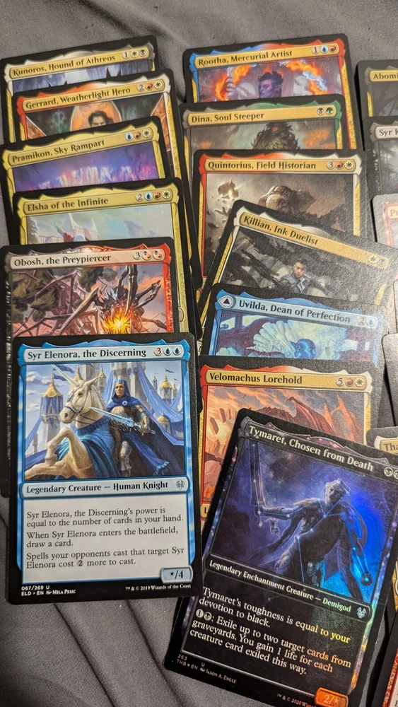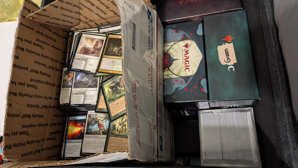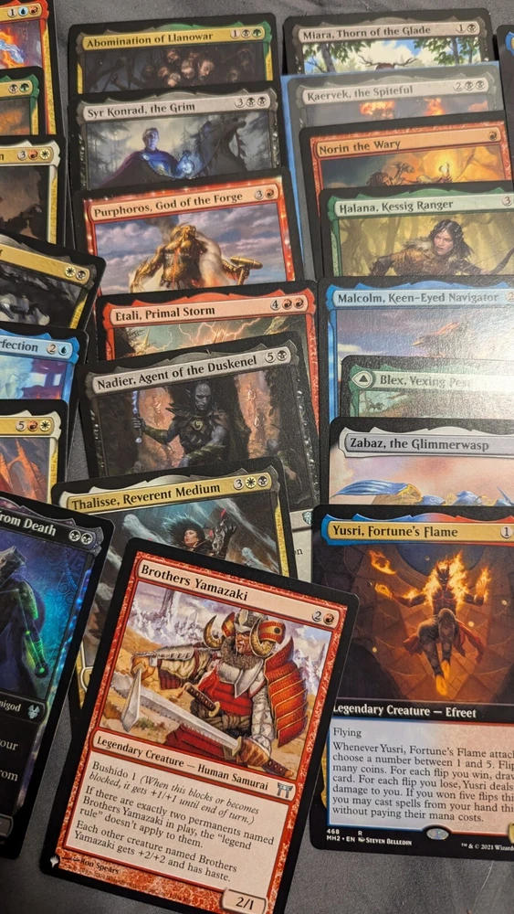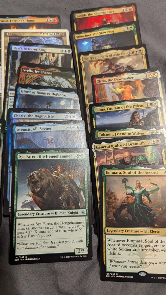 If you were to order a deck from me, I am going to make it the way I would play. I build every deck to your liking and I play test every deck before shipping. Sometimes I don't like how it plays and I'll rebuild it from scratch. My end goal is to make every deck as smooth and effective as I possibly can. I want you to have a good play experience with tons of table interaction and I want you to be satisfied with your purchase. I am by no means a great player. I just started a family and would like to give back to the world, so these decks are going to be created in a way that you can teach your kids with them, or just play them yourself. The reality is when someone creates a pre built deck it's made of cards that go well with the commanders. These lots will contains commons, uncommons, rares and foils. Truth be told if I have some decent mythics that I believe will benefit the deck, then I will put those in there too. I'm not trying to rip anybody off, though that is what a lot of sellers do. I am only trying to sell the cards I have been collecting and stocking piling for the better part of 10 years. You are guaranteed to get at least a 100 card deck consisting of commons/uncommons/rares and as I stated above, mythics if I feel they are beneficial(they probably will be) I'll most likely put 10-30 extra cards that you can swap out just as a thank you gift for purchasing. PLEASE be patient with me afterwards, I do have a full time job and I would like to take time in building the decks to make sure that you are getting the best deal possible. The pictures I have posted only show a fraction of the cards I have If you have any questions or concerns about how I build and construct decks, please feel free to reach out and ask. I am a relatively easy going guy and I'll be more than happy to answer them. If you are willing to pay a little extra, I am willing to put higher priced cards in.