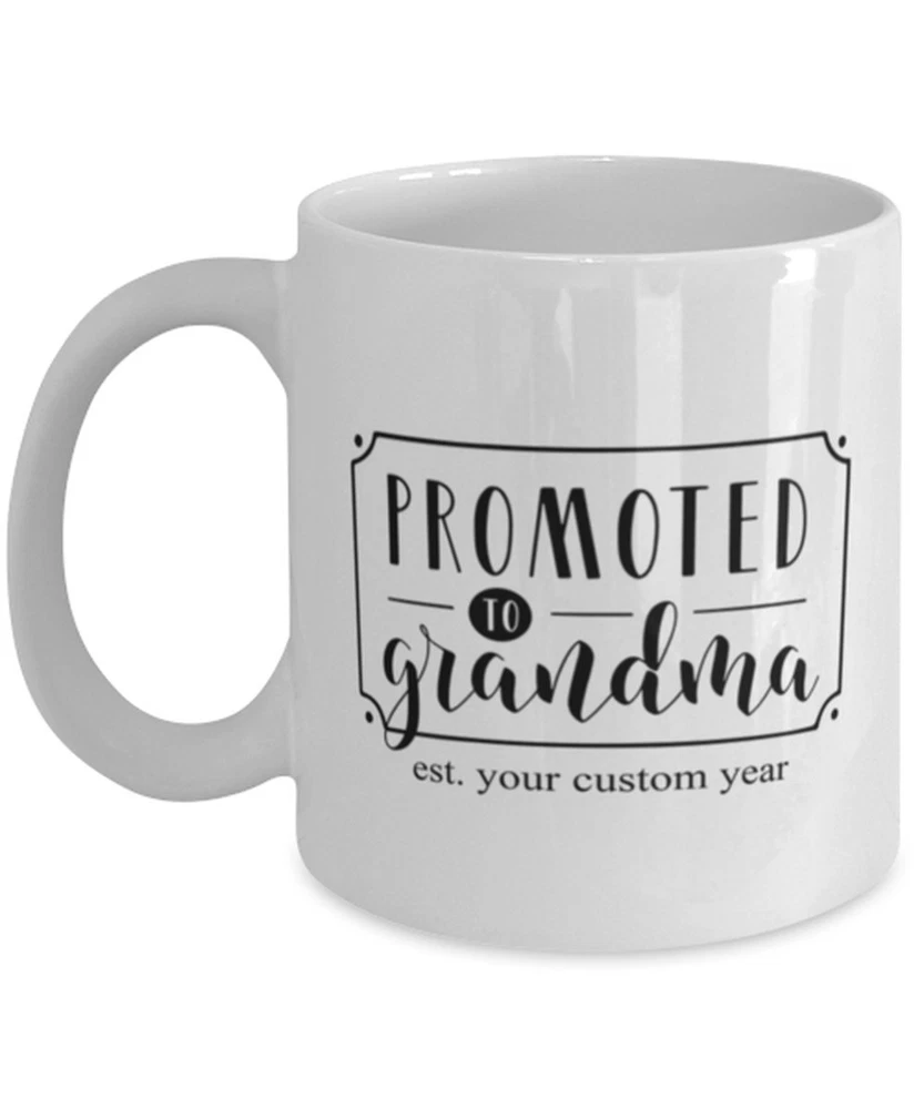 Custom New Grandma Coffee Mug Promoted To Grandma Est Personalized Year New Product Details.. This high quality 11oz. ceramic white mug has a premium hard coat that provides crisp and vibrant color reproduction sure to last for years. Perfect for all hot & cold beverages. The highest quality printing possible is used. It will never fade no matter how many times you wash it. Material: 100% Ceramic. Print both sides. Dishwasher and Microwave Safe. High Gloss + Premium White Finish. Printed in the U.S.A. Personalized & Custom. We support personalized and custom mug to add custom, when placing an order, you can add notes to the "order note" in shipping address section. Also you can contact us directly via message. Shipping Info. Ready to ship in 1 to 2 business days, All products are made-to-order and proudly printed in the United States. Shipped by USPS and DHL, You will receive your order in 5-7 days. Replace & Refund. All products are defective during shipping broken, chipped will be replaced free of charge. You are not satisfied with the product, we will refund 100% money to you. If any other issues arise, please do not hesitate to message, we would be more than happy to assist you.