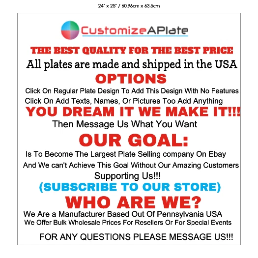 Welcome to customizeaplate Home About us Returns Delivery Bulk wholesale Contact Us HAVE A QUESTION? - Click to find out more Feedback Add to Favorite Seller Join Mailing List CATEGORIES Home Design Plate License Plates Signs Dog Tags Keychains Others Fast Delivery on All Items 100% Satisfaction Guaranteed TOP Quality products Only Product information DESIGN YOUR OWN LICENSE PLATES, SIGNS, KEYCHAINS, AND MORE!! Click on the Image to Enlarge Description CUSTOMIZE ANYTHING! ADD YOUR NAMES, ADD YOUR PICTURES BE CREATIVE! YOU CAN ALSO ADD NAMES TO DESIGNS THAT WE ALREADY HAVE MADE! 6" x 12" automotive high gloss metal license plate. Made of the highest quality aluminum for a weather resistant finish. It is lightweight and durable. Pre-drilled holes for quick and easy mounting on any vehicle, or add a ribbon, wire or string to instantly turn this license plate into a sign and display it on a wall or door. Individually shrink-wrapped and proudly made in the USA. NEED MORE LICENSE PLATES OR SIGNS? BULK WHOLESALE AVAILABLE MESSAGE US FOR MORE DETAILS! THE BEST QUALITY FOR THE BEST PRICE IS WHAT WE PROVIDE TO OUR CUSTOMERS! Payments: Due immediately. Payment accepted only from a verified PayPal Account. PLEASE CONTACT US FOR ANY QUESTIONS OR CONCERNS! FOR MORE PRODUCTS VISIT OUR EBAY STORE! Shipping All Deliveries will be Shipped within 1-2 business days excluding weekends! Returns All refunds must be made within 14 business days. About us We are here to Provide our Customers with 100% Satisfaction. Our goal is to make every person extremly happy! Having our own Manufacturing Facility means we have alot of inventory! And we can Design anything you want! Join Our Exclusive Newsletter For Up To Date News, Special Offers And New Arrivals Sign up Now Shop Categories Design Plate License Plates Signs Dog Tags Keychains Quick Links Feedback Add to Favorite Seller Shop info Home About us Returns Delivery Contact Us Get in touch with us customizeaplate Scranton Pennsylvania United States Payment info Copyright 2019 customizeaplate. All Rights Reserved