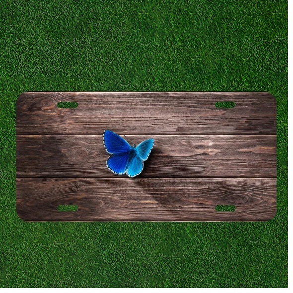 Custom Personalized Auto Tag With Blue Butterfly On Wooden Pattern Design