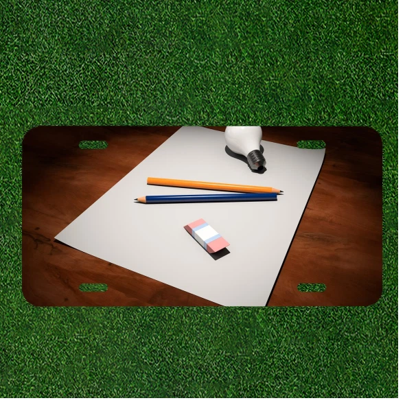 Custom Personalized Auto Tag With Paper Pencils And Eraser On Paper Design