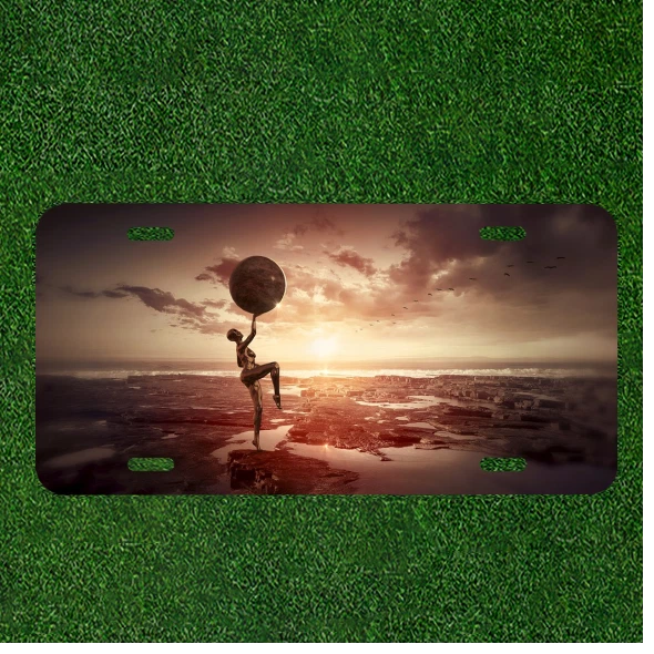 Custom Personalized Auto Tag With Person Holding Globe By Amazing Sunset