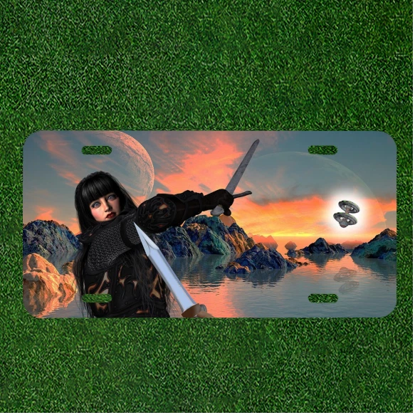 Custom Personalized Auto Tag With Women With Sword With Aliens Design