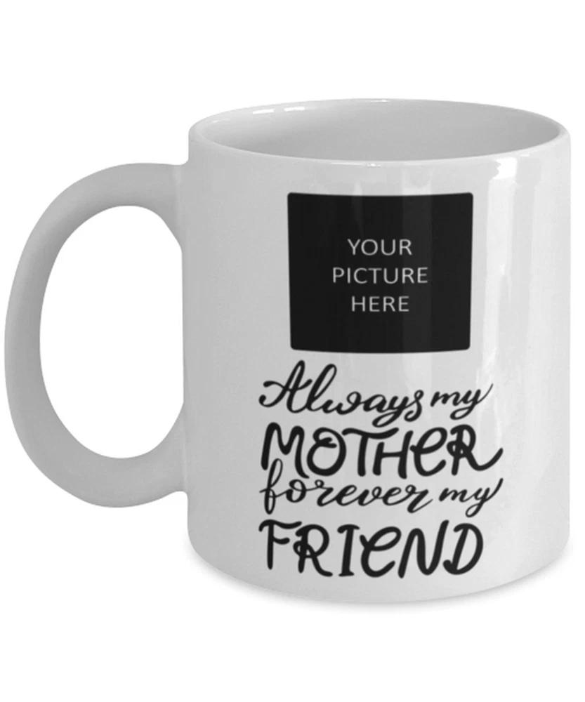 Custom Photo Mom Coffee Mug Always My Mother Forever My Friend Gift From Product Details.. This high quality 11oz. ceramic white mug has a premium hard coat that provides crisp and vibrant color reproduction sure to last for years. Perfect for all hot & cold beverages. The highest quality printing possible is used. It will never fade no matter how many times you wash it. Material: 100% Ceramic. Print both sides. Dishwasher and Microwave Safe. High Gloss + Premium White Finish. Printed in the U.S.A. Personalized & Custom. We support personalized and custom mug to add custom, when placing an order, you can add notes to the "order note" in shipping address section. Also you can contact us directly via message. Shipping Info. Ready to ship in 1 to 2 business days, All products are made-to-order and proudly printed in the United States. Shipped by USPS and DHL, You will receive your order in 5-7 days. Replace & Refund. All products are defective during shipping broken, chipped will be replaced free of charge. You are not satisfied with the product, we will refund 100% money to you. If any other issues arise, please do not hesitate to message, we would be more than happy to assist you.